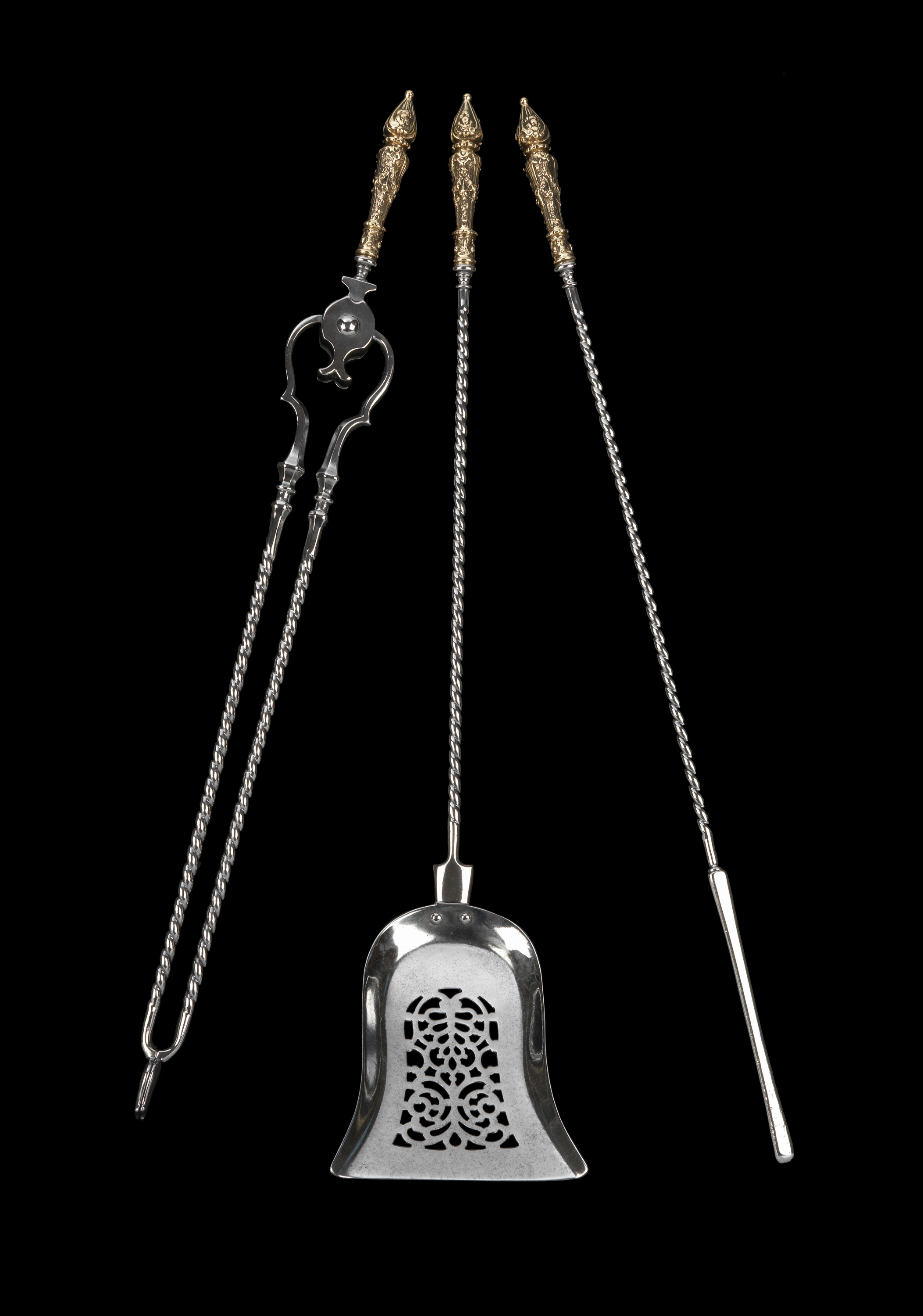With elaborate foliate and scrolled brass finial handles with scrolling stems.