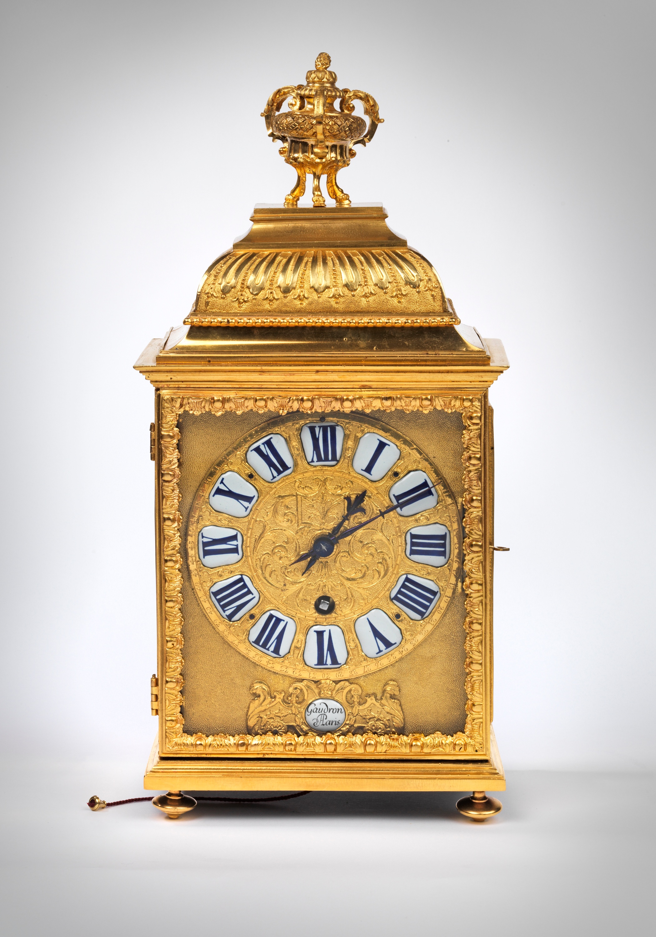 The signature Gaudron à Paris appeared as early as 1660 on clock movements produced by the workshop of Antoine Gaudron, but little is known today about this clockmaker. His works were both admired by colleagues and collected by the French nobility. An examination of Gaudron's will shows that he was successful and prosperous, leaving substantial dowries to his three children and a house pleasantly furnished with numerous pieces of costly Chinese porcelain.