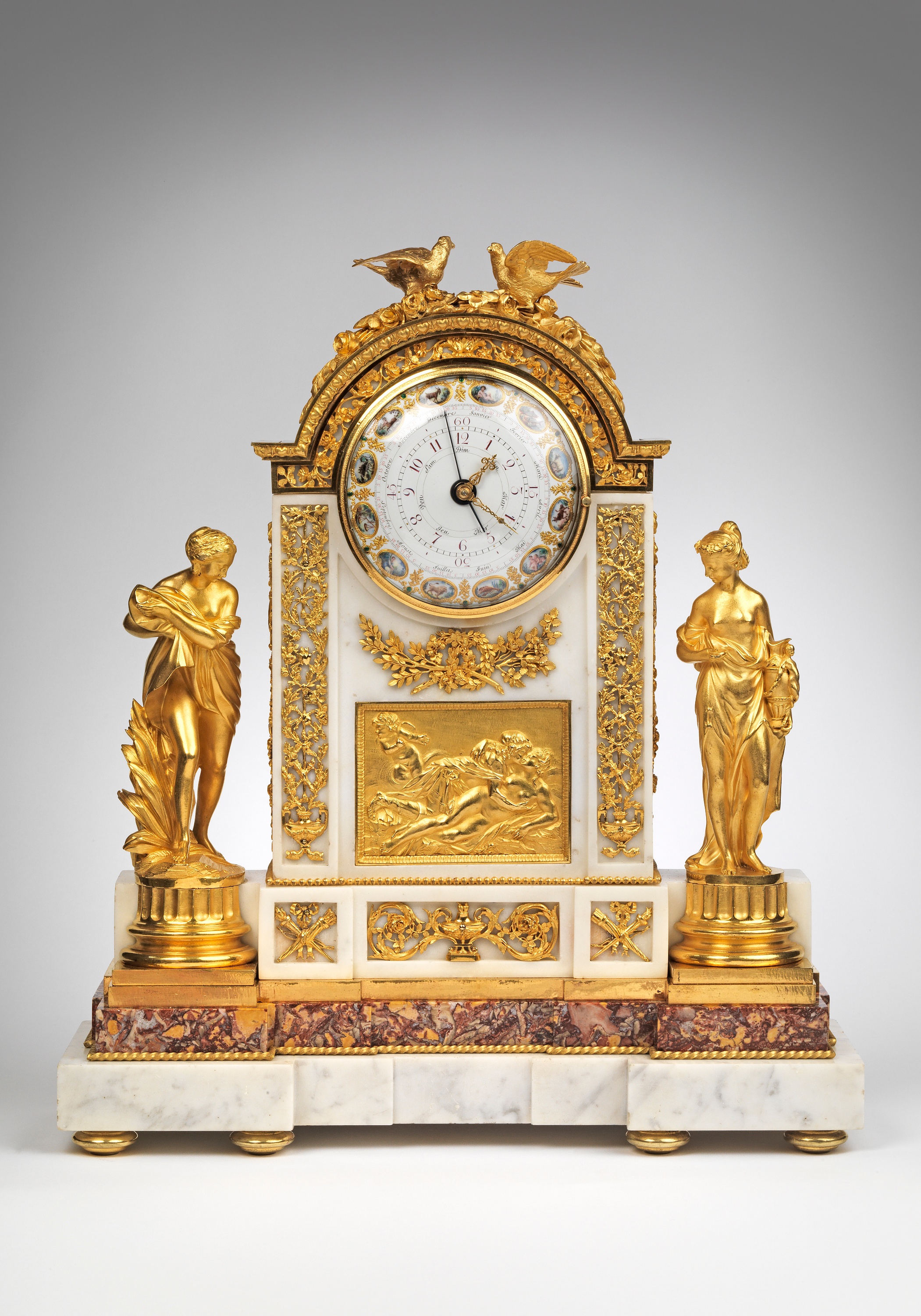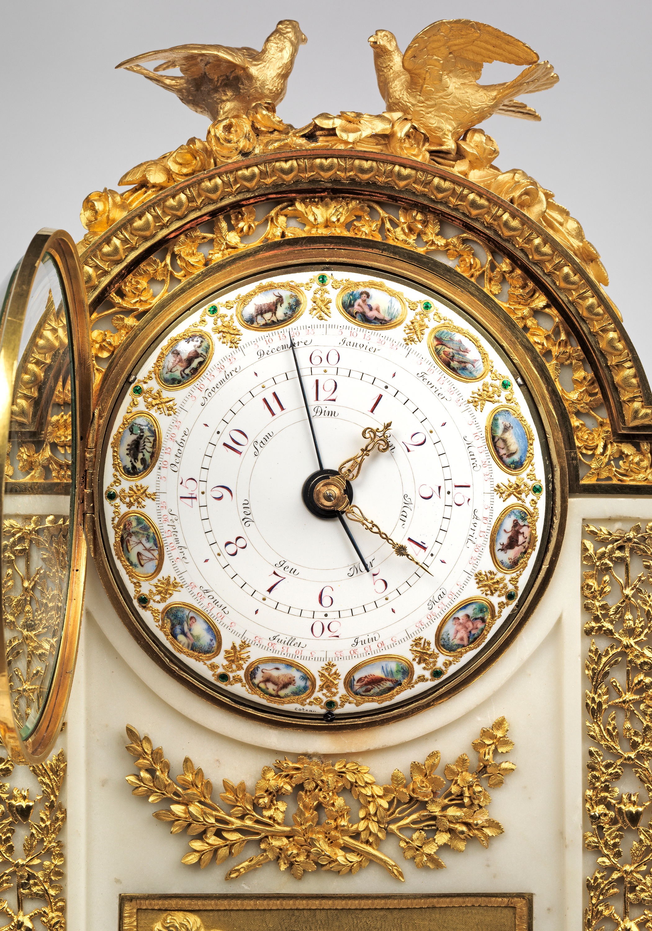 With exceptional dial with Zodiac symbols done in extraordinary detail framed by raised gilt decorative elements divided by a very small green enamel star. The movement with hands showing the time, the day of the month and the day of the week. The case flanked by two gilded bronze statuettes of nymphs in the taste of Etienne-Maurice Falconet. On a Spanish Broccatello base above a Carrara marble supported on six domed feet. Written on the back of the dial “Coteau f Xbre 1777 indicating that it was made in October 1777.