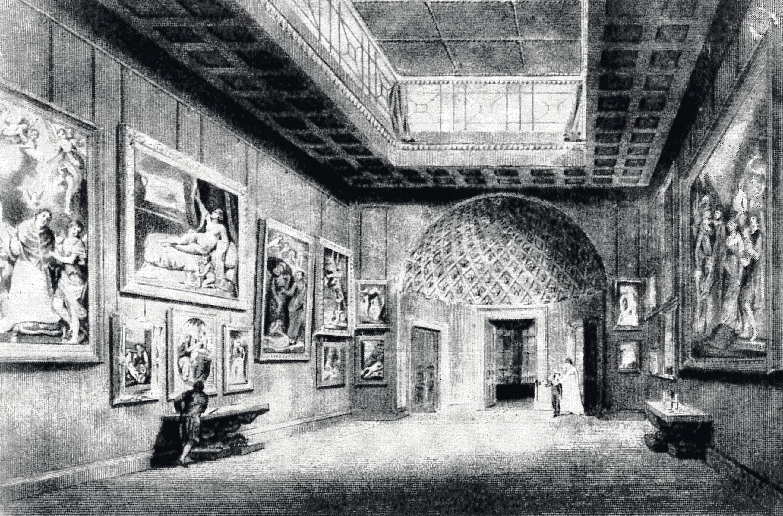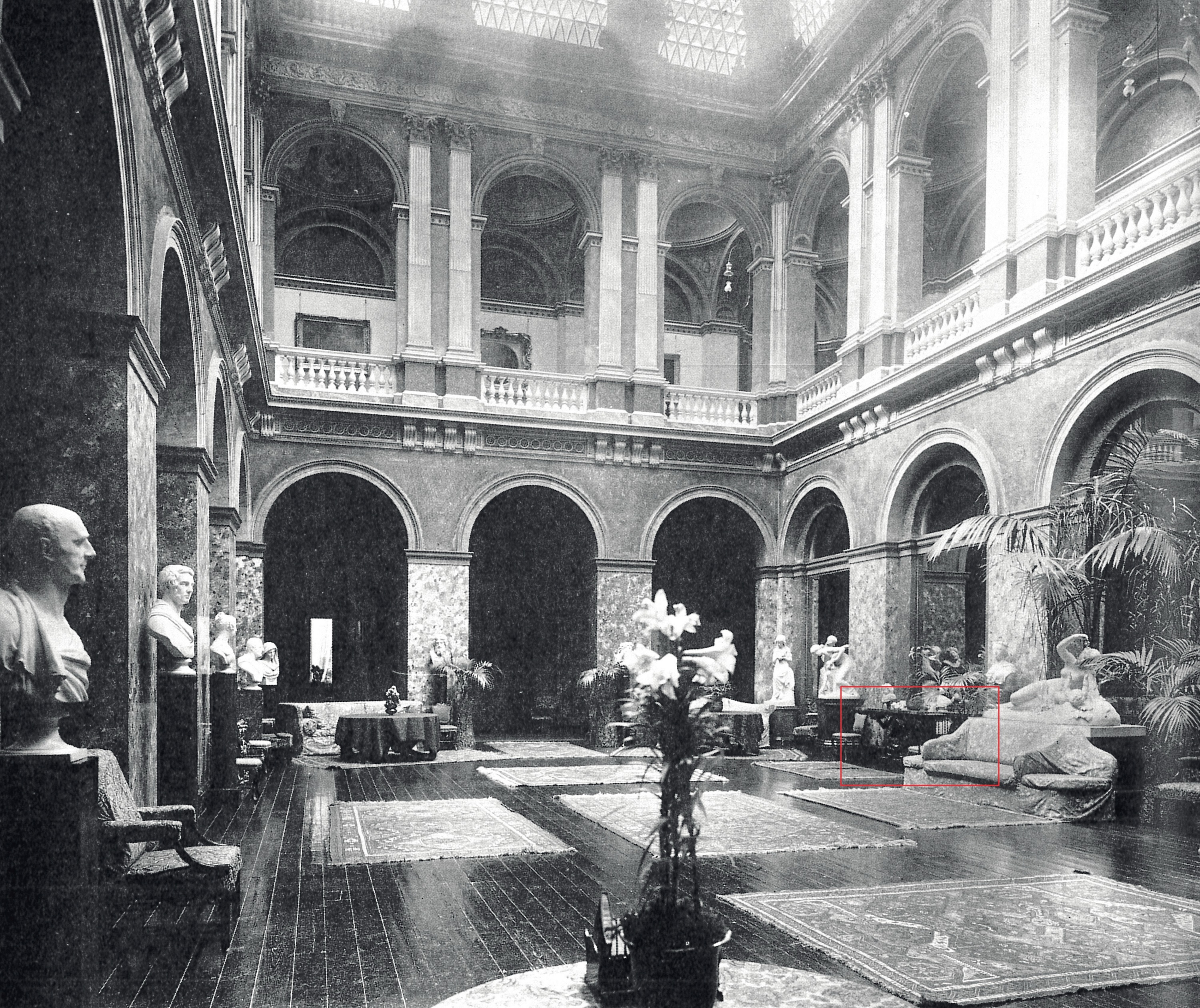 Cleveland House was entirely rebuilt in a rigidly neo-classical style in the 1790s for Frances Egerton, 3rd and last Duke of Bridgewater (d. 1803). His nephew, Earl Gower, Marquis of Stafford, inherited the house, continued the restoration, and added to the remarkable picture collection acquired by his uncle, which included the Trumbull collection, and some of the spectacular Orléans collection, and he subsequently opened the house to the public. Part of the collection was housed in the specially commissioned ‘New Gallery’ or ‘Picture Gallery’ designed by C.H. Tatham in 1803-6 with a coffered ceiling inspired by the Temple of Venus. In 1818, the paintings were the subject of a scholarly four-volume catalogue edited by W.Y. Ottley, and two of the large tables from the set were illustrated in an engraved plan, and view of the gallery; the latter by J.C. Buckler dated 1808 (Herrmann, op. cit., p. 103, fgs. 2-3). In 1844, Mrs. Jameson described the decoration of this room in her Companion to the Most Celebrated Private Galleries of Art in London, ‘The picture gallery is not only the most magnificent room in London but is also excellently adapted to its purpose, in the management of the light, and the style of decoration. There is no colour but the dark rich crimson of the furniture, the walls being of a creamy white’ and undoubtedly referred to the two in situ giltwood tables, ‘the ornaments of dead and burnished gold’ (op. cit.). The gallery was subsequently redesigned by Sir Charles Barry (d. 1860), and rebuilt in 1846, for Lord Francis Egerton (created Earl of Ellesmere in 1846), who inherited Cleveland House on the death of Lord Stafford. At this time, the pair of large tables were moved to the central hall of the house where they were photographed in the late 19th century (Pearce, op. cit., p. 135).