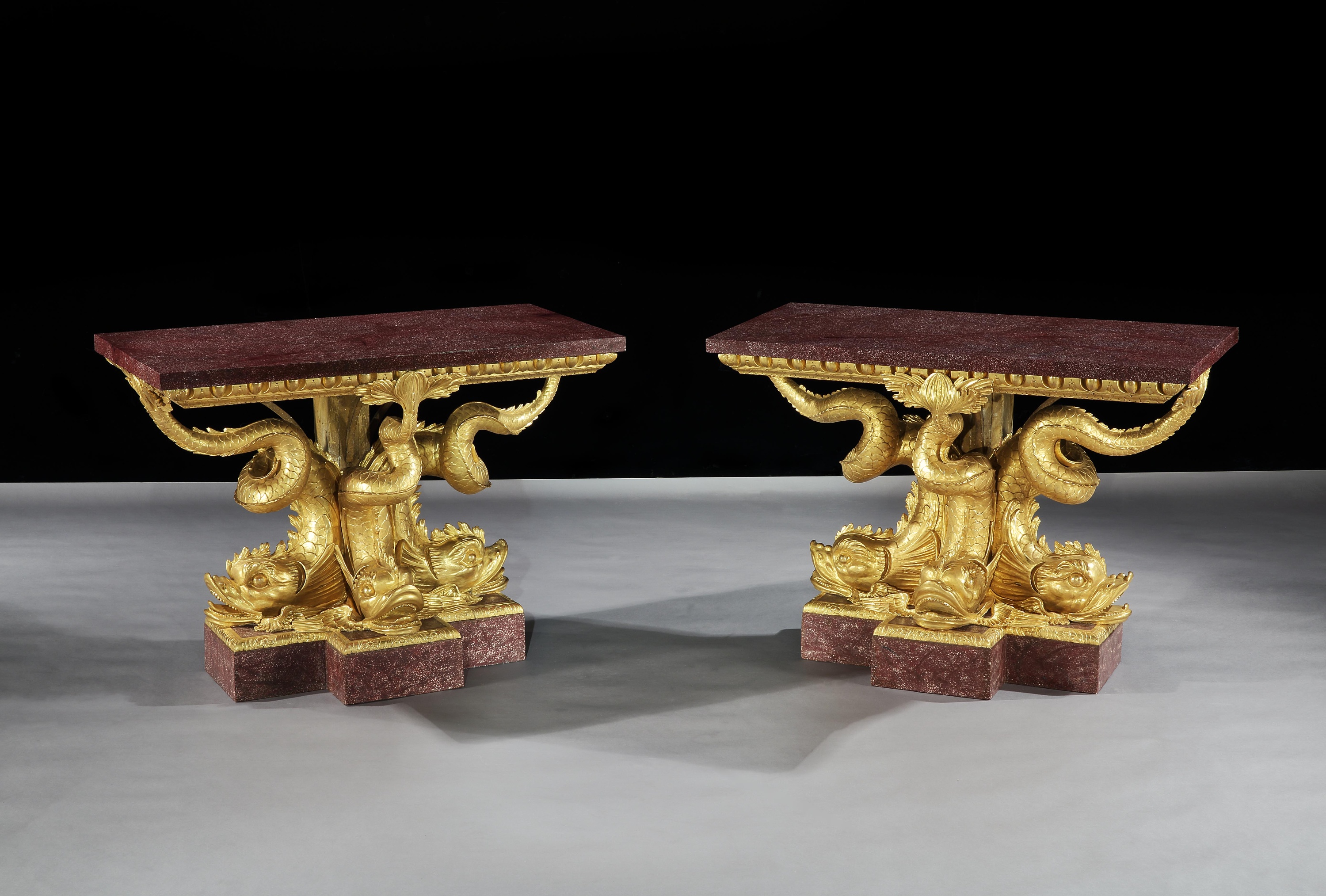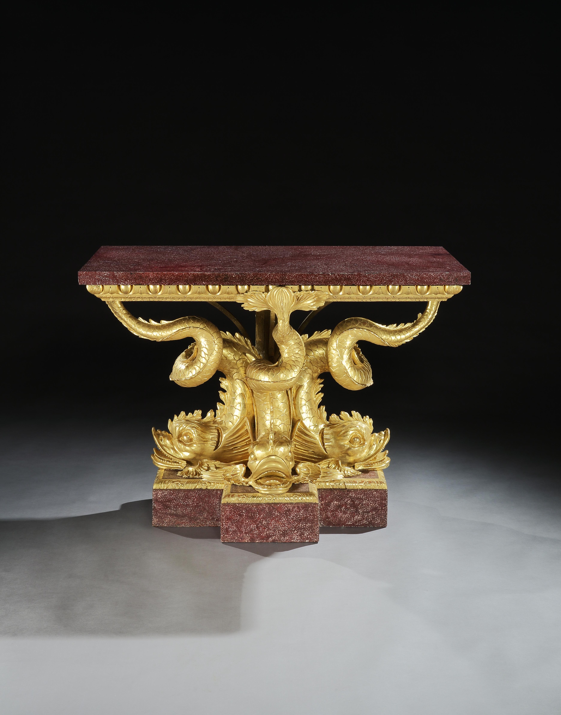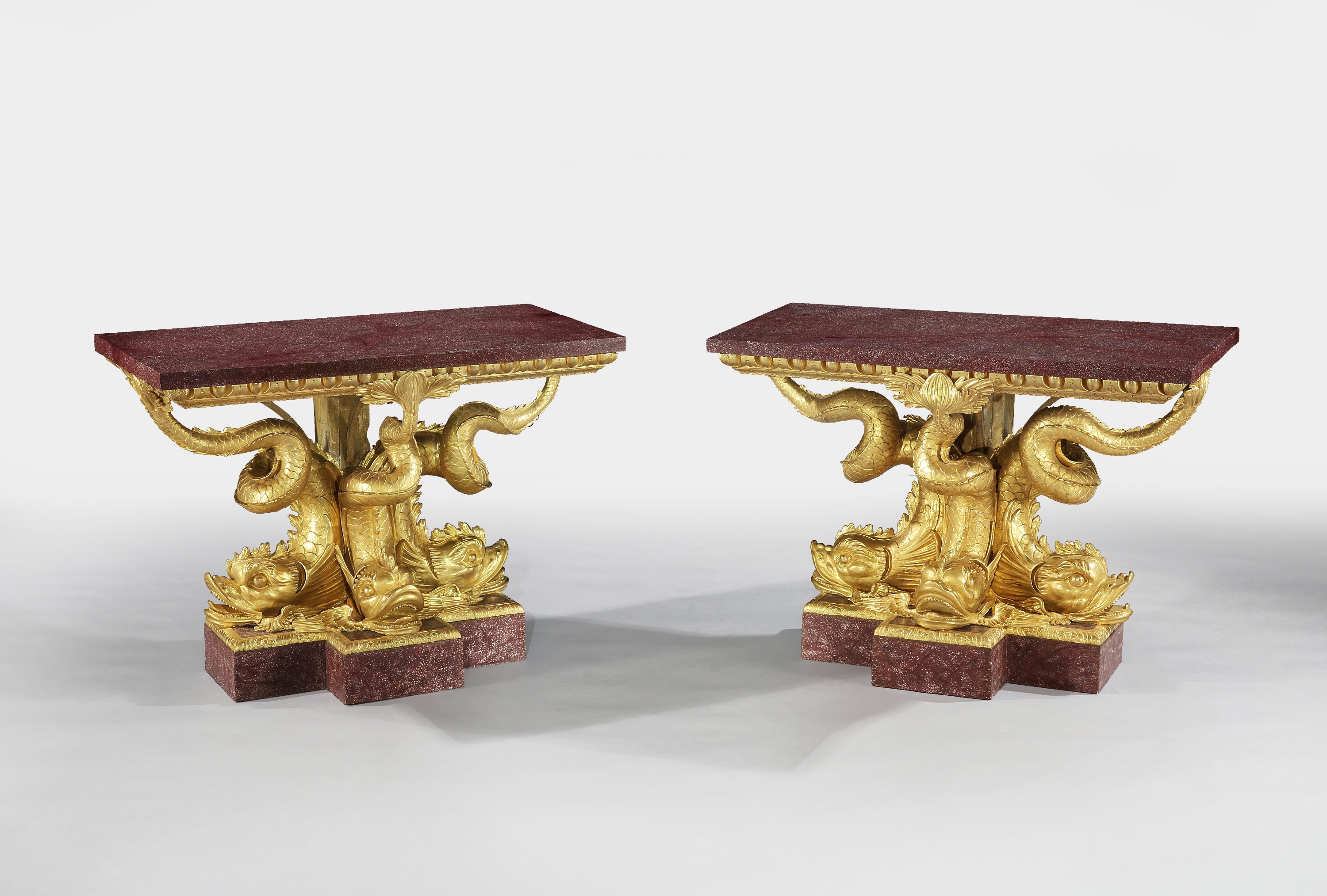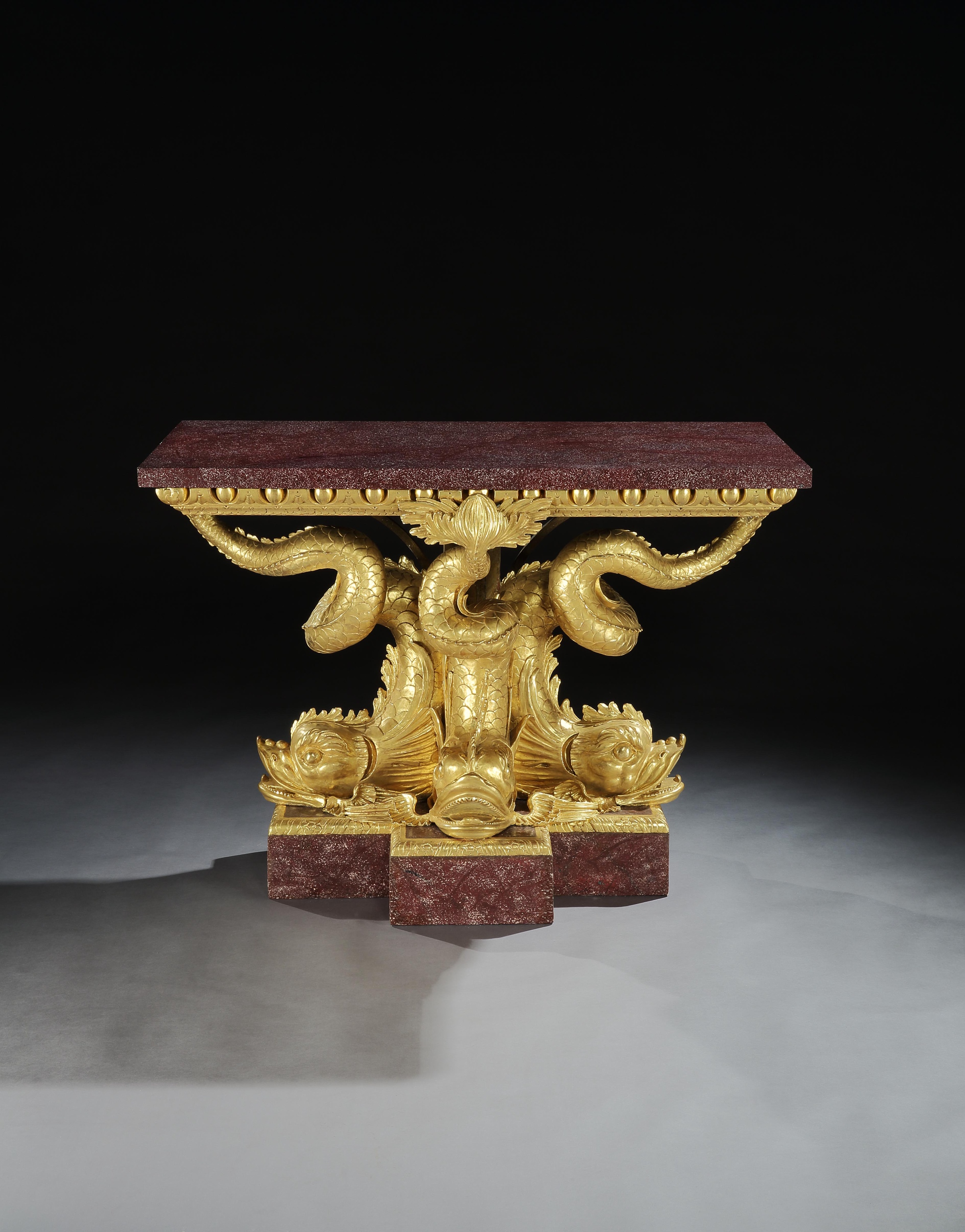 This magnificent pair of giltwood side tables, part of a set of at least twelve, was supplied in circa 1803-6 to George Granville Leveson-Gower, Marquess of Stafford, later 1st Duke of Sutherland (d. 1833), for the ‘New Gallery’ at Cleveland House, St. James’s (later Bridgwater House) by Marsh & Tatham, cabinet-makers to George, Prince of Wales (d. 1830). The interlaced dolphin supports were almost certainly inspired from drawings by Charles Heathcote Tatham (d. 1842), which in turn derive from antiquity. John Cornforth notes that the frames were made to support some of the marble slabs which had been purchased in Italy in the 1750s by the Duke of Bridgwater for Ashridge, but remained in their packing cases (Cornforth, op. cit., pp. 1471-1472). The beauty of the marble, of various types and differing dimensions undoubtedly determined Lord Stafford to engage Marsh & Tatham to furnish appropriate ‘antique’ bases in which to display the magnificent 18th century Roman marbles slabs he had inherited.