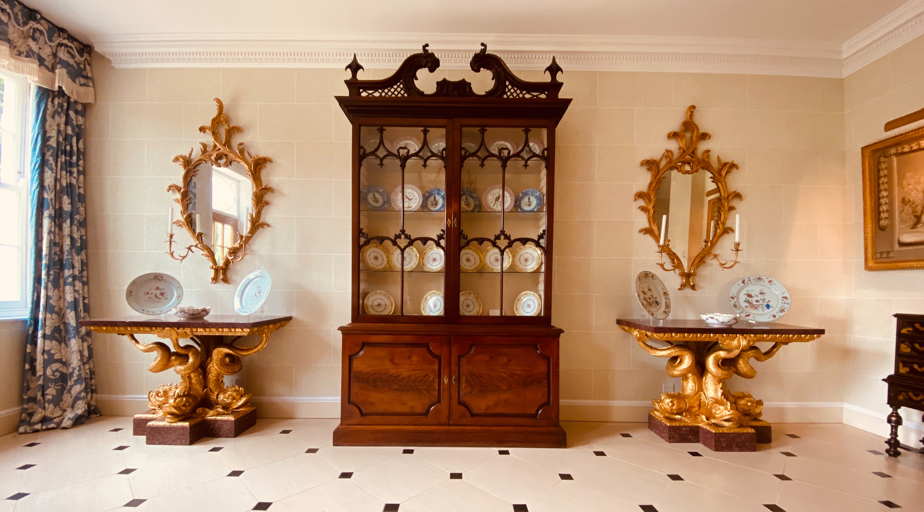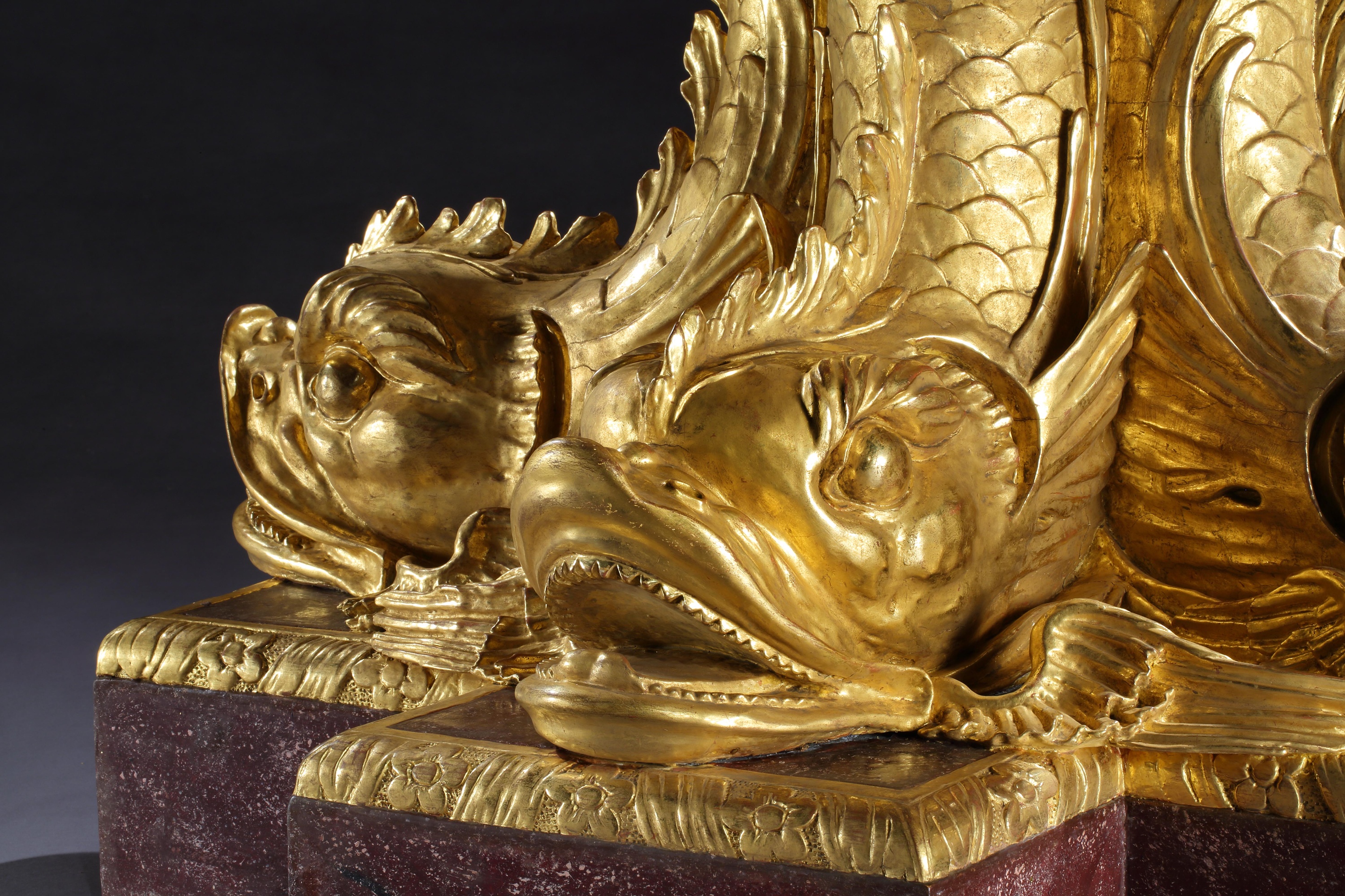 The fashion for dolphin ornamentation underwent a revival in the early 19th century. Another celebrated suite of dolphin furniture was made by William Collins, and presented to Greenwich Hospital in 1813 by the widow of Mr. John Fish, in memory of Lord Nelson, now exhibited at the Brighton Pavilion (Jourdain, op. cit., p. 73, fg. 156). Further, a centre table with dolphin supports is illustrated in Ackermann’s Repository, vol. 8. Elward, Marsh & Tatham (the former name of the firm) also supplied a magnificent suite of seat-furniture in circa 1797-99 totaling £3000 for the Music Room, Powderham Castle, Devon that has closely related arm-supports in the?form of dolphins.