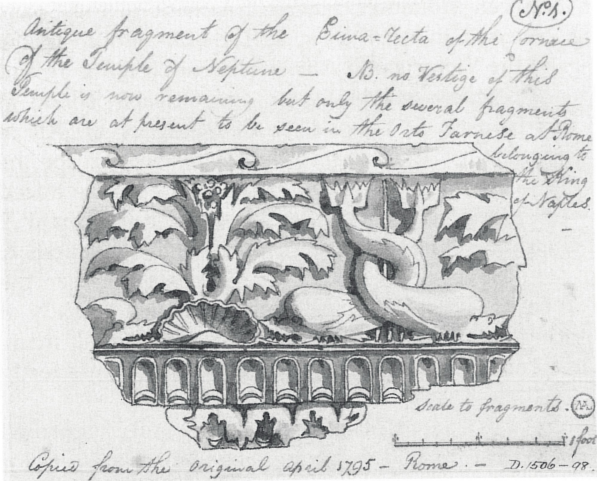 C.H. Tatham’s inspiration for the interlaced dolphin supports of the present table, and the remaining set, almost certainly derives from antique marble fragments he illustrated in pen and ink drawings while on his Grand Tour from 1794-96. On his return, the drawings were published in Etchings of Ancient Ornamental Architecture drawn from the Originals in Rome, an important source book for neo-classical decoration and furniture based on the results of excavations at Pompeii, Herculaneum, Tivoli and Rome; the 1806 edition was dedicated to Lord Gower suggesting he was one of Tatham’s most important patrons in this period, and interestingly the date corresponds to when the set of tables was supplied by Marsh & Tatham. Tatham was fascinated by the dolphin motif as evident in the number of drawings and etchings he made; a pair of interlaced dolphins, a fragment from the cornice of the Temple of Neptune from the Orto Farnese, Rome, features in a drawing dated April 1795, now in the Victoria & Albert Museum collection (Buckrell Pos, op. cit., p. 68, fg. 7). Henry Holland, the Prince of Wales’s architect in the alterations of Carlton House and the Brighton Pavilion, employed and sponsored Tatham on his Italian tour to act as his agent in the purchase of antiquities and casts with which to furnish Carlton House, and to study and illustrate classical remains.