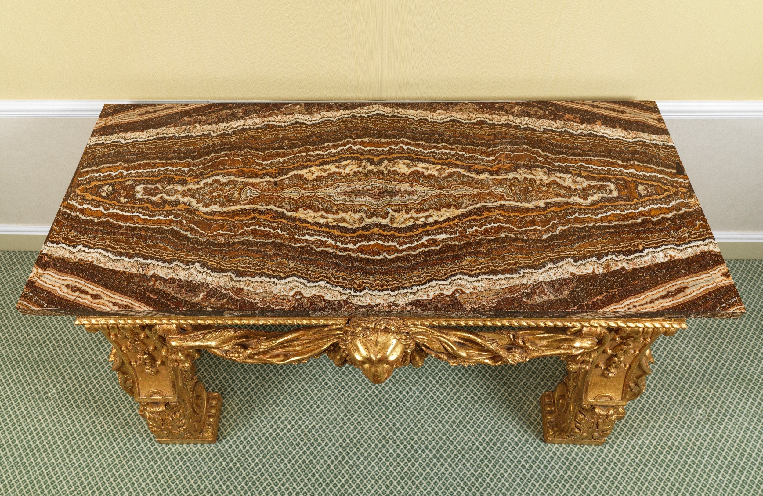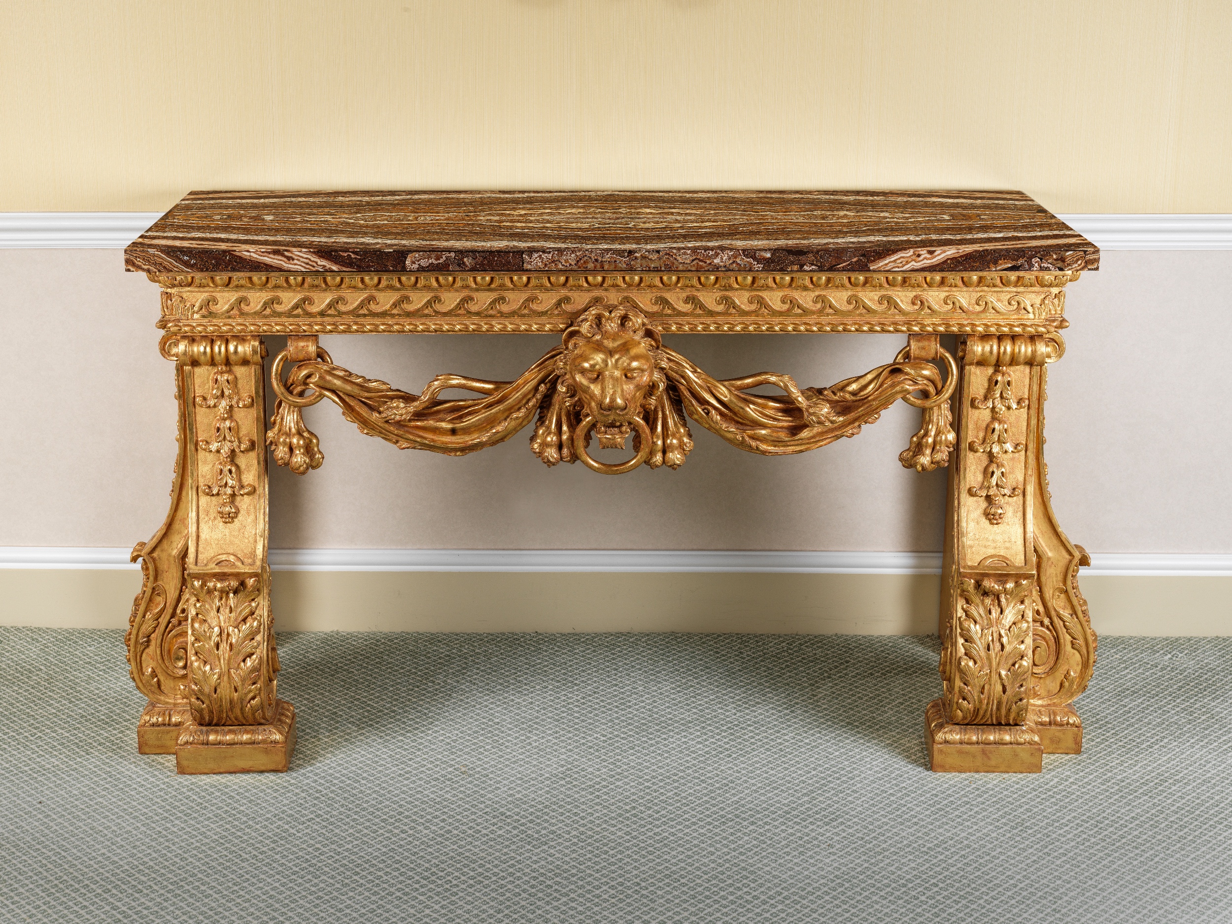 Having a rectangular jasper-veneered top, the channeled frieze filled with confronting Vitruvian scrolls with an upper border of egg-and-dart and a lower ribbon-twist border and a lion-mask suspending a ring and with lion pelt scrolls, further pierced with two tails and with claws suspended from further rings, the channeled scrolled supports with pounced upper sections filled with triple husks above scrolling acanthus and foliate and gadrooned feet.