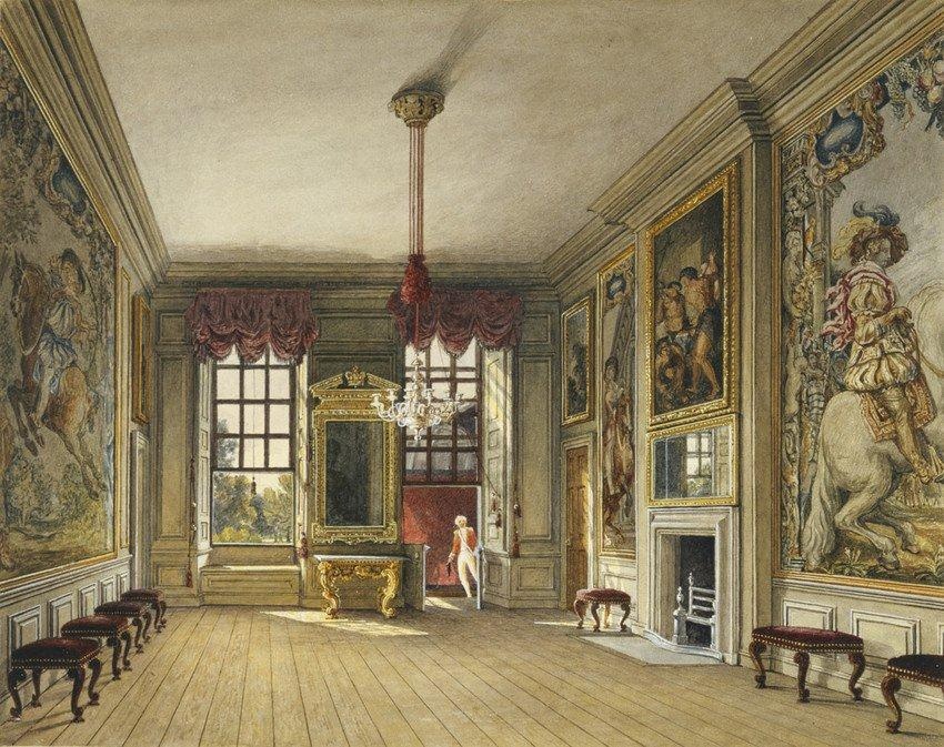 West Harling formerly consisted of several small manors, which in the time of William the Conqueror, were held as a berewic of the capital manor of Kenninghall by the Albinis and their successors, the de Angerville family. About 1564, it was sold to Basingbourne Gawdy Esq, of Mendham, in Suffolk ( 1532 – 1590 ) and by descent until the end of the male line with Sir Basingbourn Gawdy Gawdy, 3rd Baronet (d. 1723 ) who left the estate to his three nieces and they conveyed the whole estate to Joshua Draper, Esq who demolished it in 1725. He then began building a new house and sold it to Richard Gipps, Esq who bought the estate in 1736. Thence by descent to Nicholas William Ridley-Colborne, 1st Baron Colborne (1779 – 1854 ) who succeeded to the estate of his maternal Uncle, including West Harling, and assumed the name Colborne. Sir George Edmund Nugent, 2nd Bt. (1802 – 1892 ), who in 1830, had married the second daughter of the 1st Baron Colborne, The Hon. Maria Charlotte Ridley-Colborne ( d 1883 ) and inherited the West Harling estate. Thence by descent through the Nugent family. In 1929 it was removed from West Harling Hall, Norfolk before the Hall was demolished and was offered for sale as Lot 98 in the Puttick and Simpson sale of the contents but failed to reach its reserve and so remained in the possession of the Nugent family.