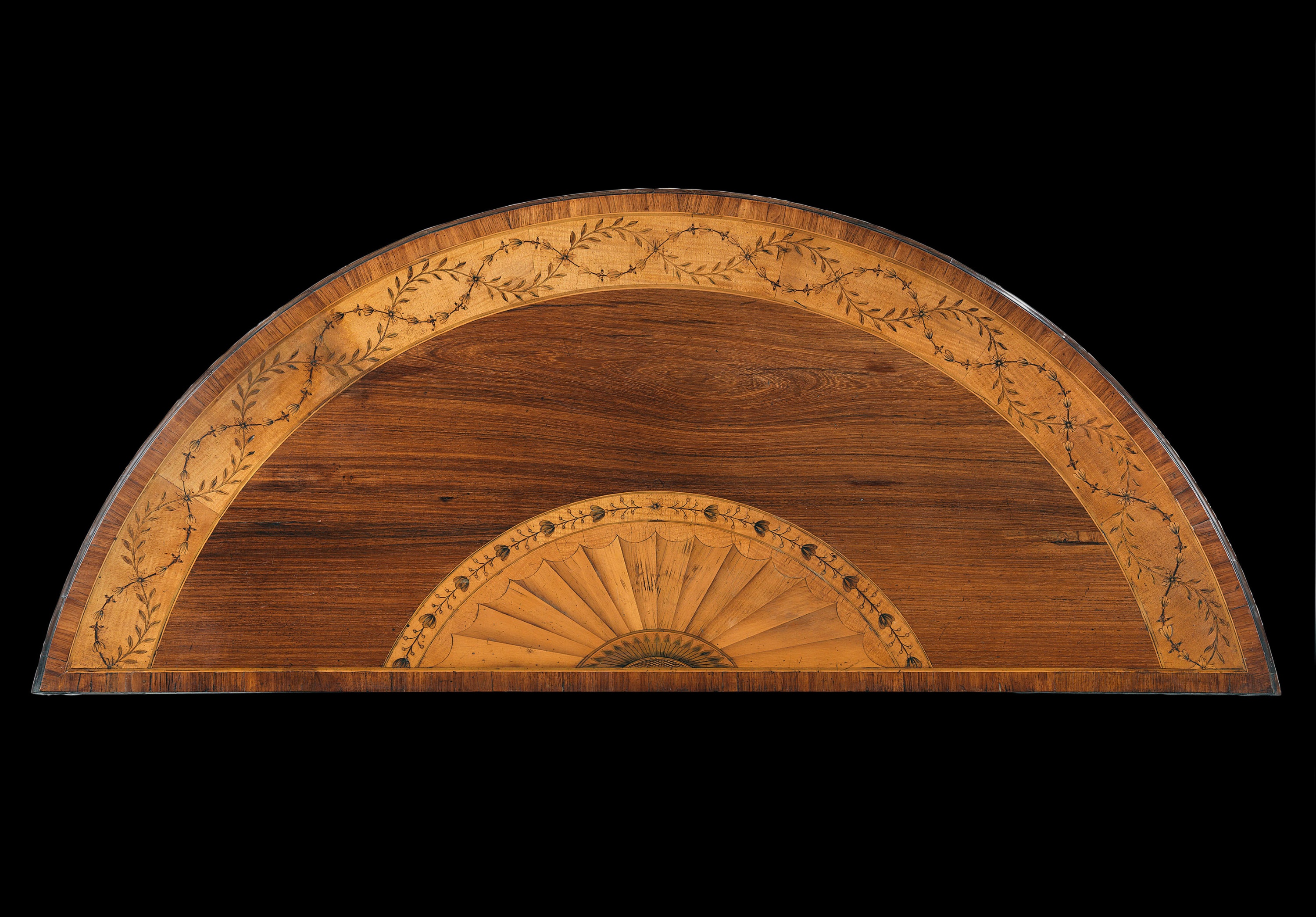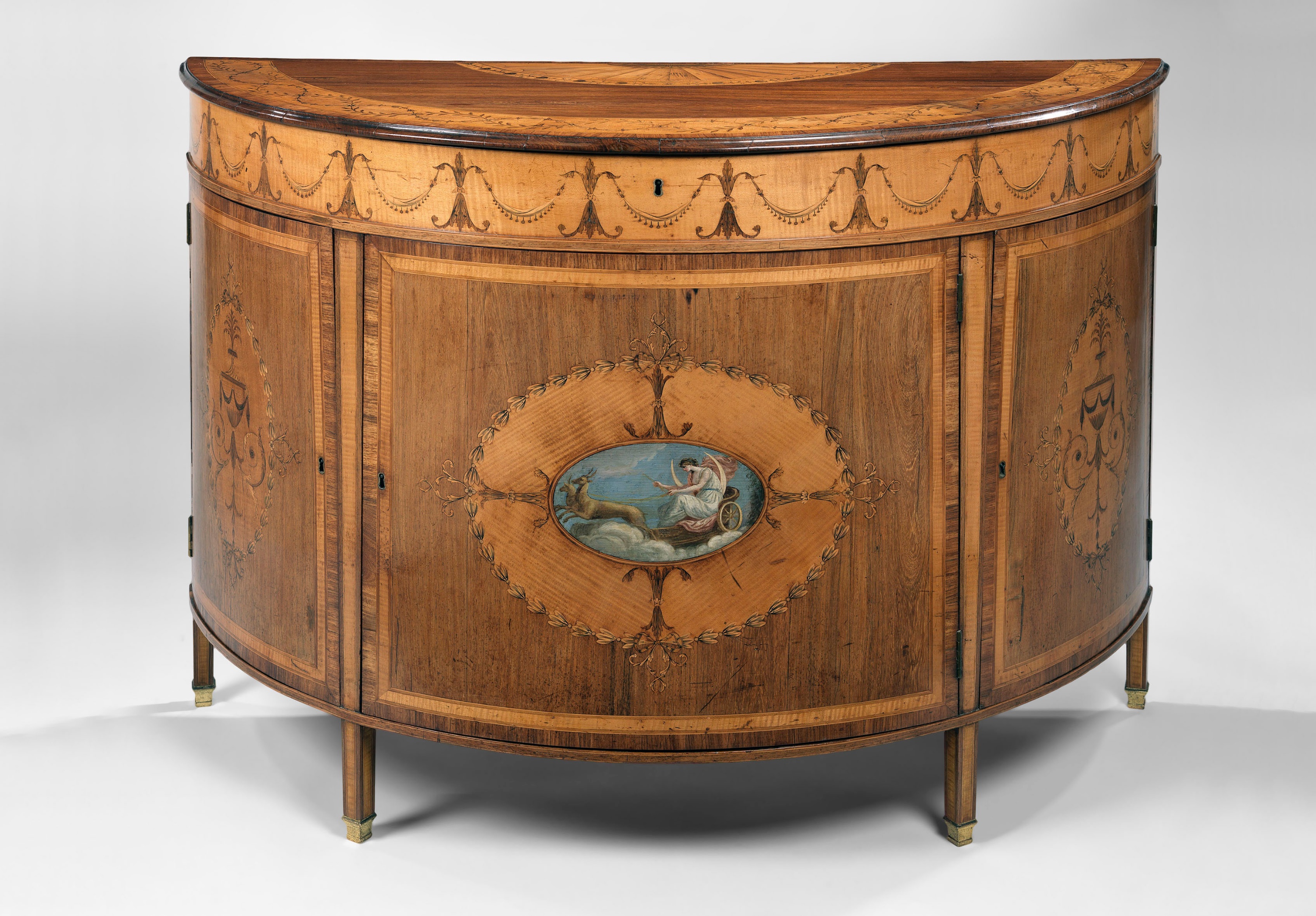 The commode’s top is centered by a sunflower and fan patera which corresponds to a commode attributed to Mayhew and Ince and illustrated in Lucy Wood (ibid, pp.236-238, no.28), while the unusual treatment of the husk or split-leaf that decorates the frieze and borders the painted medallion relates to a commode made from a side table attributed to the firm (L.Wood, ibid, pp.299-302, no.40). The husk wreath bordering the oval panel in the door is similar to that on a serpentine commode in the Leverhulme collection (L.Wood, ibid, pp.217-221, no.24). The overall form of this commode is unusual in that the stiles dividing the doors taper as if it were to have been a side table, with the doors correspondingly shaped. Two similar examples are illustrated in Lucy Wood’, ibid, pp.226-235 and 236-238, nos.27 and 28.