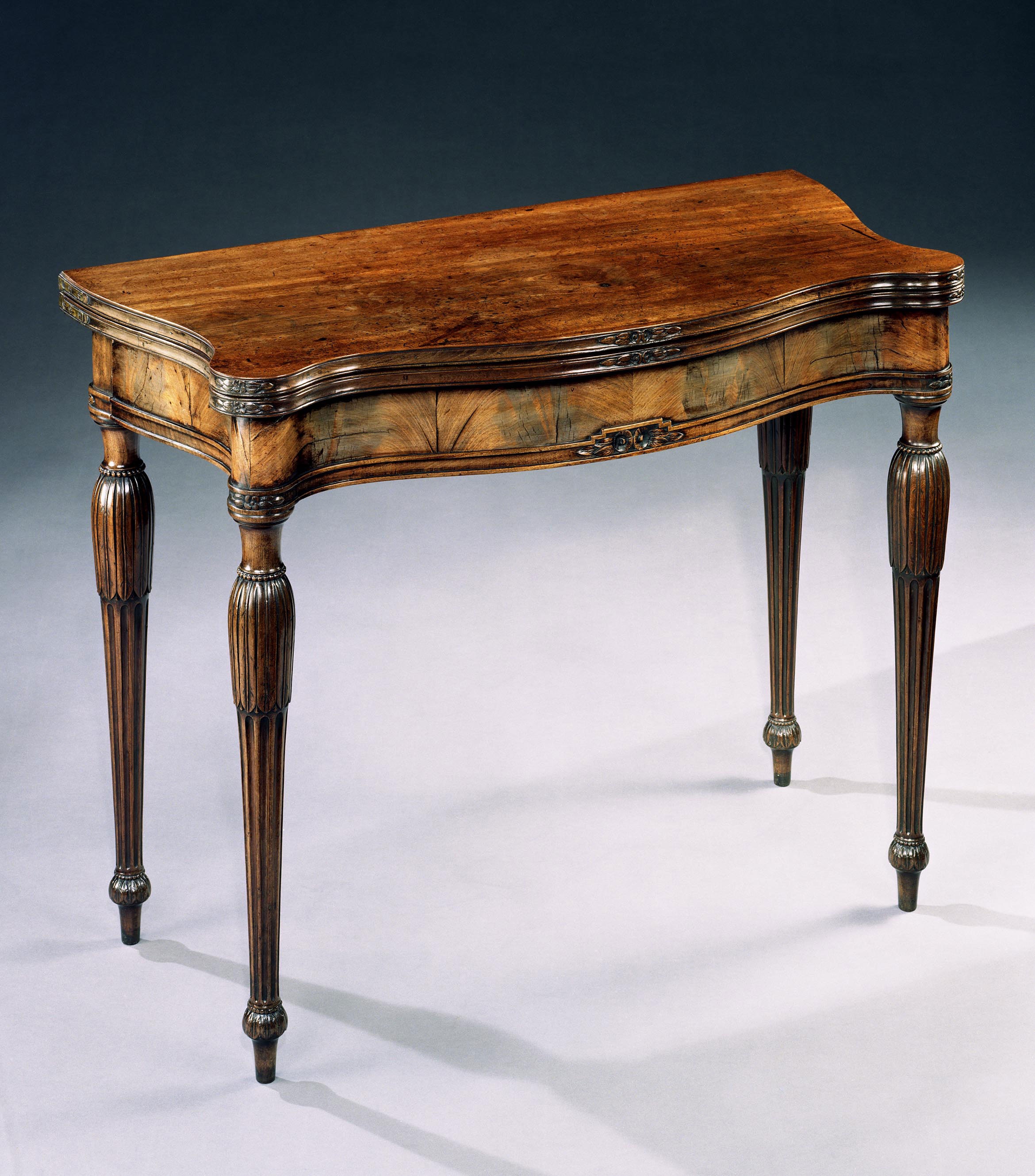 A fine mid 18th century Chippendale period carved mahogany serpentine card table of outstanding colour and patination. The fold-over moulded top, lined in baize and supported by a gate leg action; the gently undulating frieze with moulding and central stylised flower carving; on circular tapering fluted legs with leaf caps and terminating in leaf carved toupie feet.