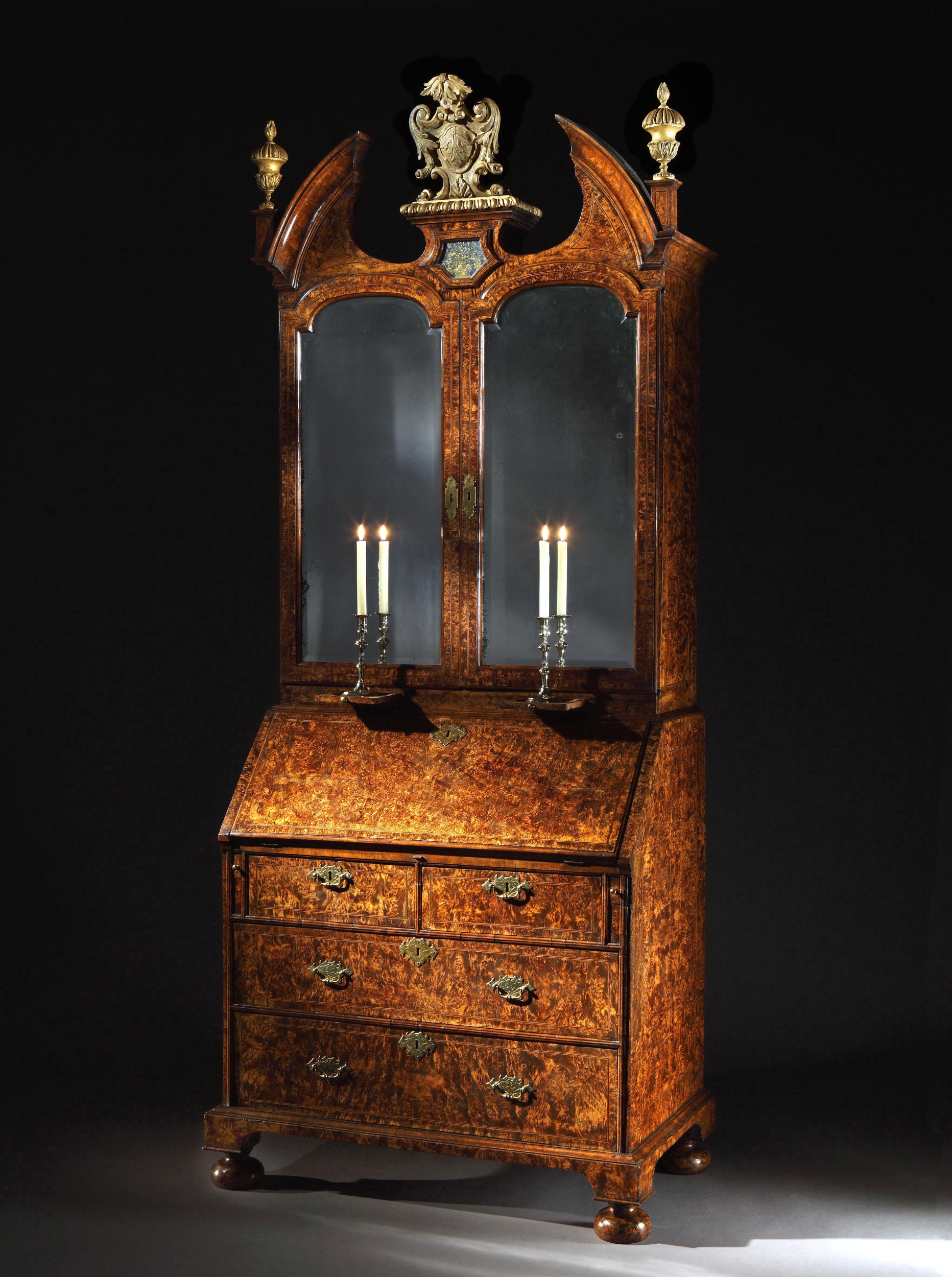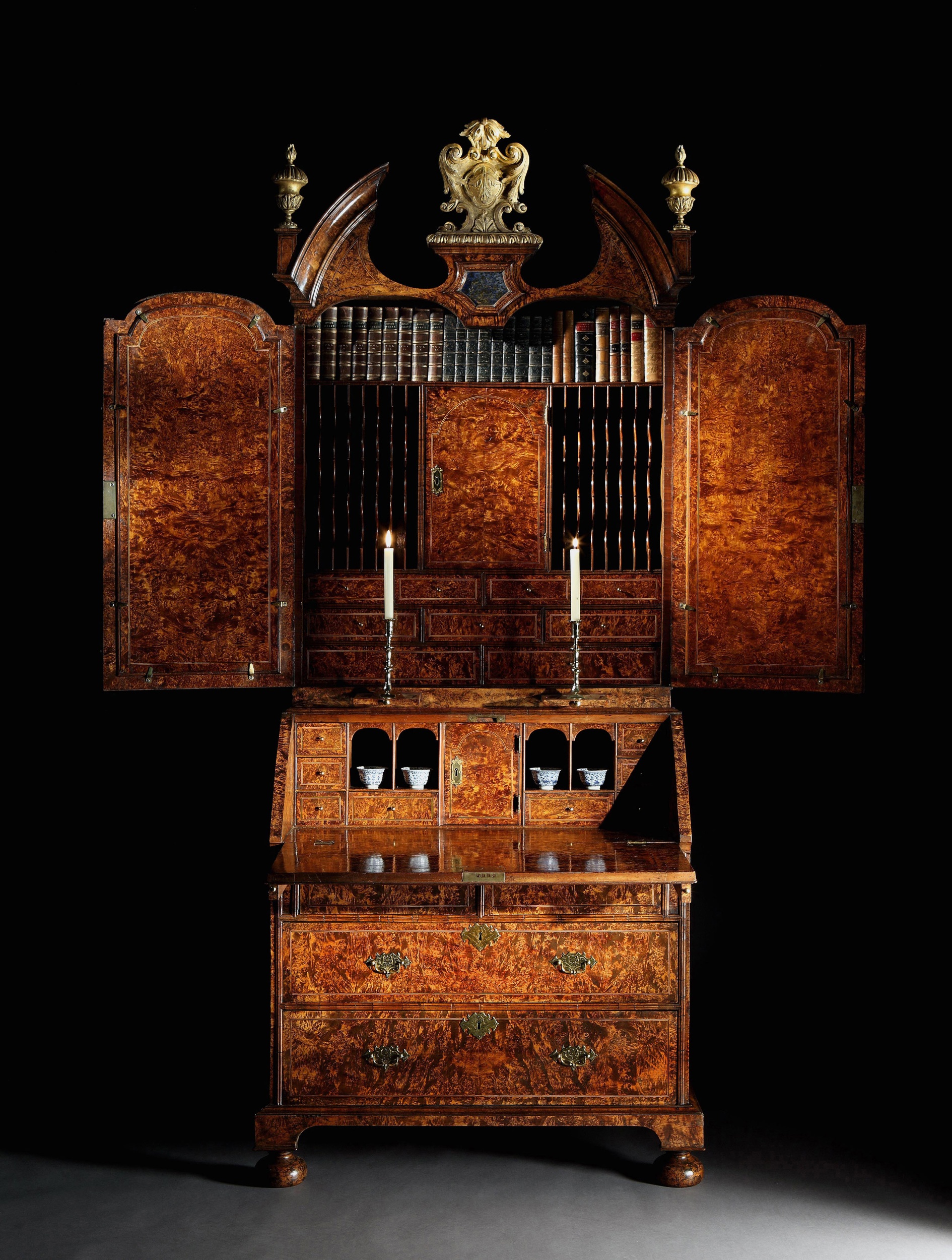 The present bureau cabinet is finely veneered in burr maple, a wood often used by John Coxed (fl. 1711-1718) and later Grace Coxed and Thomas Woster (fl. 1719-1735). Trading from the White Swan Workshop, St. Paul's Churchyard, the firm labeled their furniture: 'At the White Swan in St. Paul's Church-Yard, London; makes and sells Cabinets, Book-Cases, Chests of Drawers, Scrutores [sic]; and Looking-glasses of all sorts at reasonable rates'. Adam Bowett, Furniture History, 'Labeled Furniture from the White Swan Workshop (1711-1735)', vol. XXXIX, 2003, pp. 71-98, cautions: '... it must be emphasised that the use of stained burr maple veneers, with or without crossbanding and stringing, does not on its own constitute adequate proof of (Coxed and Woster's) authorship. The technique of staining veneers in this way was widely practised, and scores of pieces survive which otherwise bear no relation, either technically or stylistically, to the White Swan oeuvre.'This technique involved the cutting of the roots of the field maple tree into veneers, laying the veneers down onto the carcase and then pouring sulphuric acid onto the veneers to open up the grain. With the grain open a mixture of soot and oil was rubbed into the grain to obtain the desired marbleised effect. The veneer was then sealed with a polish and waxed. It was generally thought that the desire for a marbleised effect arose as a result of people seeing, on the Grand Tour, the fashion of the Italian cabinet makers of making furniture out of marble.