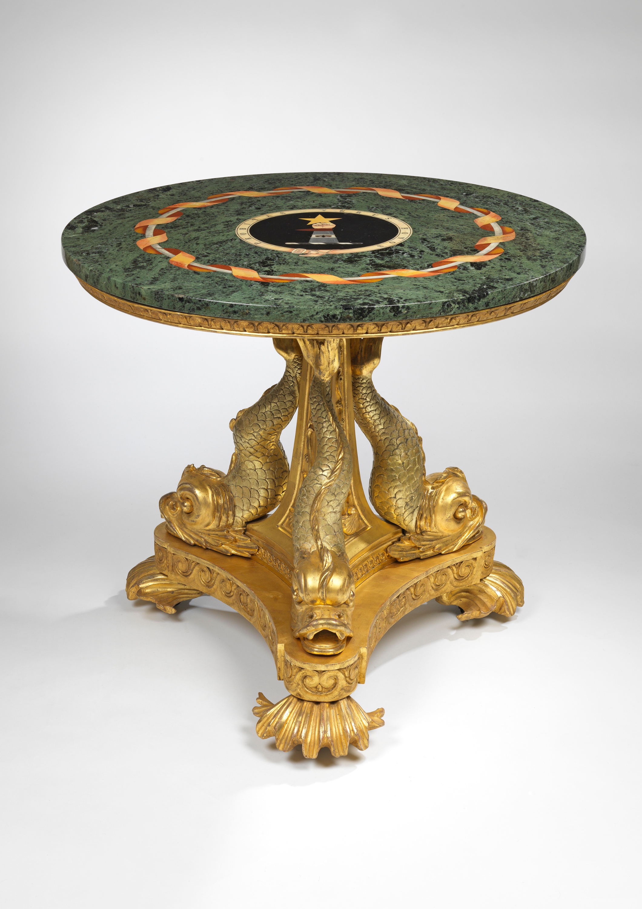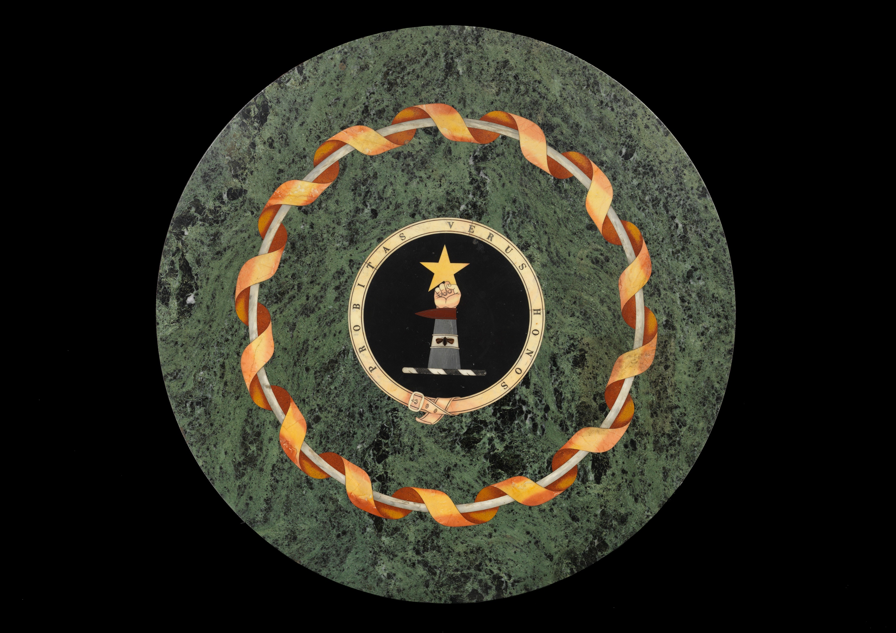 Hansard was granted the crest and coat of arms that appear on the pietre dure top on 17 November 1809. The description of the crest does differ slightly from the description in the grant, in that the cuff of the sleeve in the grant is yellow, while it is red on the table top and it has been suggested, considering the language of the grant, that Luke Hansard may have been using the crest prior to the grant. The granting of the crest and arms coincides with the date of Luke Hansard standing down and letting his son, Thomas, take the reins of the family business.