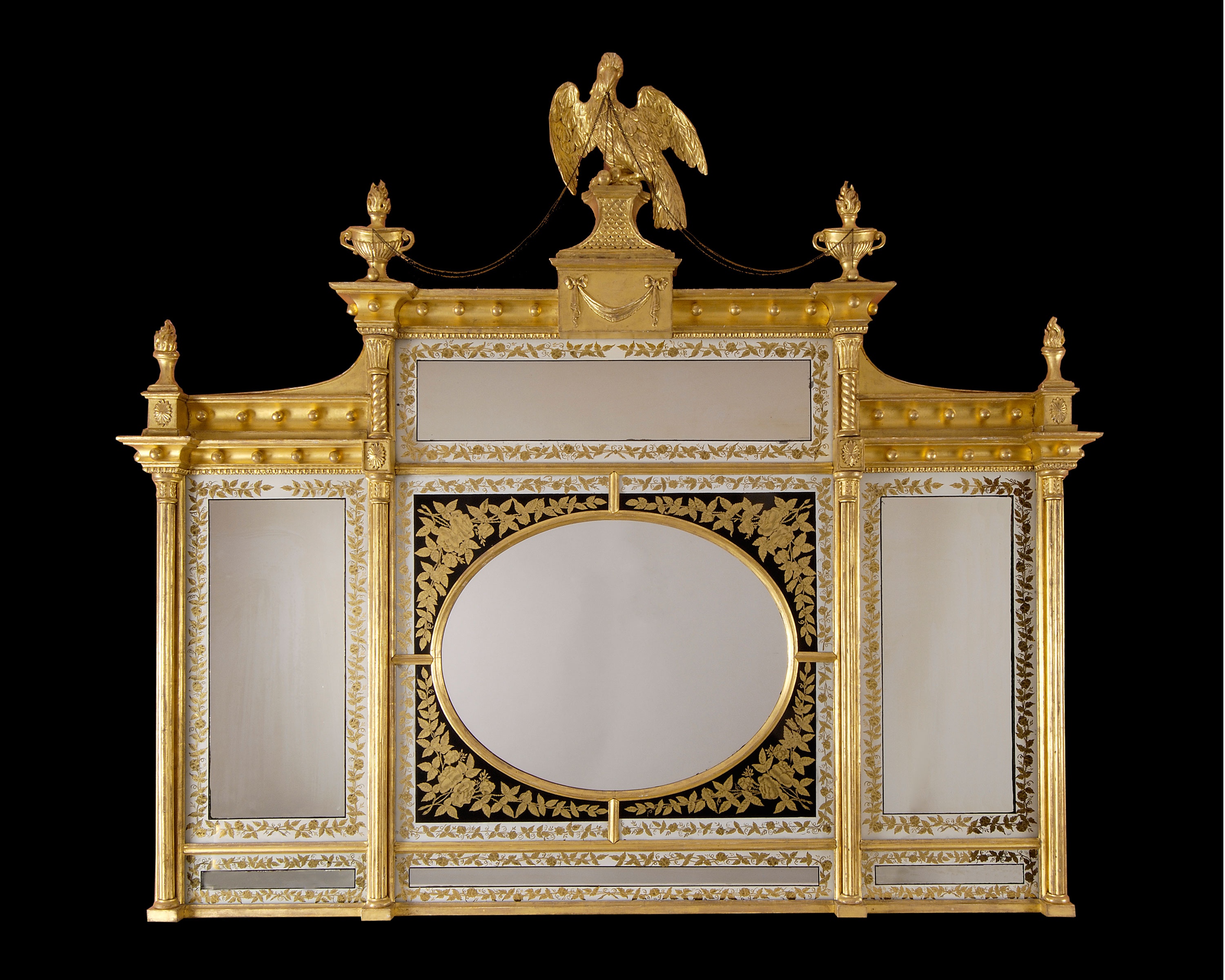 The central oval glass is surmounted by four black and gold verre églomisé panels of leaves and flowers, surrounded by a cream and gold verre eéglomisé border of leaves and flowers. The central panel is flanked on the sides and the top by panels of glass surrounded by a border of cream and gold verre églomisé. The eagle cresting over the top panel with chains and balls coming from his beak, connected to urns on either side of the columns, dividing the central panel from the side panels. The urns sit on the top of the curved cornice which is decorated with balls.
