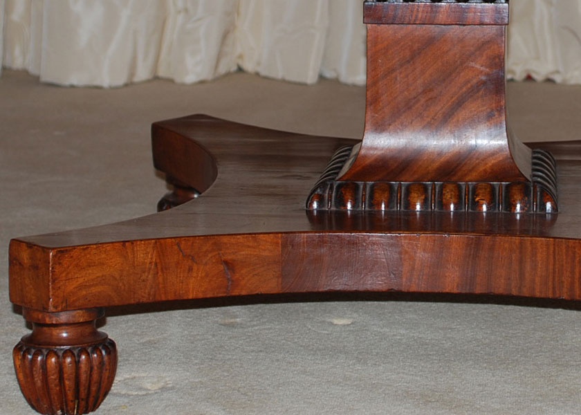 The top being veneered in segments in the pattern of a wheel and set on a platform base with rounded terminals and gadrooned bun feet.