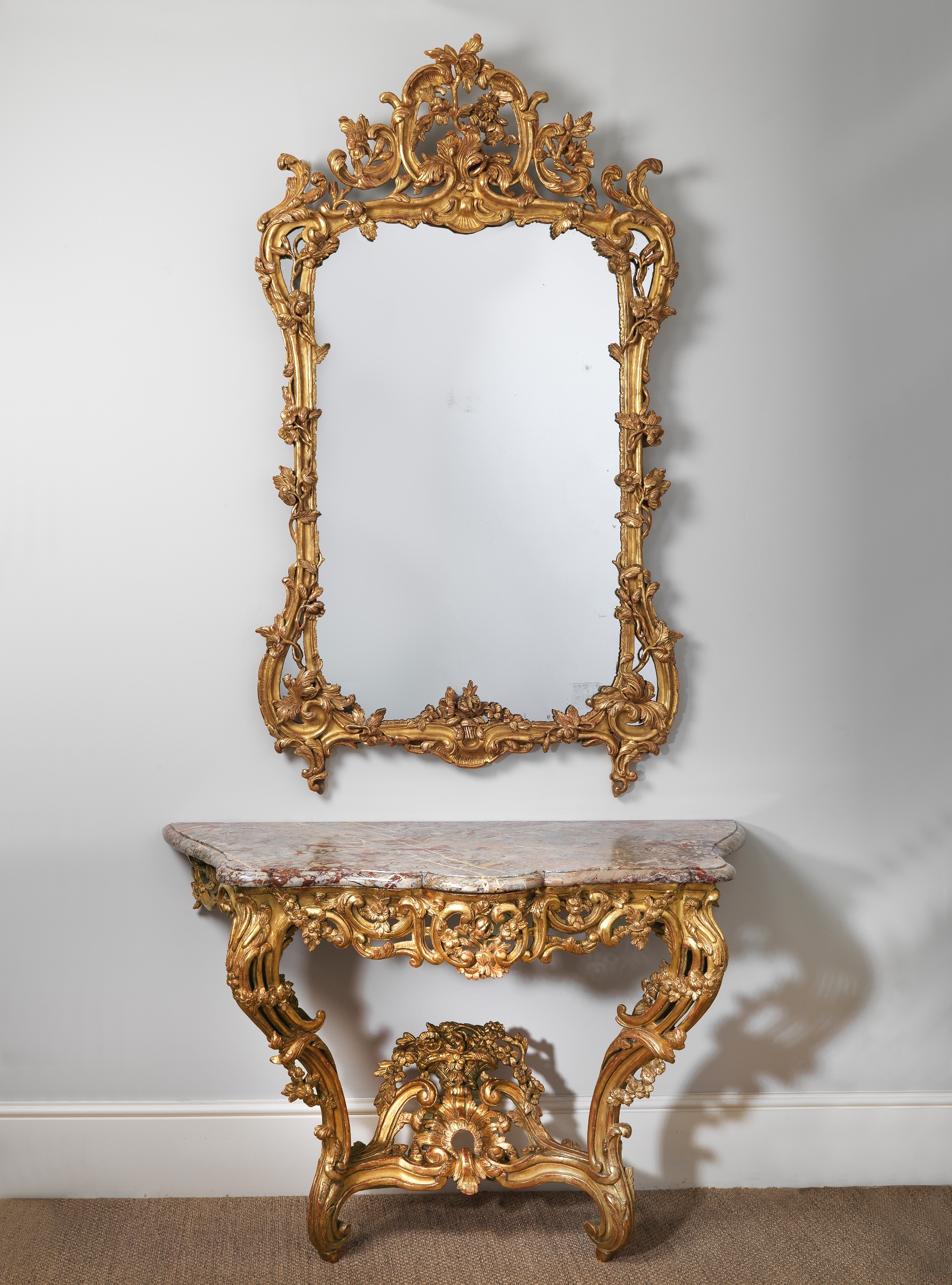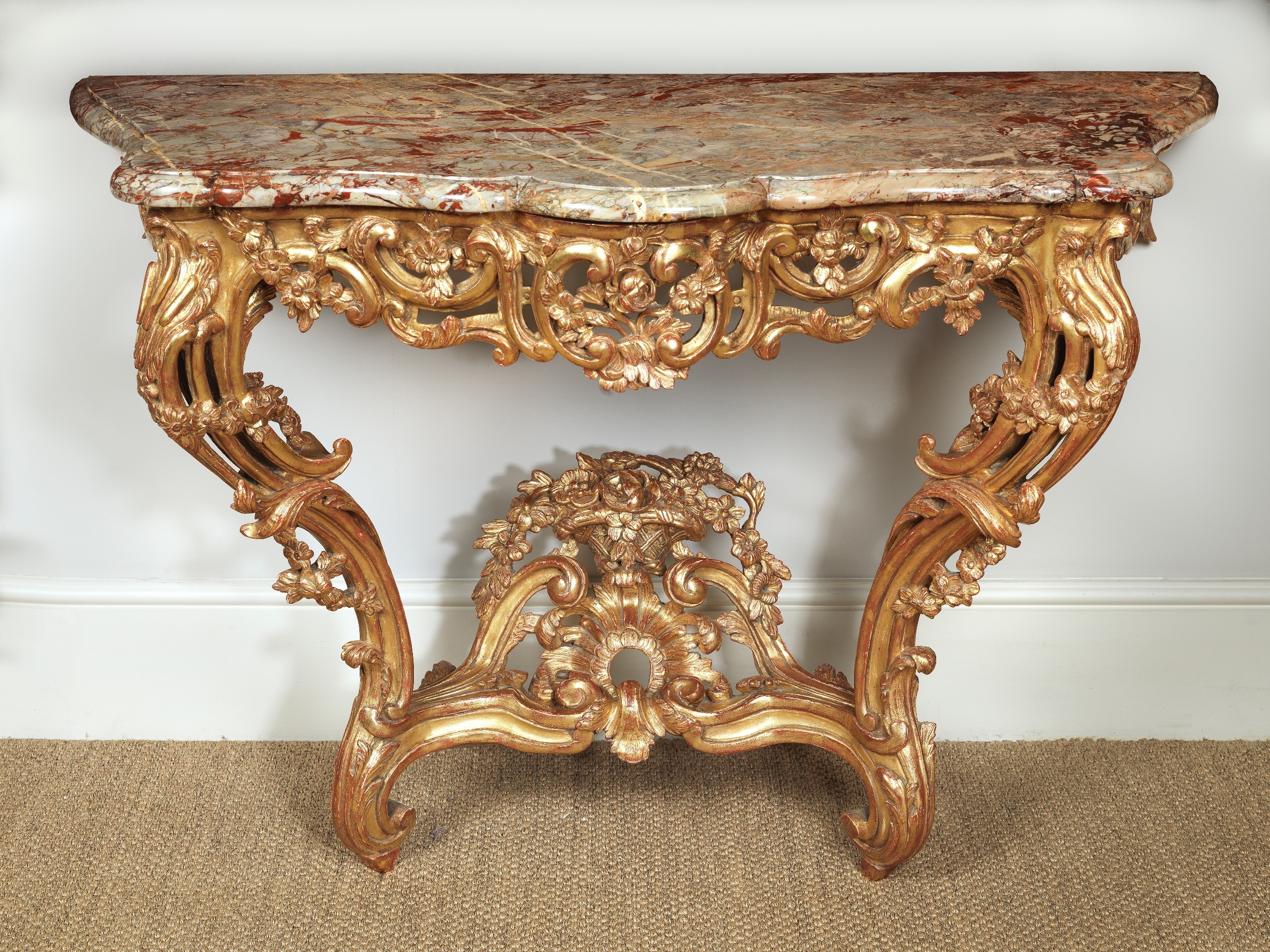 With serpentine shaped marble top with moulded edge, above a pierced, C-scroll and floral carved frieze, on tapering cabriole legs carved with C-scrolls, foliage and trailing vines, joined by a similarly carved and pierced stretcher.