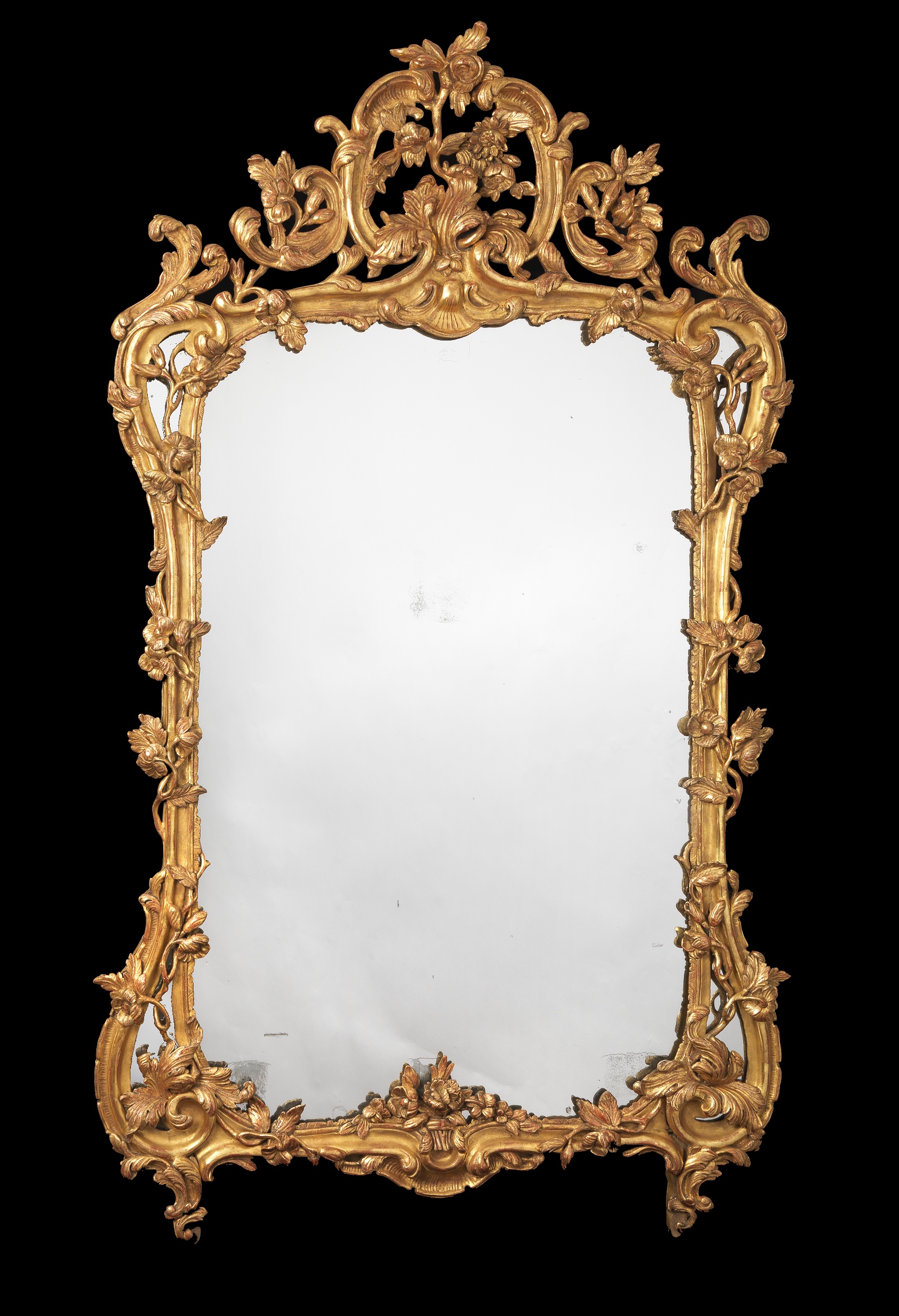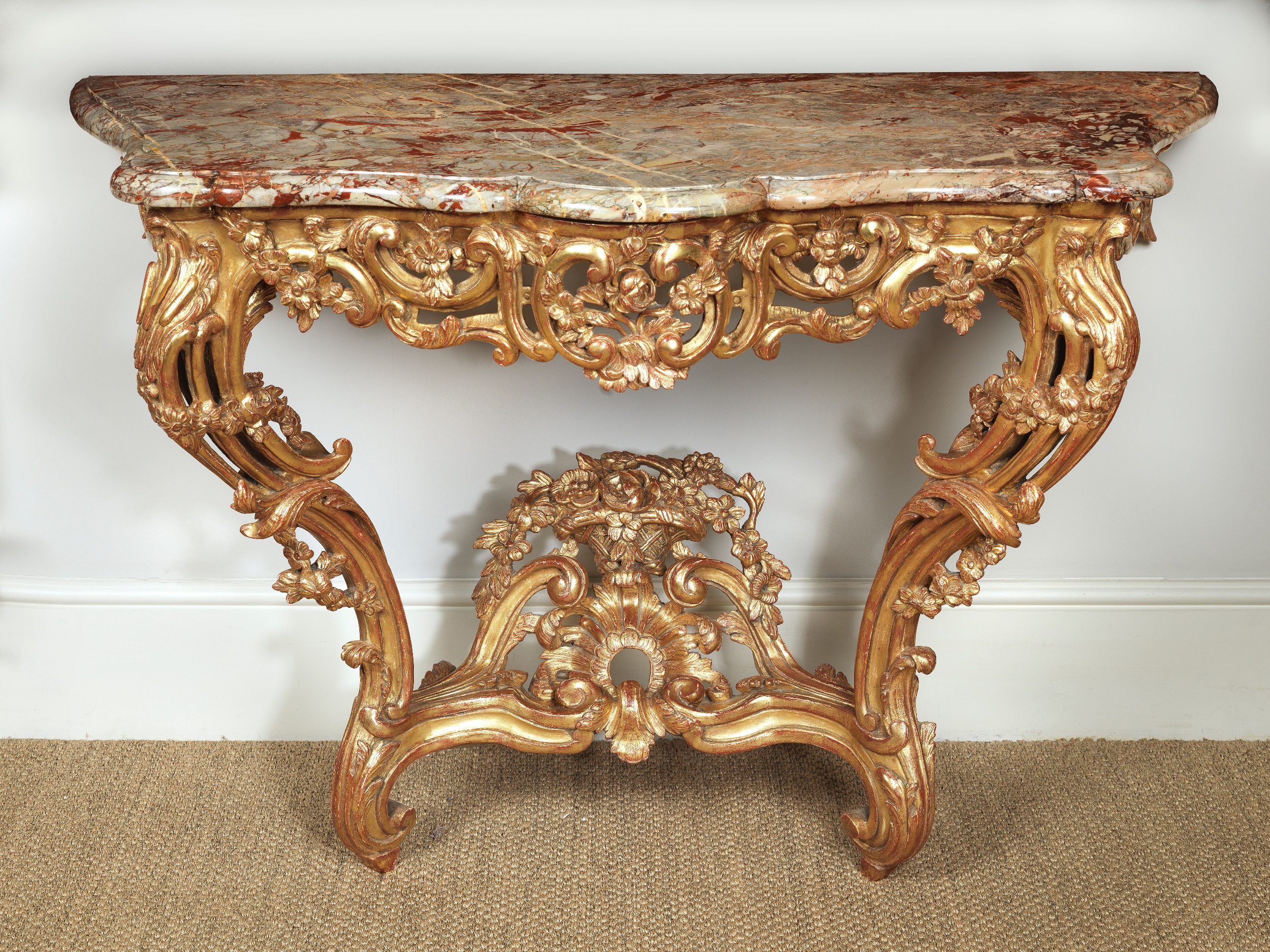 The top of the mirror carved with a bunch of flowers framed by scrolls with intertwining flowers on the sides and base. The table with a rouge griotte marble above two scrolling carved legs wrapped around with flowers and joined by a stretcher of scrolls below a basket of flowers. The carved pierced frieze made up of scrolls and entwined with flowers.