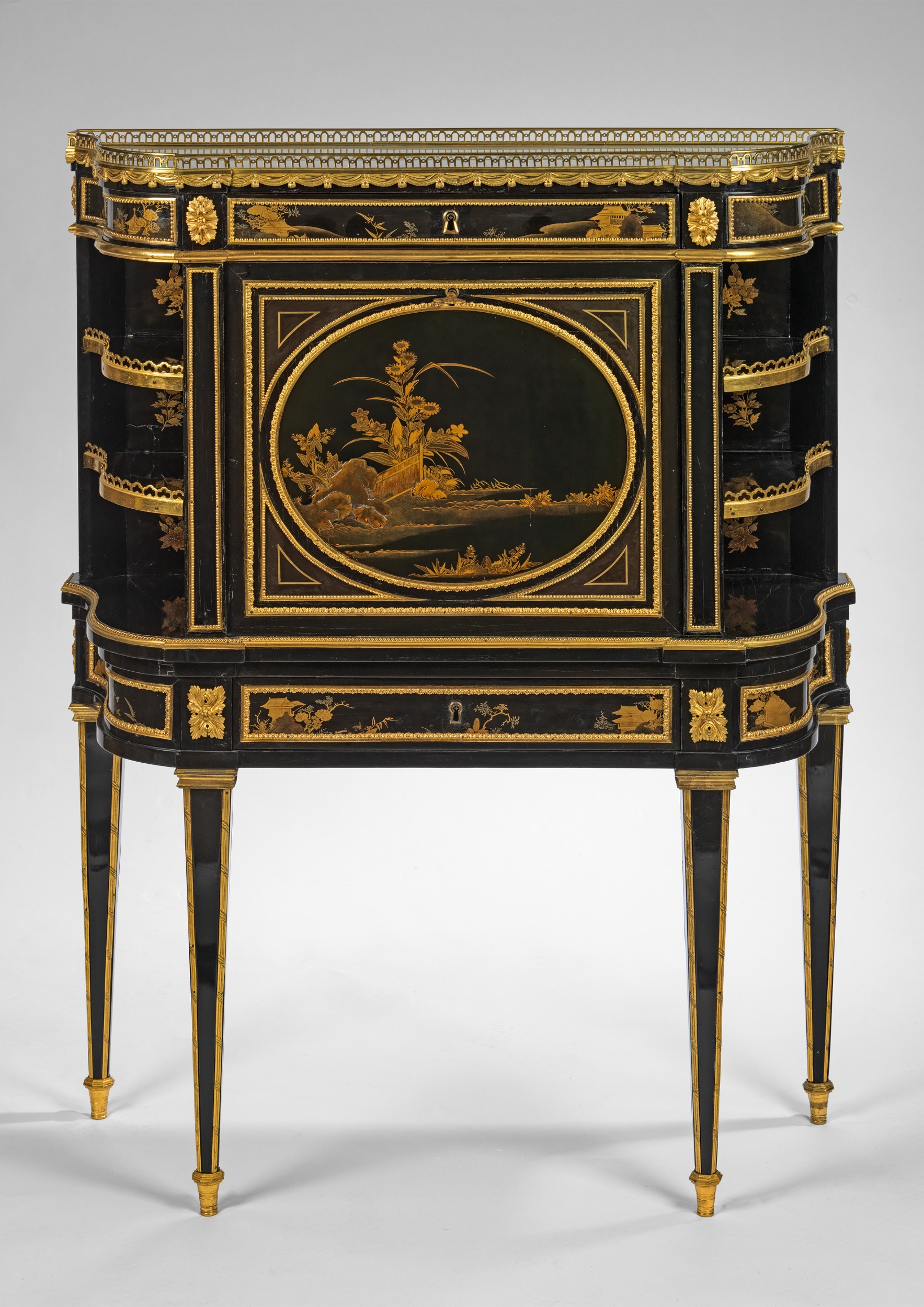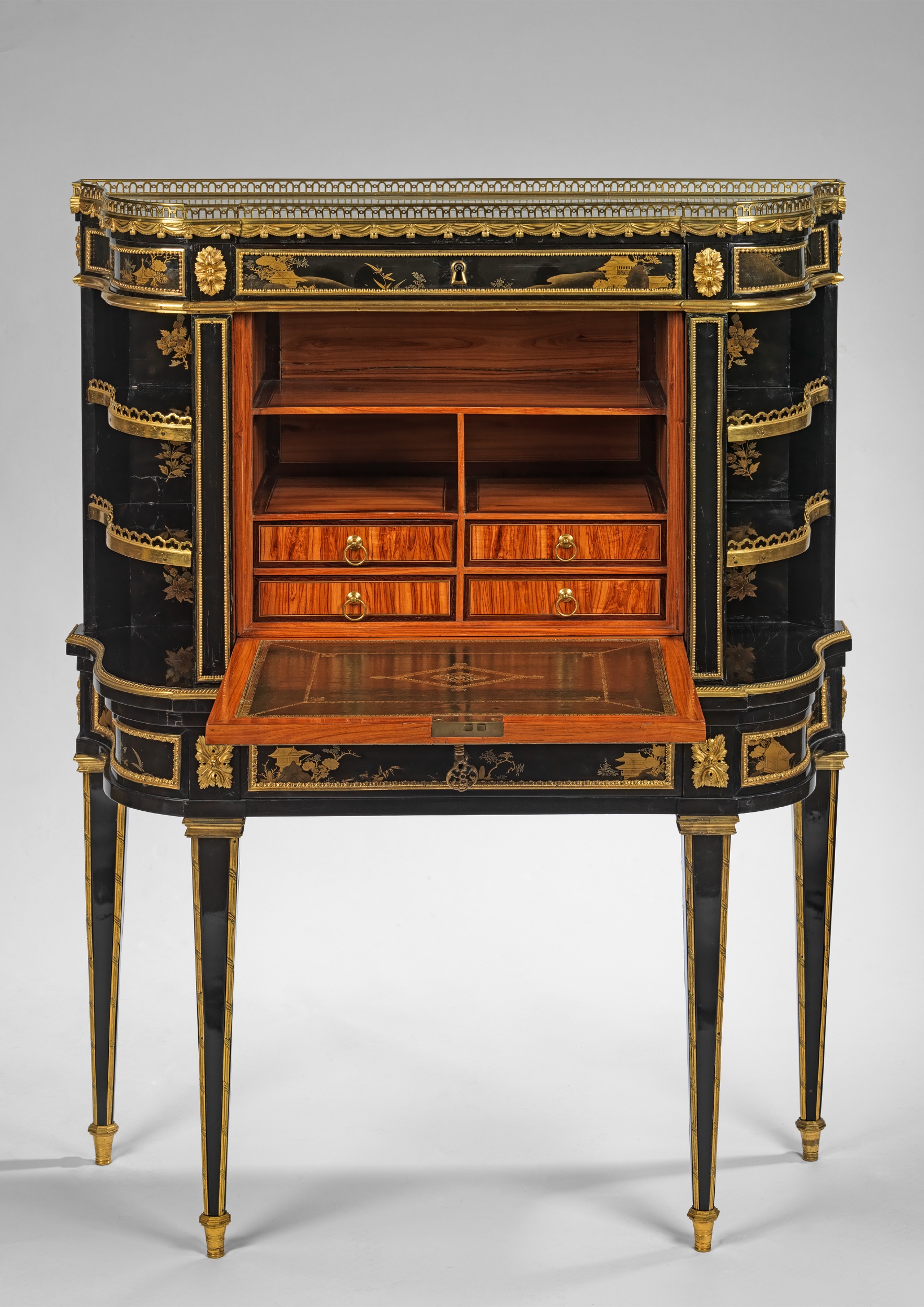 This superb secrétaire-à-abattant by Etienne Levasseur, veneered with precious seventeenth-century Japanese lacquer and set with beautifully chased gilt-bronze mounts, was once part of the collection of the celebrated collector and socialite Lady Baillie in Leeds castle, Kent. It relates closely to pieces of furniture usually decorated with plaques of Sèvres porcelain supplied by the marchand-merciers Simon-Philippe Poirier and Dominique Daguerre, such as the secrétaire of this shape incorporating a porcelain plaque dated 1776 and with similar opened shelves to the sides is now at the Wallace collection (inv. F304); and another, circa 1775, formerly in the collection of Baron Nathaniel Mayer von Rothschild (1836-1905) and now in the J. Paul Getty Museum, Los Angeles.