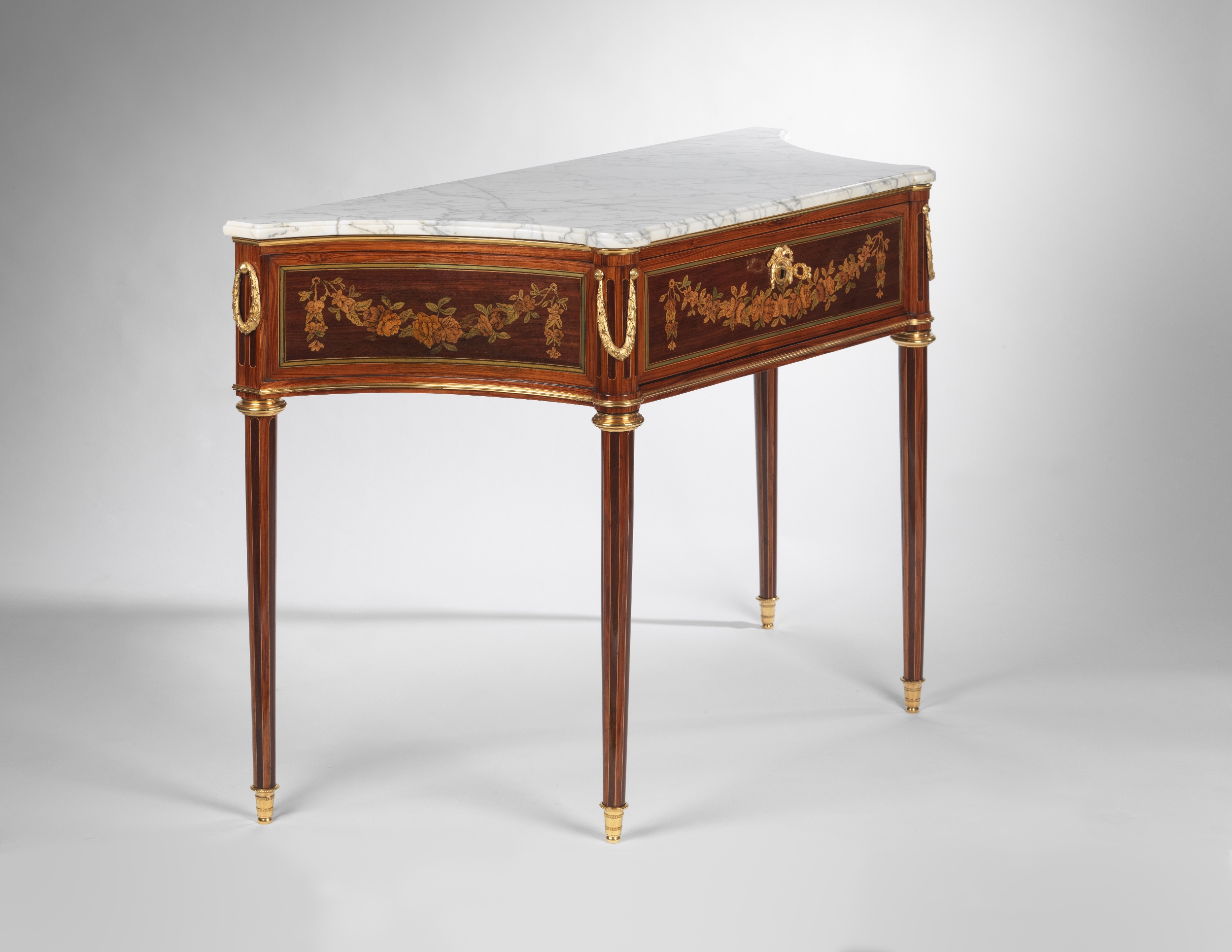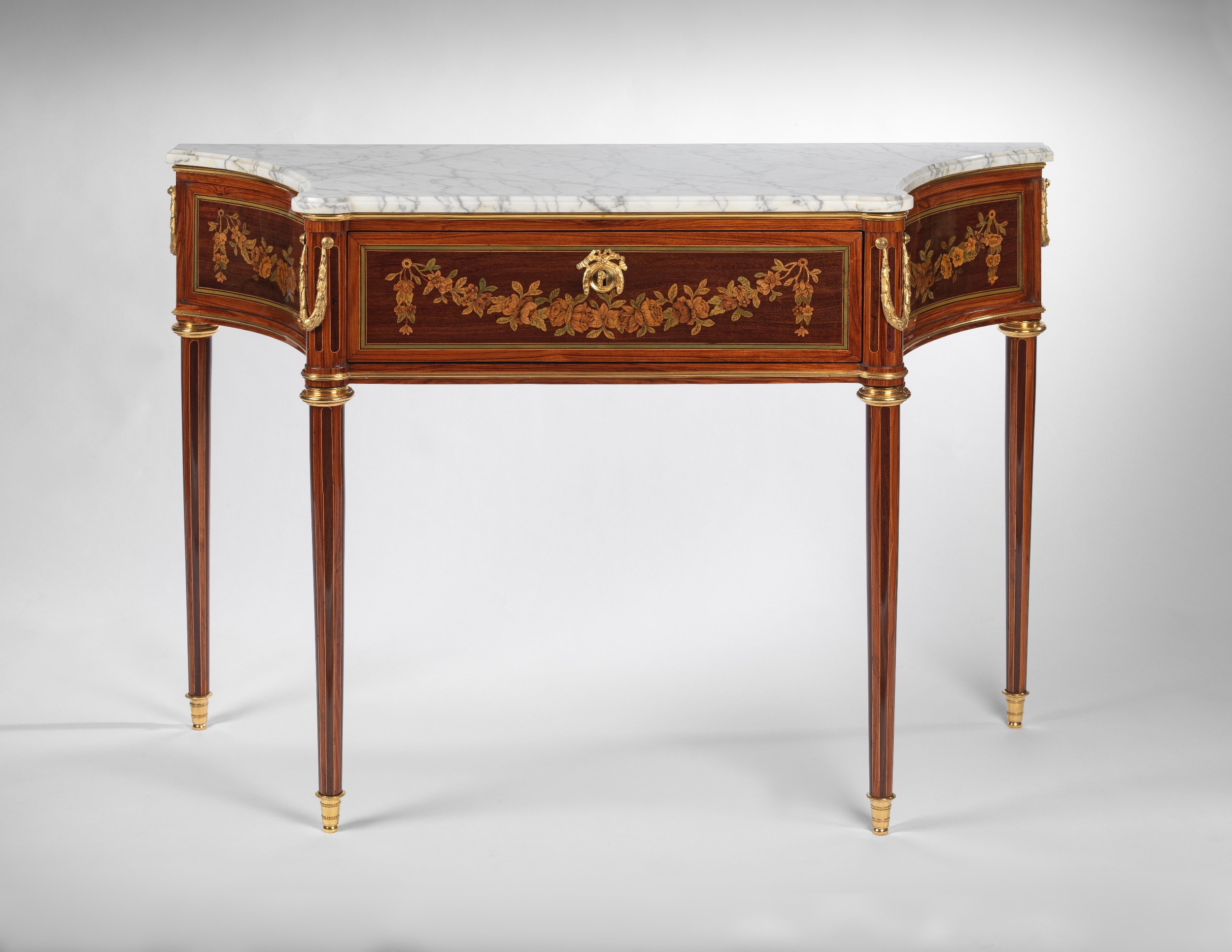 Charles Topino specialised in making small tables, chiffonnieres and bonheur -du-jour although he is also credited for making commodes and secretaires in both the transitional and Louis XVI styles. His pieces were distinguished by their high quality and individual marquetry decoration, for which he gained great acclaim. He often made marquetry with items such as vases, teapots, bottles, and other artefacts such as cards. He also was famous for marquetry with garlands of flowers and bouquets such as this very fine and unusual piece. He worked for several years as an independent craftsman from his workshop in the rue de Faubourg-Saint-Antoine and although he did work directly for some of the French Aristocracy his main customers were the marchand-merciers and marchand-ebenistes notably, Hericourt, Dautriche, Migeon, Delorme, Tuart, Joubert and Boudin. Examples of his work can be seen at Waddesdon Manor, Musees des Arts Decoratifs, Louvre Museum, and the Nissim-de Cammando and Versailles and many others.