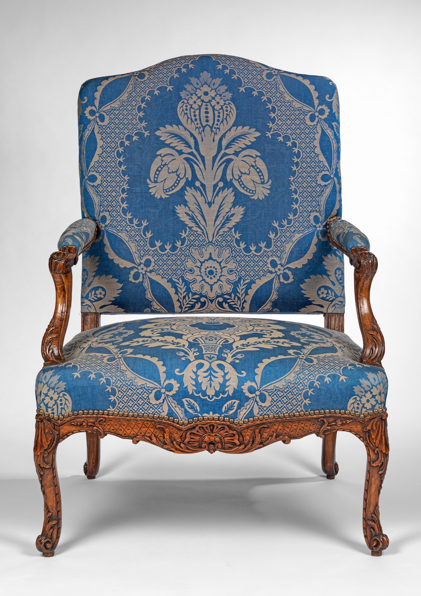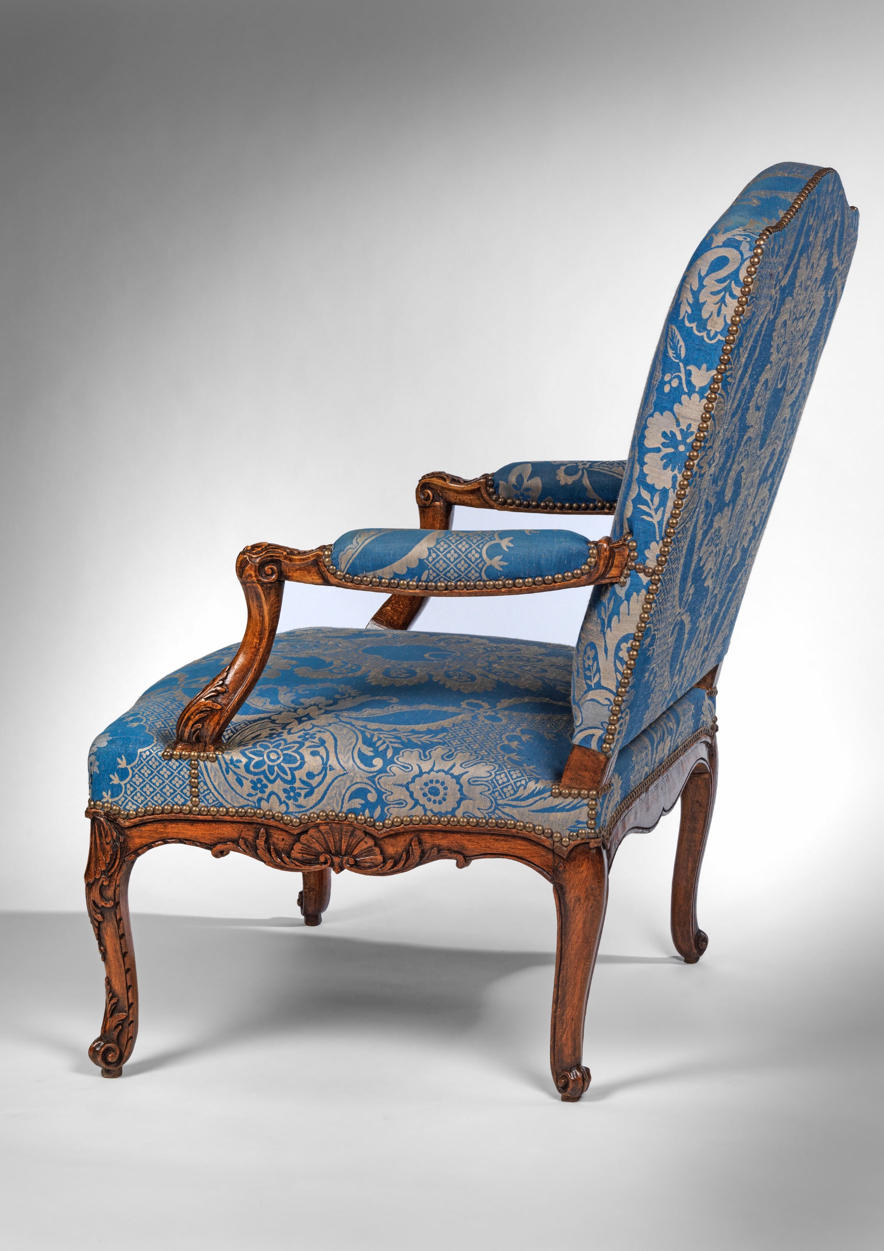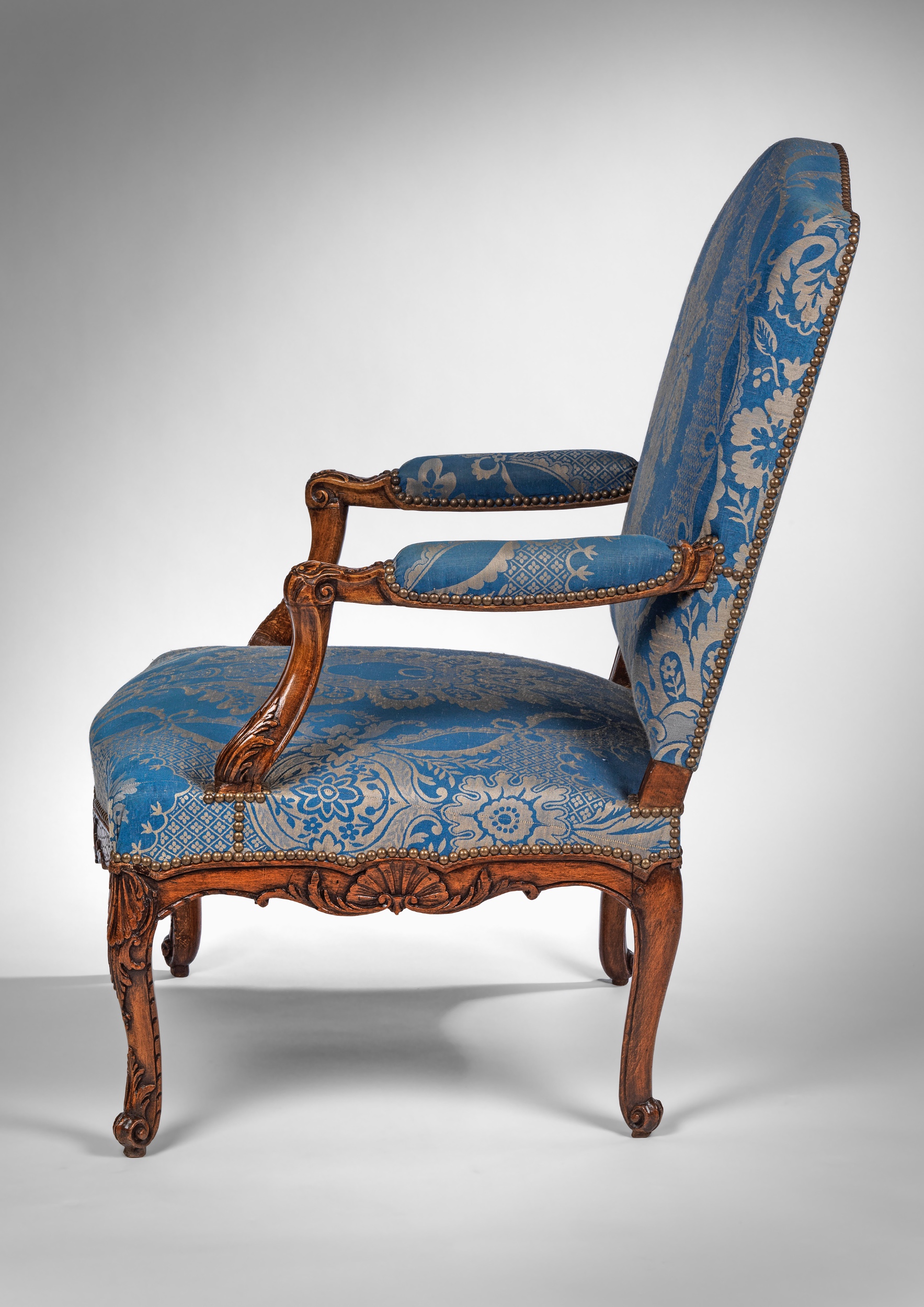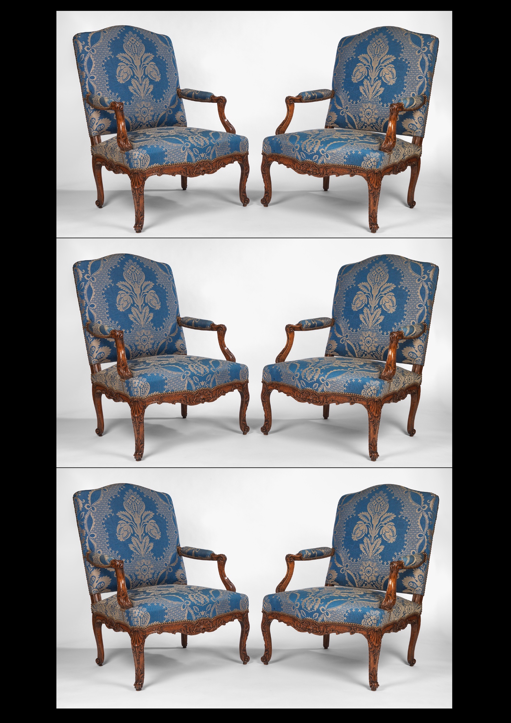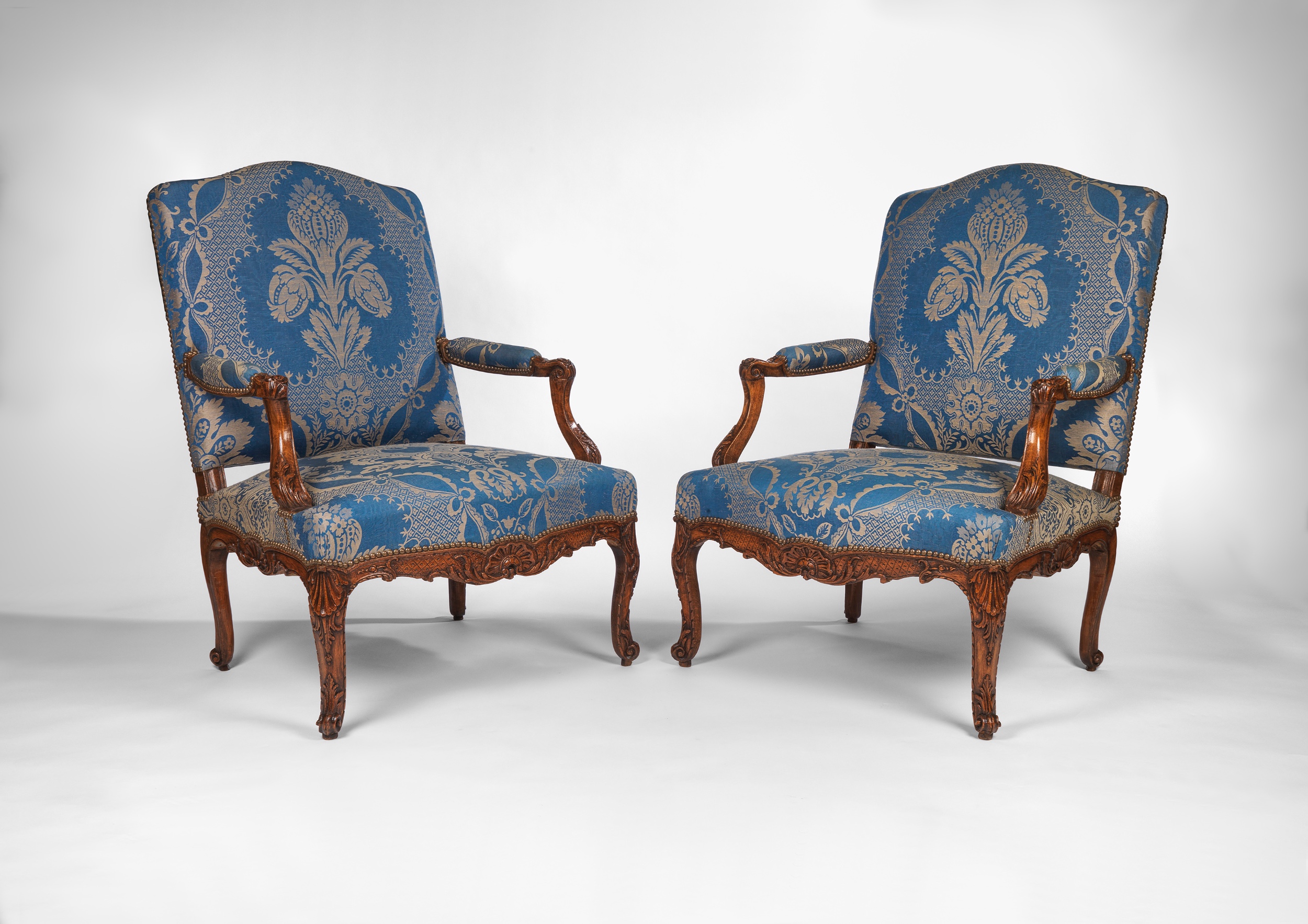 The backs of the fauteuils have arched and shaped top rails; the padded arms rests are covered and have scrolling carved arms. The front rails are carved with a shell motif in the centre with scrolls either side leading to legs carved with a shell at the top leading down to a scrolled foot. All are covered in a blue cotton fabric with a central motif of leaves and flowers.
