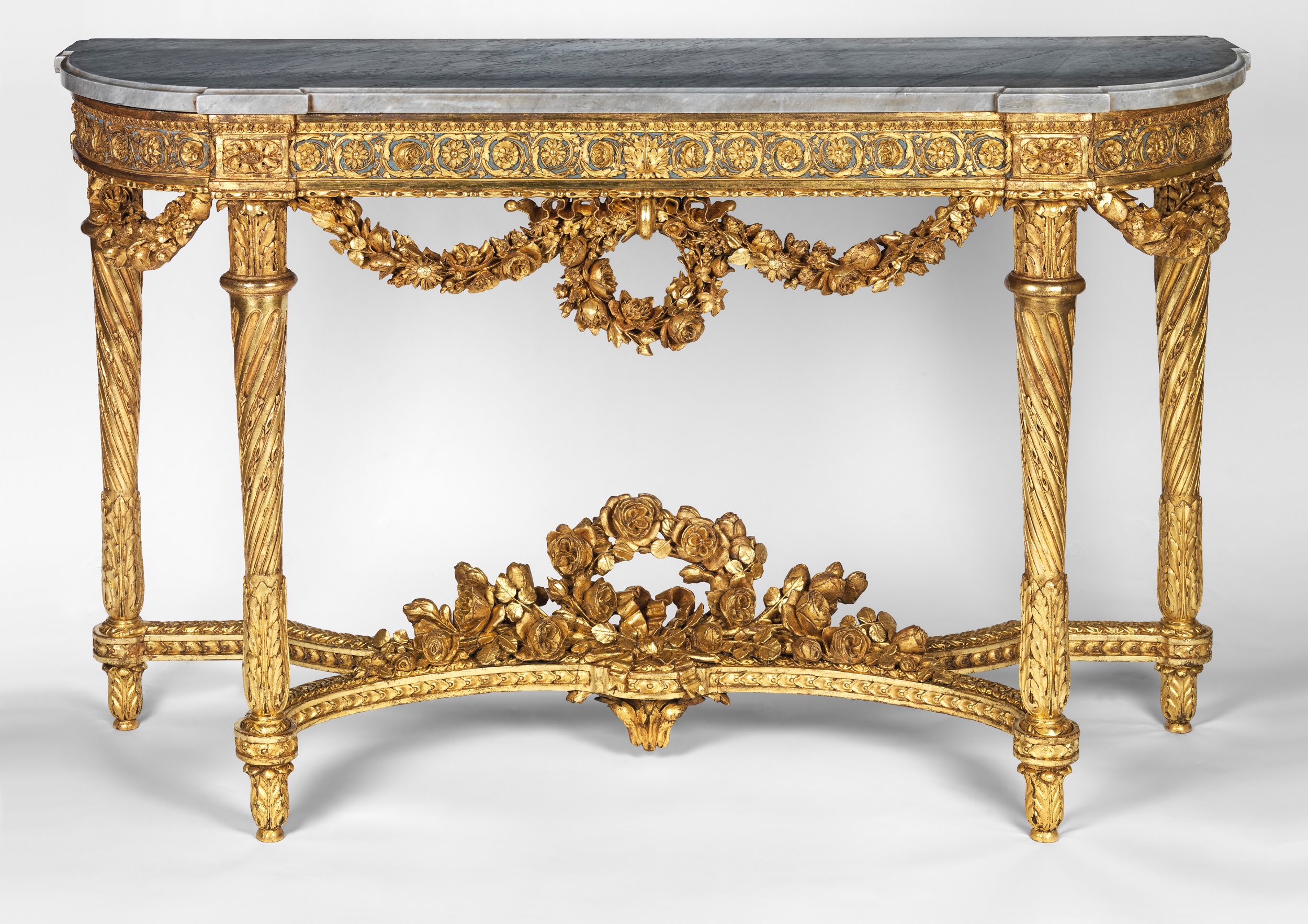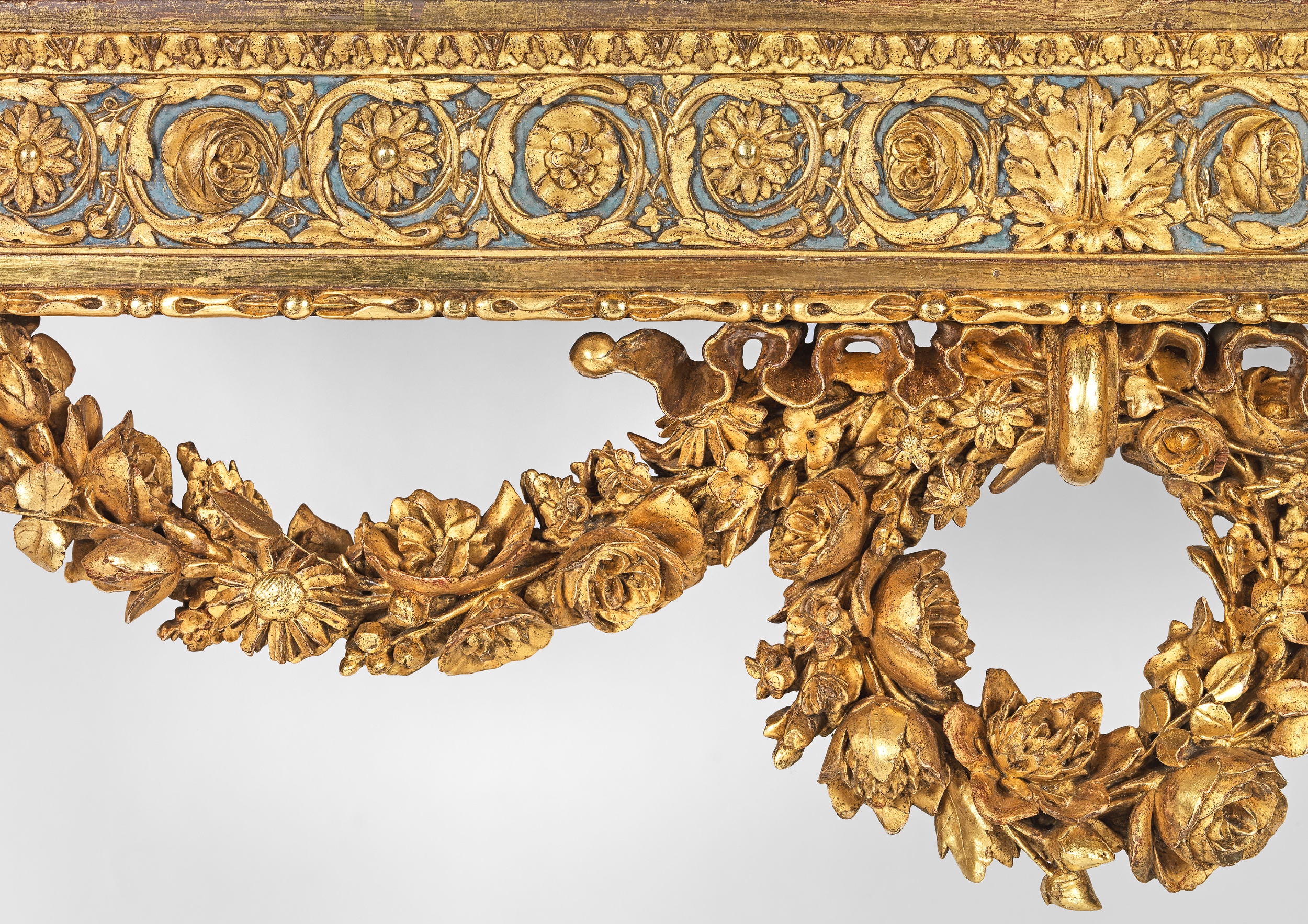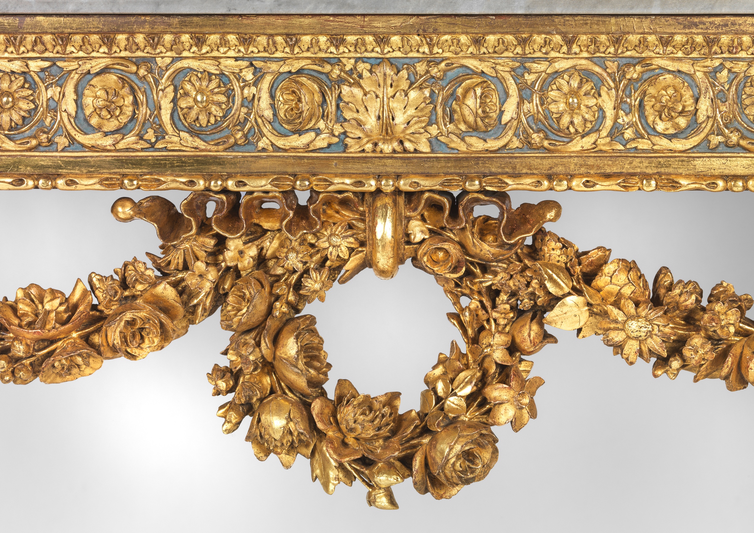 With its spirally-fluted turned tapering legs, distinctive stretcher, lush garlands and central wreath, this table is very similar to a side table and pair of corner consoles en suite sold from the Alexander Collection at Christie’s, New York, 30 April 1999, lots 78 ($310,550) and 79 ($255,500), respectively.