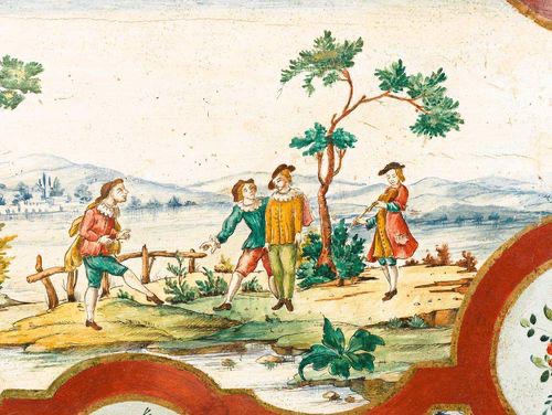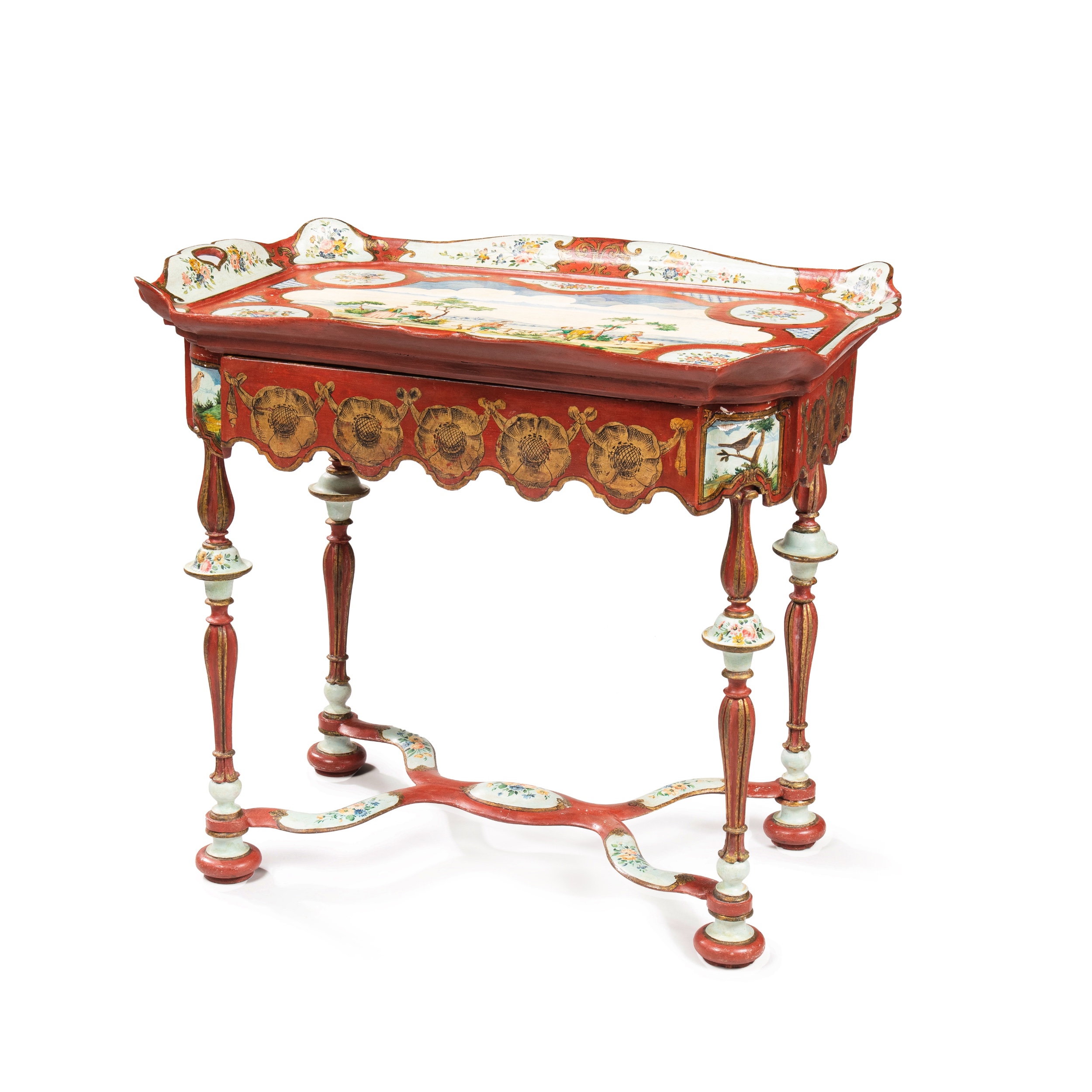 With a removable tray top painted with idealised River landscape with figurines, flowers, leaves, rosettes, and having an ornamental frieze, the legs with crimped ball feet and joined by a stretcher.