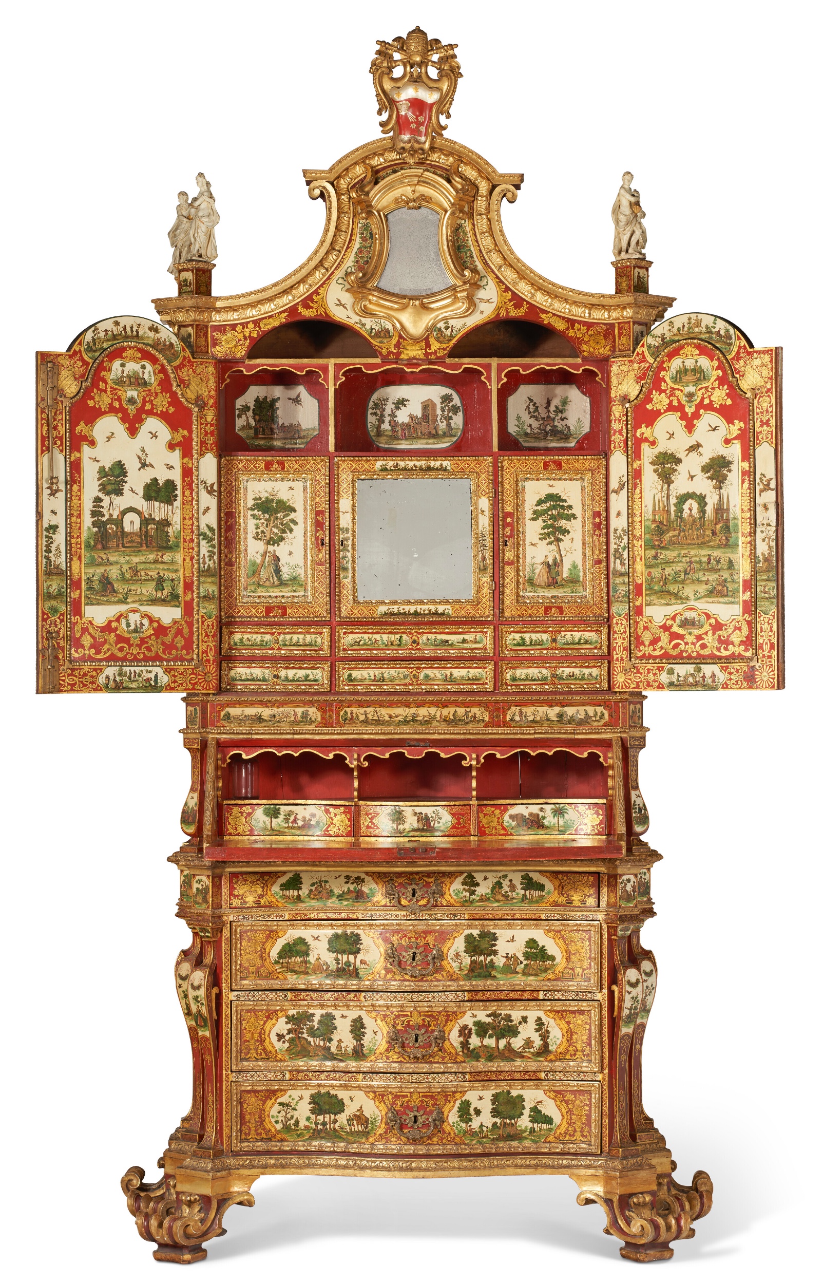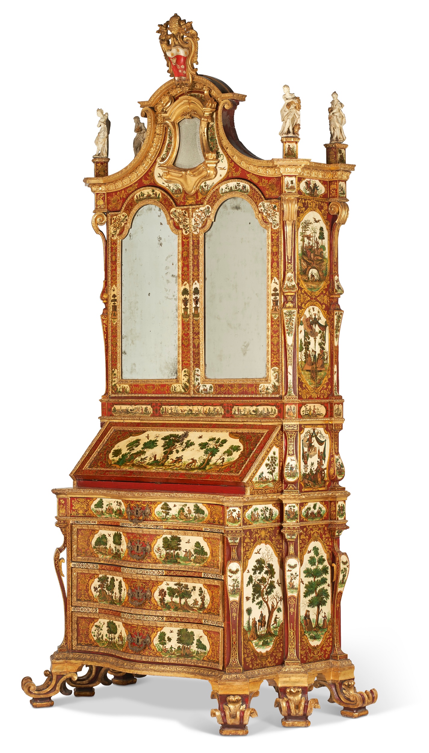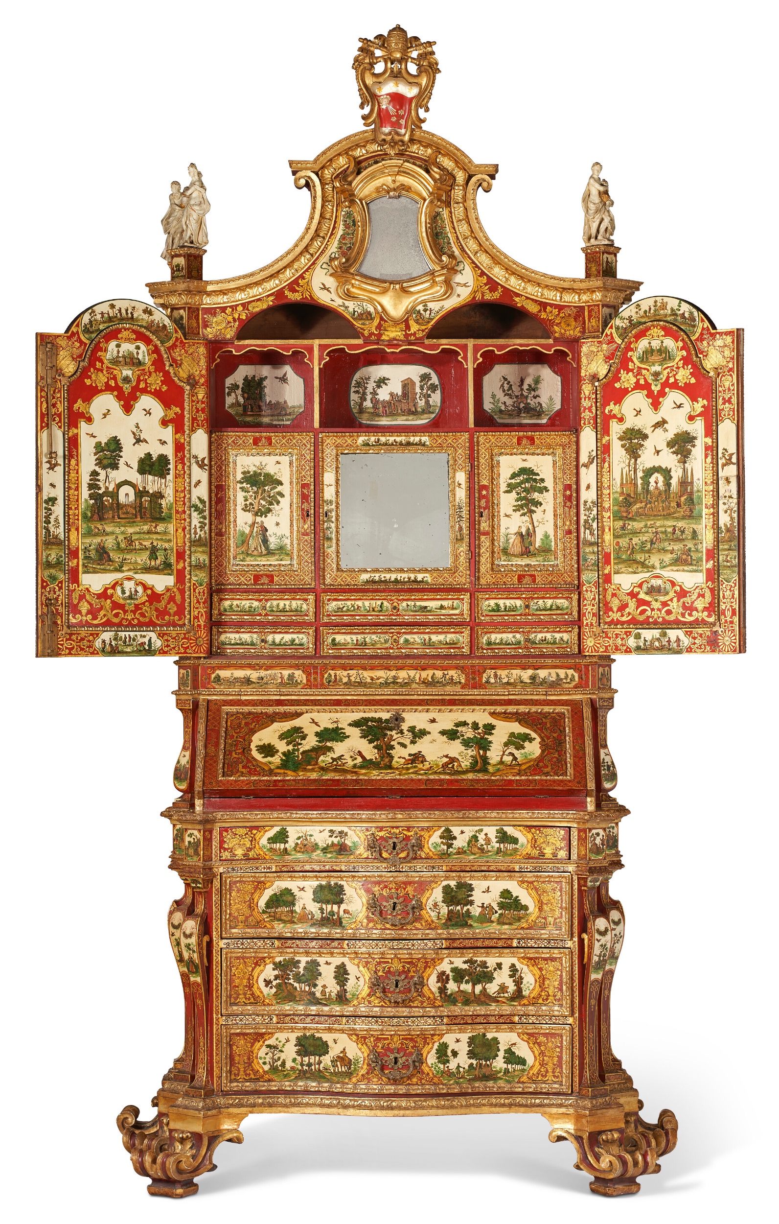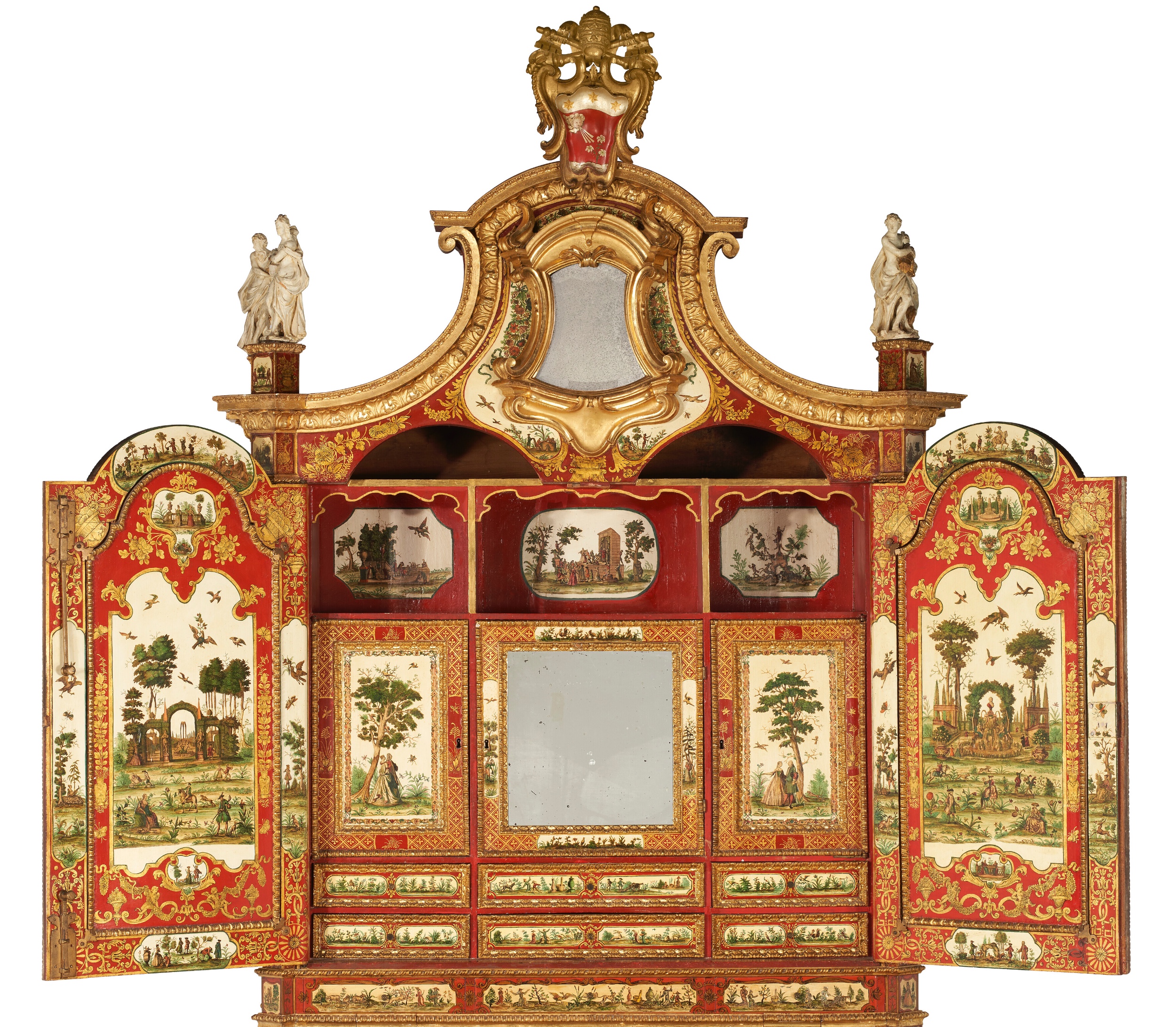 This spectacular bureau cabinet is decorated throughout with the innovative technique of cutting up polychrome-decorated prints to imitate the visual effects of lacquer, known variously as lacca povera, arte povera, or lacca contrafatta. This technique involved laying prints on a generally light colored ground, often pale blue, yellow or white, which was then covered with a specific yellowish varnish called sandracca. The interest of the sandracca was to simulate the shiny and glossy surface of Asian lacquer while attenuating the contrast of the glued printed vignettes. With time, the multiple layers of sandracca would turn slightly darker and create an intricate network of fine craquelure which can be seen under close examination. On this cabinet the printed scenes, which vary from extravagant rocailles, to hunting scenes and Watteauesque pastorales, are all set on an ivory white ground within a ruby red framework, which, combined with the highly sculptural overall form and giltwood accents, provide a tremendously rich visual scheme. In Italy, the birthplace oflacca povera, the inspiration for this type of decoration originated from the intense commercial exchanges that port cities like Venice and Genoa entertained with Asia throughout the seventeenth and eighteenth centuries, with every type of lacquered goods being imported from both Japan and China. Although Venice, with its extensive trading contacts with the East, was one of the first cities in Italy, and in Europe, to produce imitations of Asian lacquer and pioneered the manufacture of various faux lacquerwares in order to produce a more affordable version of the rare and extremely expensive oriental import, every region of Italy had its own distinctive tradition of producing japanned furniture and several centers for the production of arte povera by so-called laccatorisoon flourished in various cities to satisfy growing demand for this lacquer work. Italian imitation lacquer eventually became a substitute to not only its Asian counterpart, but it also proved more time and cost effective than the traditional lacquer work performed in other European centers such as Berlin, Dresden, and Paris.
