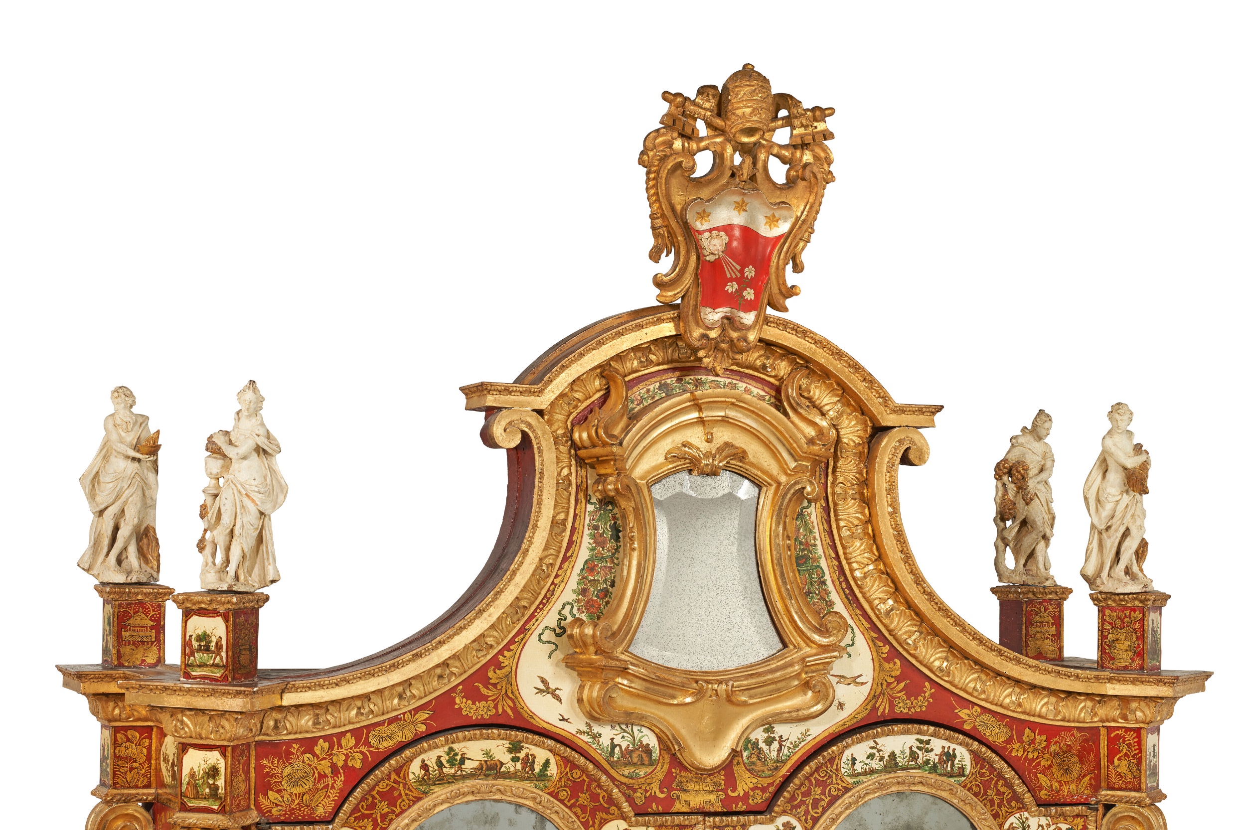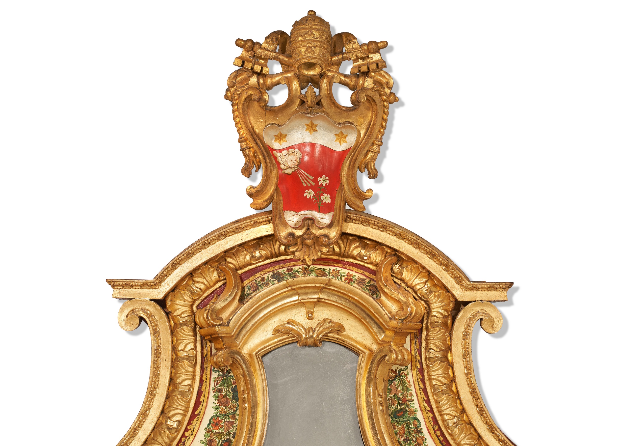 the carved details and the majesty of the overall shape make this cabinet a quintessentially Roman piece, in which the Baroque style is reflected in its truest and grandest form. These features undoubtedly destined the Getty cabinet for a lavish Roman palazzo, where it accentuated the extravagance of the interior it graced. Although the coat-of-arms finial affixed to the cresting of this cabinet is possibly associated, its carved decoration incorporating a tiara and the keys of St. Peter suggests that this lot was once part of a papal collection, and this spectacular cabinet has traditionally been associated with Pope Pius VI, who was Pope from 1775-1799 and was a member of the powerful Braschi family.