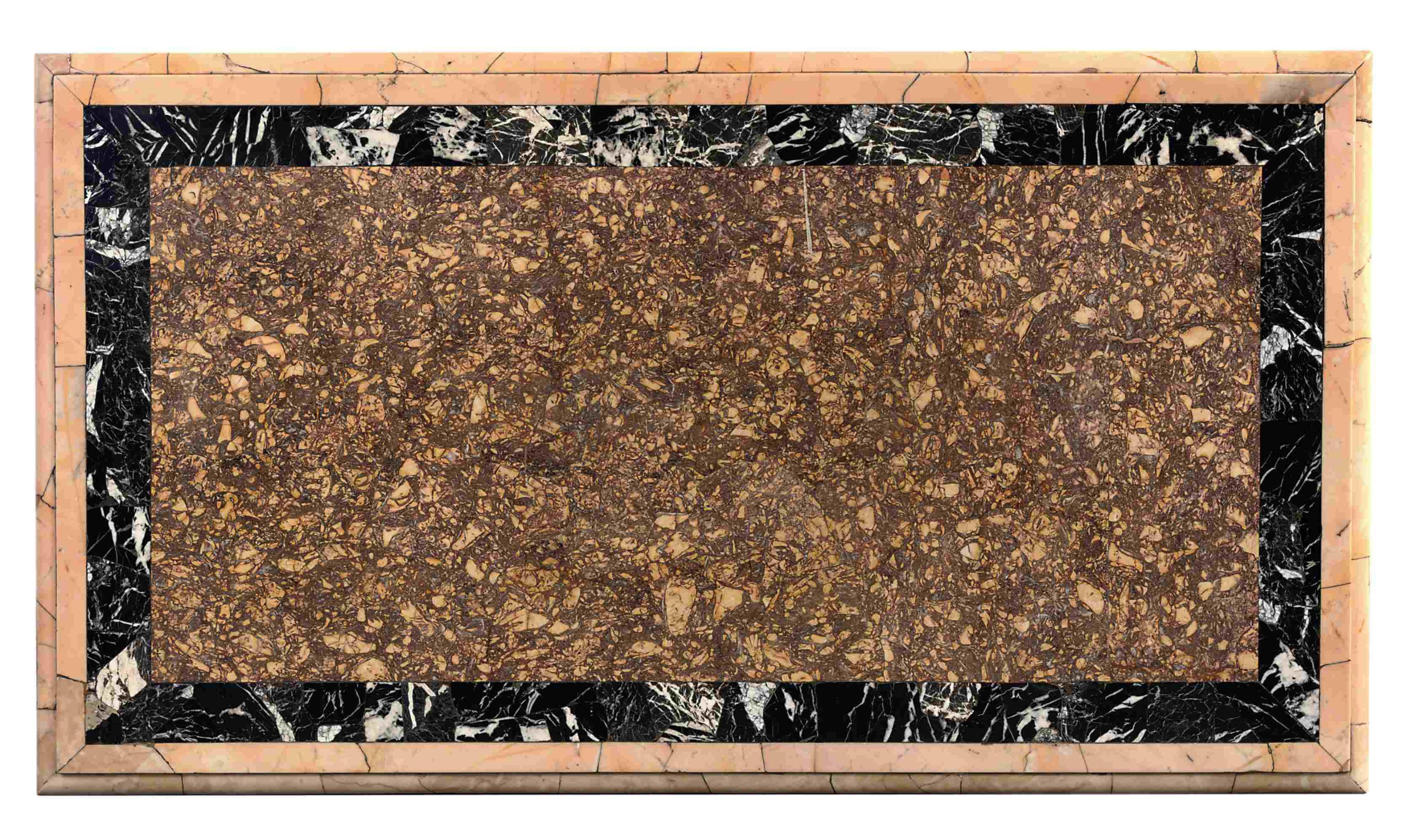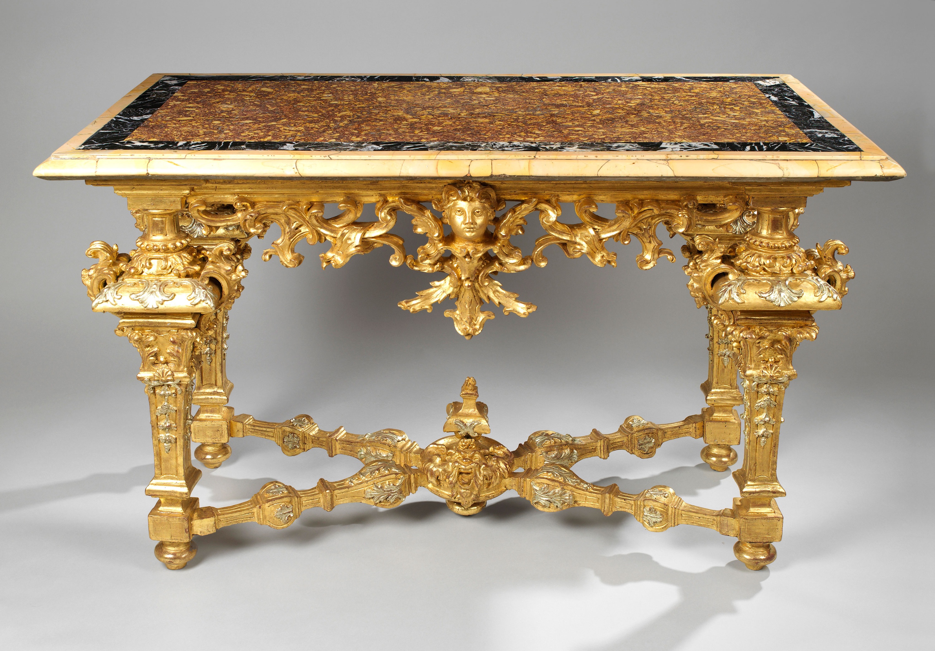 The rectangular marble top with central Spanish Brocatelle within a border of black marble, above a moulded Sienna frieze, with a pierced scrolling foliate apron centred by a female mask; on square sectioned, inverted baluster supports with beaded collar and acanthus scrolls; decorated with grotesque masks and husk trails, joined by X-shaped acanthus wrapped stretchers. These are centred by a circular platform, headed by a flaming urn similarly carved with a grotesque mask, and terminating in turned feet.