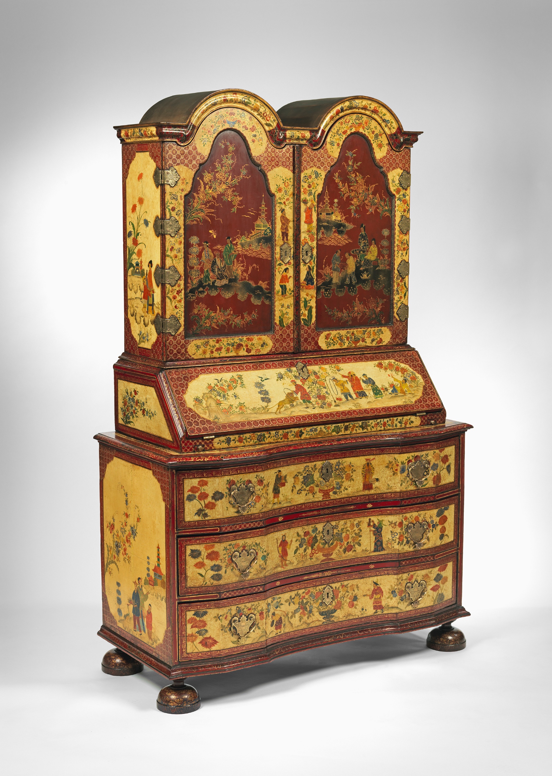 Decorated with assorted figures, animals, flowers and exotic birds, the double domed top above a pair of shaped panelled doors, enclosing a blue interior with one shelf, over a fall enclosing eight pigeon holes and one door, with lopers below, above three long drawers.