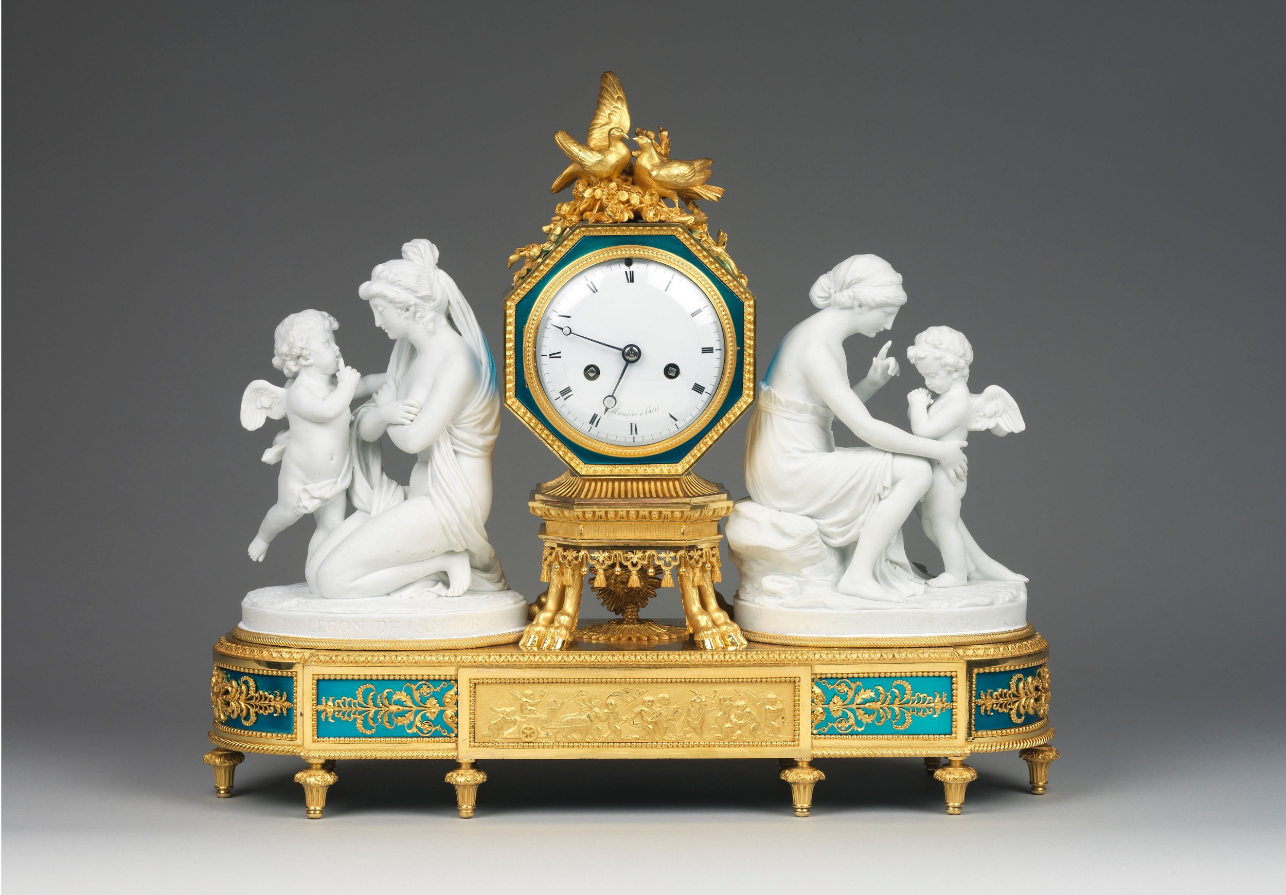 The circular white enamel dial with black Roman and Arabic chapters, inscribed Manière with striking movement contained within an octagonal case, surmounted by a pair of doves and decorated with turquoise copper panels; raised on a reeded platform, decorated with pierced tasselled pelmets and raised on double goats legs ending in hoof feet. Flanked by two Sèvres biscuit groups, each depicting Venus instructing Cupid, one inscribed Le Leçon de L’amour, the other inscribed La Leçon à L’amour; raised on a rectangular plinth base with rounded corners, centred by an ormolu frieze of putti at various pursuits, flanked by turquoise copper panels fitted with foliate rinceaux and raised on ormolu toupee feet.