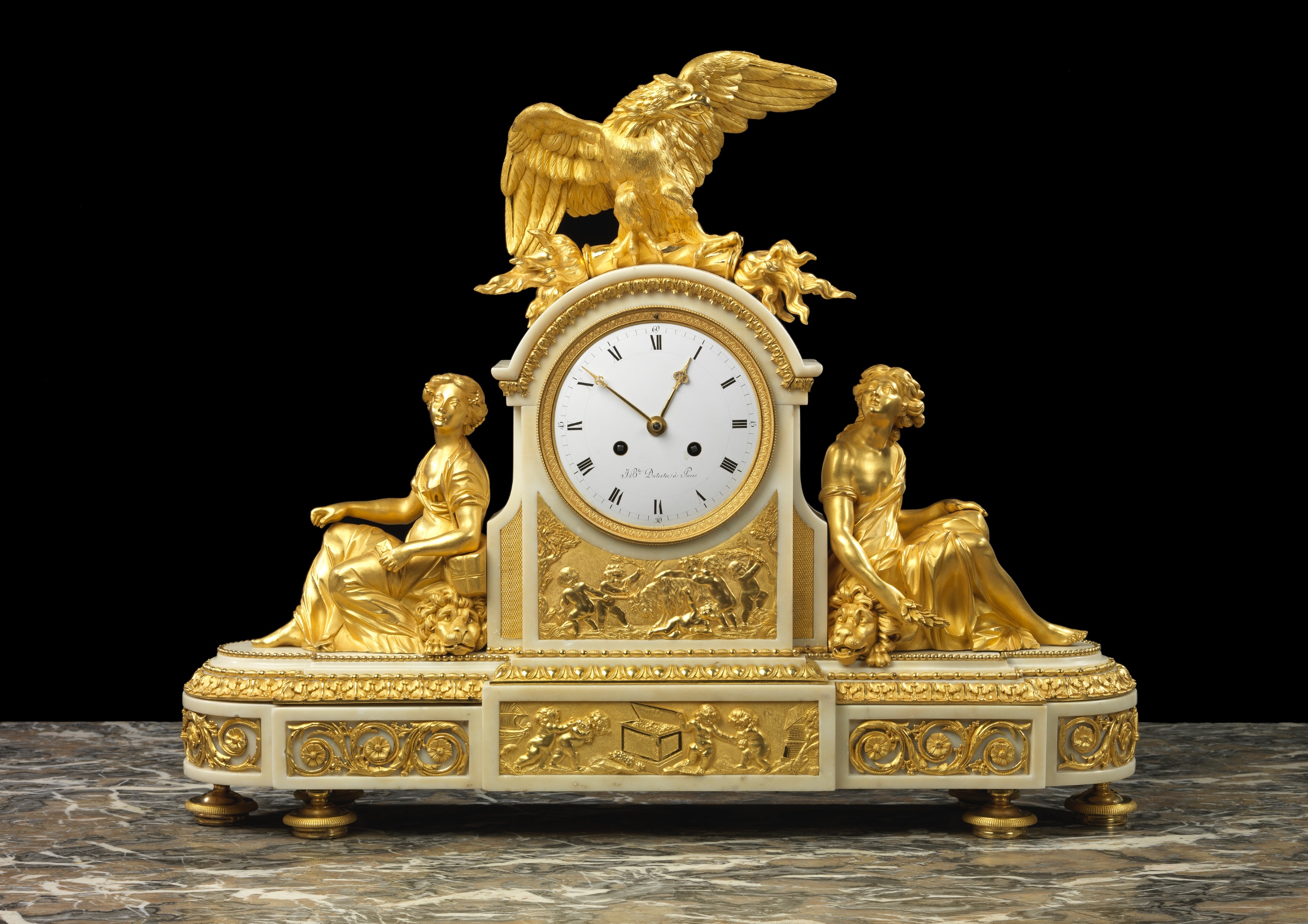 The 51⁄4-inch enamel dial signed ‘J Bte Dutertre à Paris’, the bell striking movemen,t with star cut outside count wheel, silk suspension and flat bottomed plates, and the case is surmounted by an eagle and flanked by seated female figures, the front inset with plaques depicting putti engaged in various pursuits, the bow-ended plinth with finely cast and chased foliate and scroll mounts, on knurled feet.