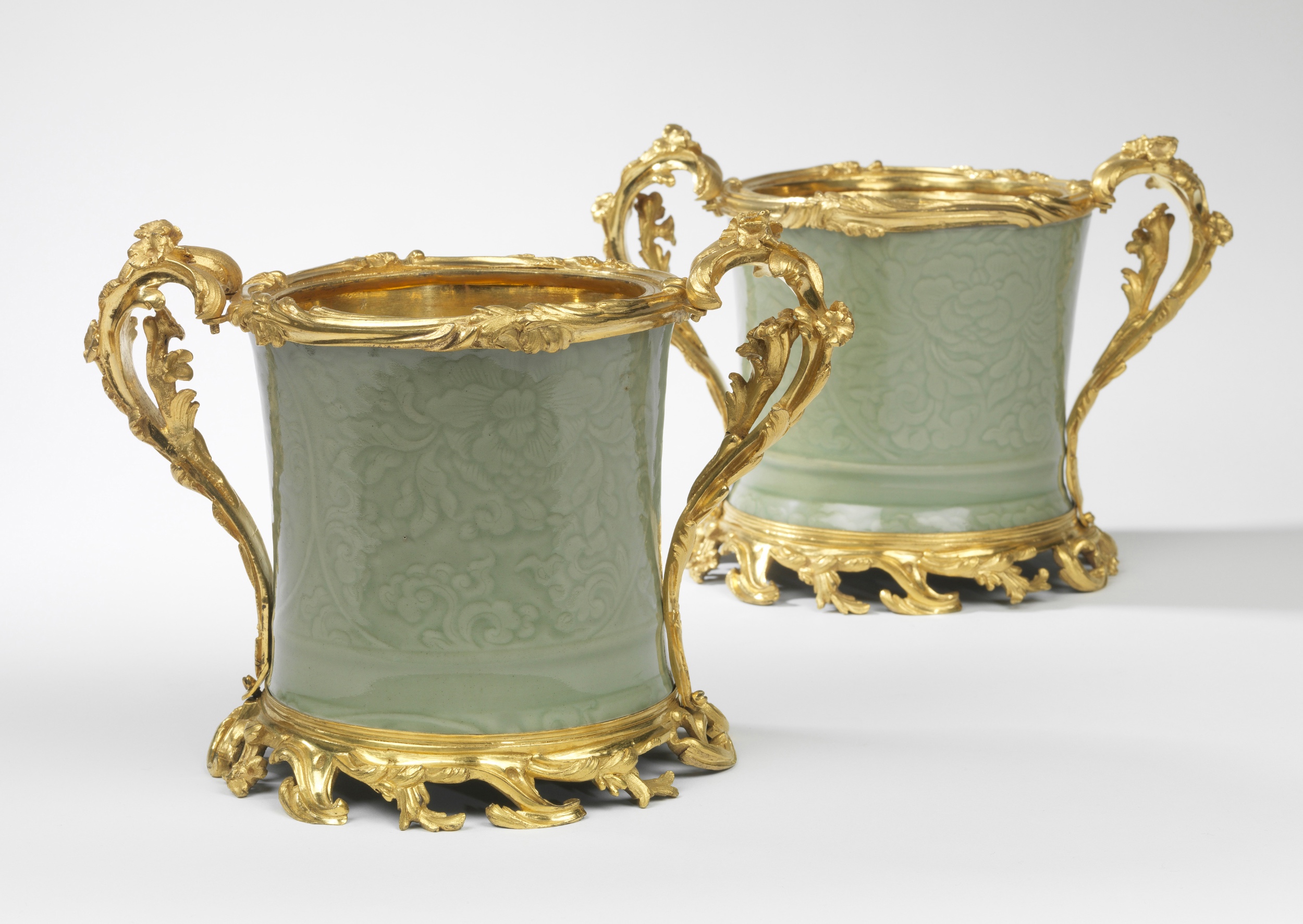 The taste for finely mounted oriental porcelain, which had already flourished during the previous decade, reached its peak in Paris in the 1750s. The marchand-mercier Lazare Duvaux (1703-1758), who worked closely with the best bronziers of the age, including Jean-Claude Duplessis (1699-1774) and Jacques Caffieri (1678-1755), frequently supplied his prestigious clientele with such vases. For instance, in December 1752 his diary registers the sale of “deux vases de porcelaine céladon ancienne, montes en bronze doré d’or molu” to Madame de Pompadour, one of his most preeminent patrons and a collector of celadon objects.
