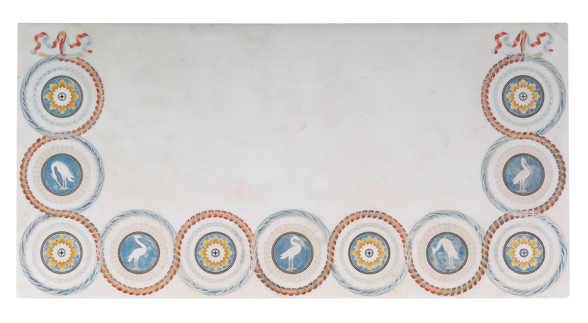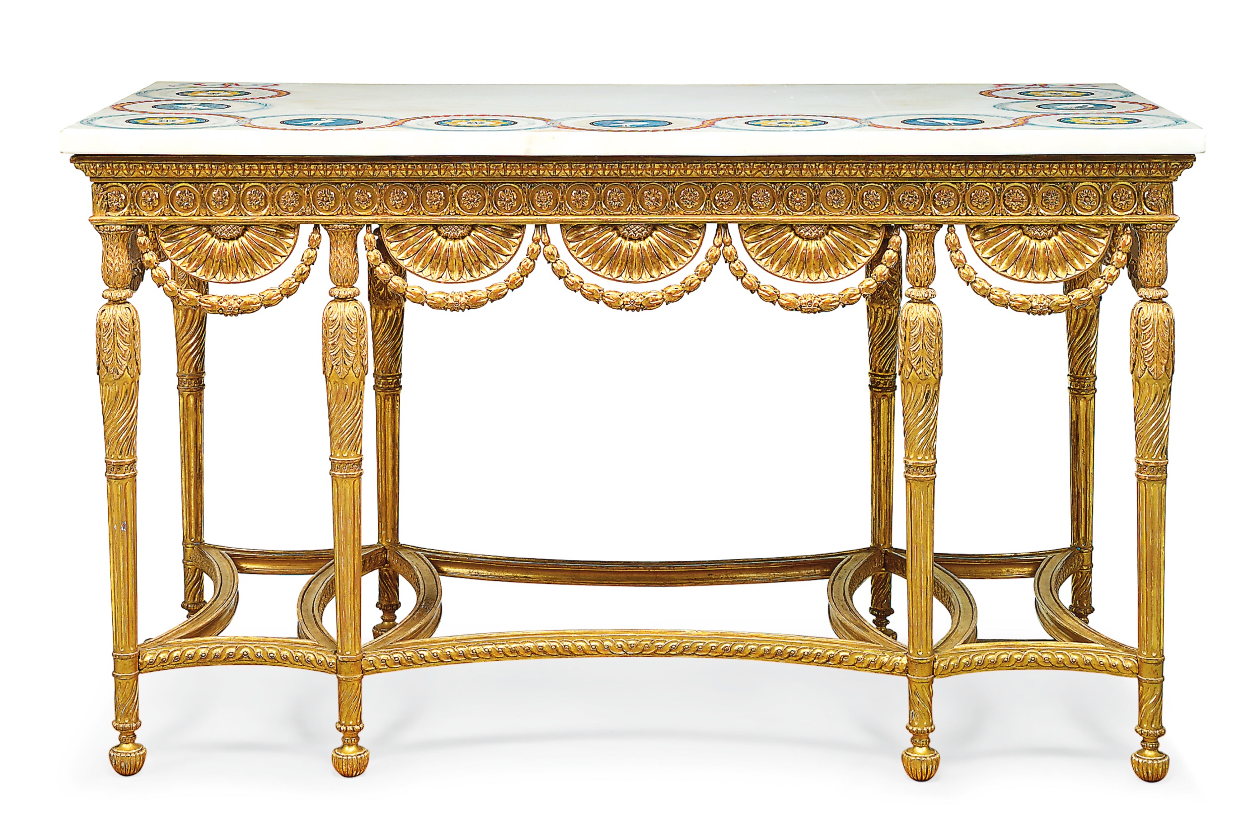 Each rectangular white marble top with a band of alternating flowerhead and crane roundels within entwined ribbon-and-leaf borders all hung from tied ribbons, with flowerhead-filled chain frieze above a half-flowerhead and laurel swag apron, replaced following the original design, on carved turned tapering part-spirally-fluted, part-fluted and acanthus-carved legs headed by tulip capitals, joined by concave-sided guilloche-carved stretchers and on spirally-fluted and reeded bun feet, re-gilt,