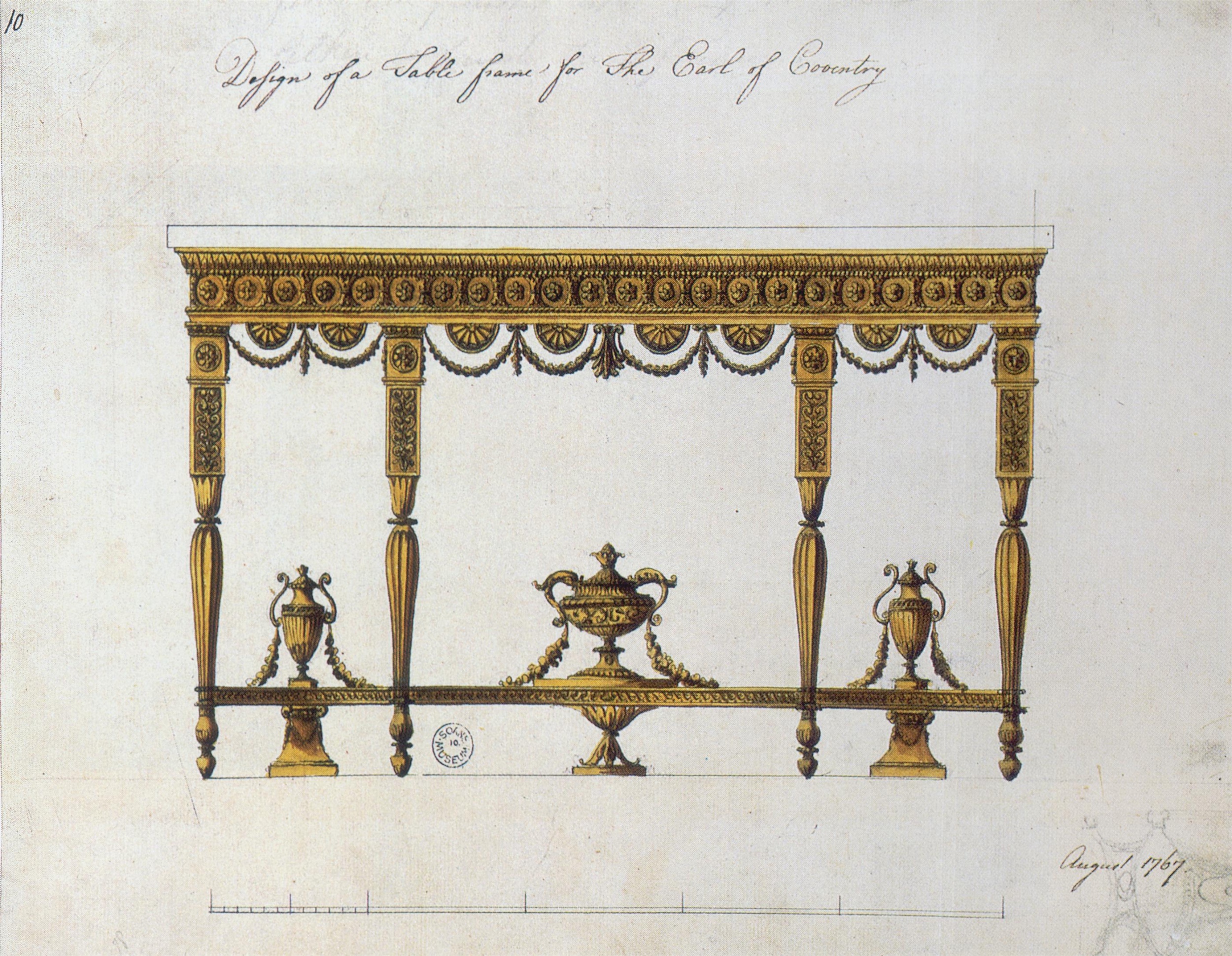 This table pattern, with paired sideboard-fashion legs, was invented by Robert Adam (d. 1792) in 1770 for Robert Child's Berkeley Square house. The design for the tables and their accompanying pier-glasses is inscribed 'Glass frame for front Drawings Room and one pair stairs at Mr Childs in Berkeley Sqr'. The design is now in the Victoria and Albert Museum (A. Rowan, Robert Adam, 1988, no. 63) and is illustrated in P. Ward-Jackson, English Furniture Designs, London, 1958, fig. 210. Evoking Apollo's triumph on Mount Parnassus, its frieze is festooned with laurel-wreathed half-sunflowers tied by a flowered ribbon-guilloche, while palms flower its strigil-fluted and antique-fluted columnar legs. Robert Child had purchased 38 Berkeley Square from the Earl of Manchester in 1767. Robert Adam's drawings for the interiors as well as for several pieces of furniture exist; however, besides the present tables, the ceiling in the front drawing room and some doors, it is not known how many of the designs featured in the drawings were executed. The ceiling was transferred to Hinton Ampner House in Hampshire, shortly before the destruction of 38 Berkeley Square and some doors are now at Buxted Park, Sussex. In order to deprive the Fane descendants of his son-in-law John Fane, 10th Earl of Westmoreland (1759-1841), who had eloped with his daughter Sarah Anne Child (1764-93), Robert Child settled his property, including Middleton Park, Oxfordshire on his granddaughter, Lady Sarah Sophia Fane, who married the Earl of Jersey in 1804. Thus Middleton passed to the Earls of Jersey, although Sarah Sophia, Lady Jersey, who died in 1867, had retained it after her husband's death in 1859. The inventory of Middleton taken after her death in 1867, records in the Dining-Room: 'Two gilt table stands with marble tops and inlaid with scagliola'. The tables were moved to Middleton shortly after her marriage when she and Lord Jersey renovated Middleton and moved much of the furniture at the Berkeley Square house there. They employed the cabinet-makers and upholders John McLean & Son to renovate the house, including supplying new furniture and repairing furniture already in their possession. A manuscript account covering the period from July 1806 to April 1807, presented by the firm of John McLean & Son, totals £4,793. 11s. 10d. The bill demonstrates that much of the furniture from Berkeley Square was crated and carried to Middleton (Simon Redburn, 'John McLean & Son', Furniture History, vol. XIV, 1978, pp. 35-7). The bill makes specific reference to a pair of tables which are undoubtedly the present pair: To a 3/4 skeleton case for packing Gilt Pier table frame and round Library table pillar, containing 74ft @ 4d...£1 4s 8d ... To a 3/4 skeleton Case for Gilt Pier Table frame 74ft @ 4d...£1 4s 8d ... Two 3/4 Close Cases for 2 inlaid marble slabs 68ft @ 6d...£1 16s 10d (Earl of Jersey Archive, London Metropolitan Archive (ACC 3752/10/302)). McLean was also employed to repair various pieces of furniture at Middleton, and one entry for the Dining Room notes that he repaired 'a pair of large elegant carved Pier Tables in burnish'd gold' - almost certainly the present tables (Redburn, op. cit., p. 36). It is possible that the original sunflower and swag ornament of Adam's design - now faithfully replaced - was damaged or lost by the time of these repairs. The colour scheme for the room was red with a 'turkey pattern floor cloth', and McLean supplied new furniture in the Regency Style including 'An elegant Mahny. Sideboard bronze figures and antique Pedestals' and 'An Egyptian Sarcofacus on Lions heads feet to correspond' (ibid.). That the 'pair of large elegant Pier tables' are in such contrast to the other new furniture and were repaired rather than supplied is further indication that they were already in the possession of the Earl and Countess of Jersey. The tables (and the McLean sideboard) are visible in the dining room at Middleton in a photograph of circa 1910 (having lost their distinctive sunflower apron ornament, which has since been replaced). In 1934, the contents of Middleton Park were sold by Hampton and Sons, and the house demolished to make way for Sir Edwin Lutyens's last great country house. They were almost certainly bought at the Middleton sale by Mrs. Audrey Pleydell-Bouverie (d. 1968), daughter of William Dodge James (d. 1907) and older sister of Edward James (1902-84) of West Dean, Sussex. Mrs. Pleydell-Bouverie installed them six years later in her new house, Julians Park, Hertfordshire. The marble tops can be attributed to John (Johan) August Richter (fl. 1767-1796), who, with Domenico and Giuseppe Bartoli (fl. 1765-1794), was among the leading scagliola-makers of the period. Richter and the Bartolis established their Great Newport Street partnership in 1766. The present tops can only have been made within the very narrow period 1765-70 - in 1765 Bartoli produced his first inlay on white marble at Burton Constable and by 1770 Robert Adam drew the first designs for a D-shaped top - after which all English and Irish scagliola tables were D-shaped. Richter patented his invention of inlaying scagliola in 1770, interestingly with specific mention to birds, however he was inferior to Bartoli in both design and execution. A comparison of the present tops and Bartoli's Burton Constable tops clarifies this attribution: the cranes/storks here are less defined than the rattlesnakes featured in Bartoli's work, and the borders here are fairly large and close to the edge of the marble itself. Nevertheless Richter was the only non-Italian to achieve any sort of competence in the art of scagliola inlay, and his work is rare. Robert Adam's design for Robert Child may also have formed the basis of a pair of pier tables executed circa 1775 by John Linnell (d. 1796) for William Drake at Shardeloes, Buckinghamshire, who was a valued client of both William (d. 1763) and John Linnell for some 25 years. The tables were cr