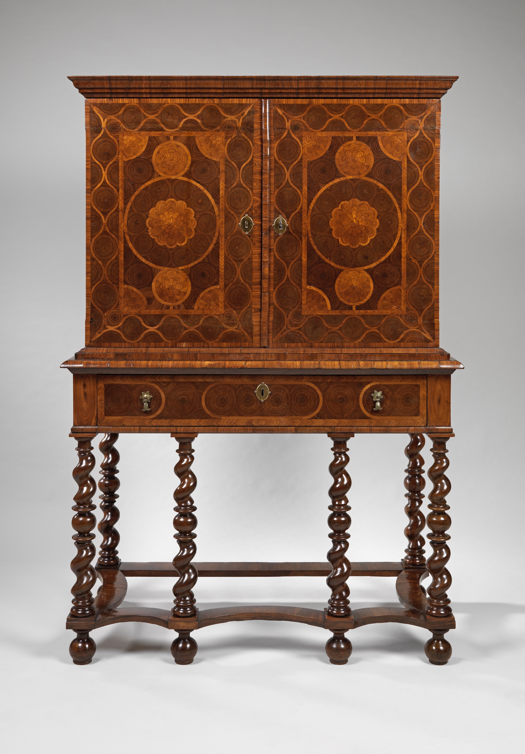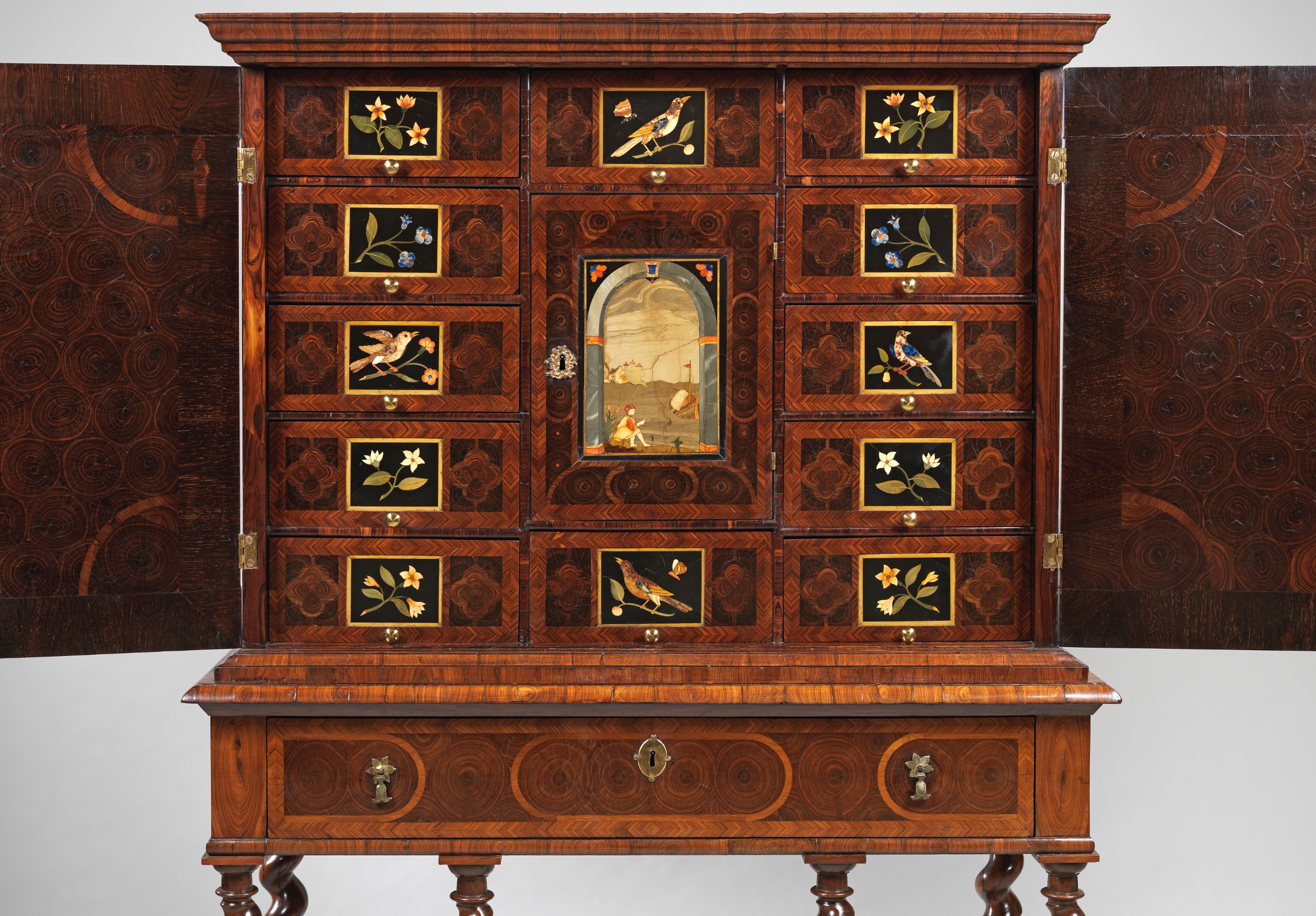 Another remarkable feature of the cabinet is the extravagant use of exotic woods. The ‘oyster’ veneers are of princes wood, so called because of its very high price. The modern name is kingwood, and it is obtained from the South American tree Dalbergia cearensis, which is indigenous to north-eastern Brazil and the Guianas. Princes wood furniture was made, as the name suggests, only for the very wealthy, and its use is characteristic of late 17th century English cabinet-making at the highest level. Even more unusual is the use of Brazilian rosewood (Dalbergia nigra) for drawer linings and for the twist-turned pillars of the stand. This wood was difficult to obtain in England at this date and is more typical of high-status French furniture; the similarities with contemporary French work extend to the veneering of the inside fronts of the drawers in the same wood. At the very least this suggests that the maker was acquainted with French cabinet-work of the highest calibre. The use of solid rosewood for the twist-turned pillars and ball feet in the stand accounts very largely for their survival unaffected by worm or rot. Finally, the lighter and narrower sections of crossbanding on the doors and other areas appear to be of padouk (probably Pterocarpus indicus), imported from Asia.