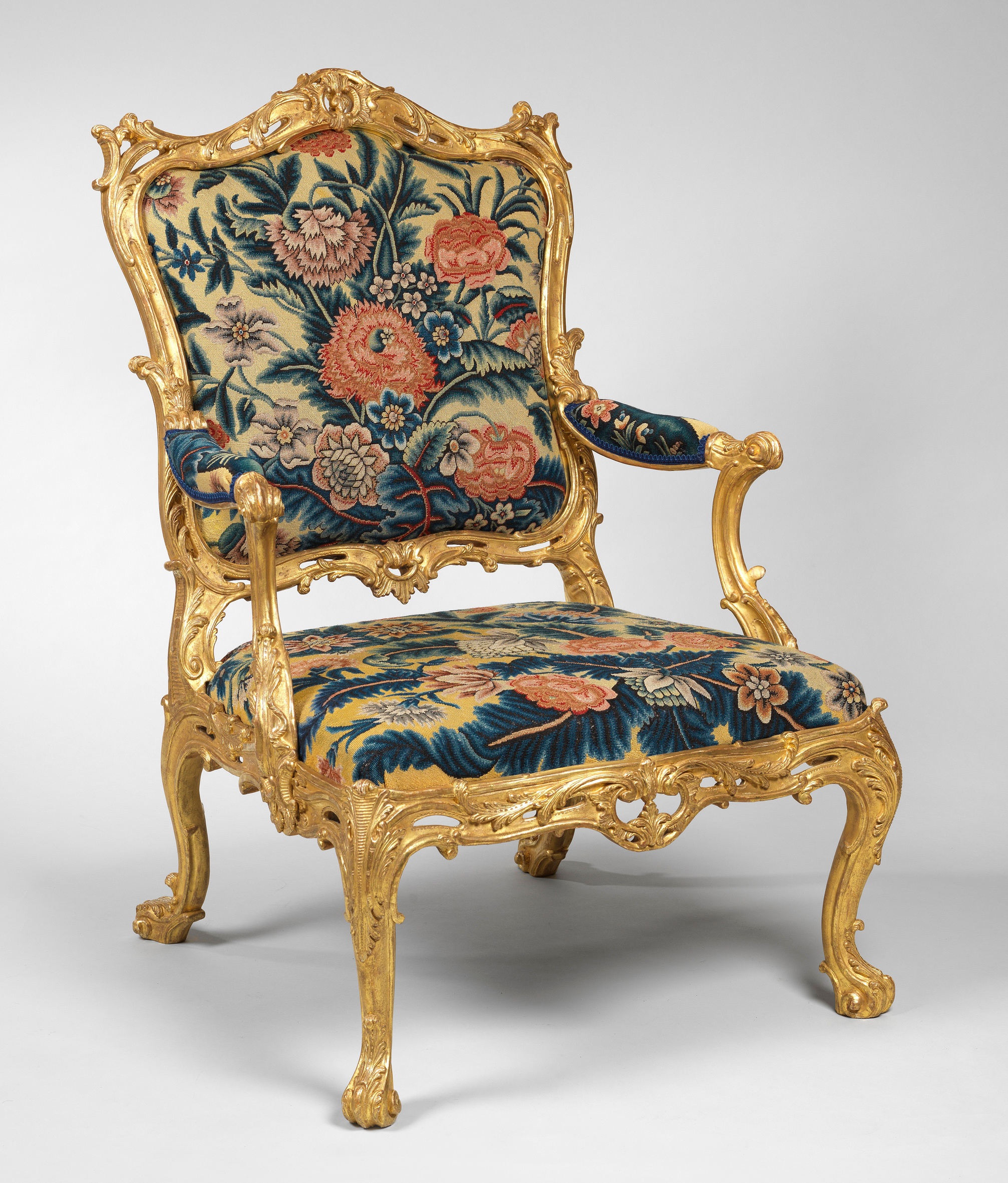 The present chairs are designed in the full rococo taste of the late 1750s and 1760s, chairs of a similar form being illustrated in contemporary pattern books such as Thomas Chippendale's The Gentleman and Cabinet-Maker's Director, published in three editions between 1754 and 1763, and The Universal System of Household Furniture, published in 1762 by William Ince and John Mayhew, where they are described as French Chairs. Gomm's manuscript design and that of the present chairs is particularly notable for its lightness, the pierced elements of the carving providing a serious challenge to the chair-maker to provide sufficient strength to the frame overall. This is certainly not indicated either in the published designs of Chippendale or Ince and Mayhew, although a manuscript design by Matthias Lock which is closely related to a surviving chair which appears in various portraits by the painter Richard Cosway, also has these features.
