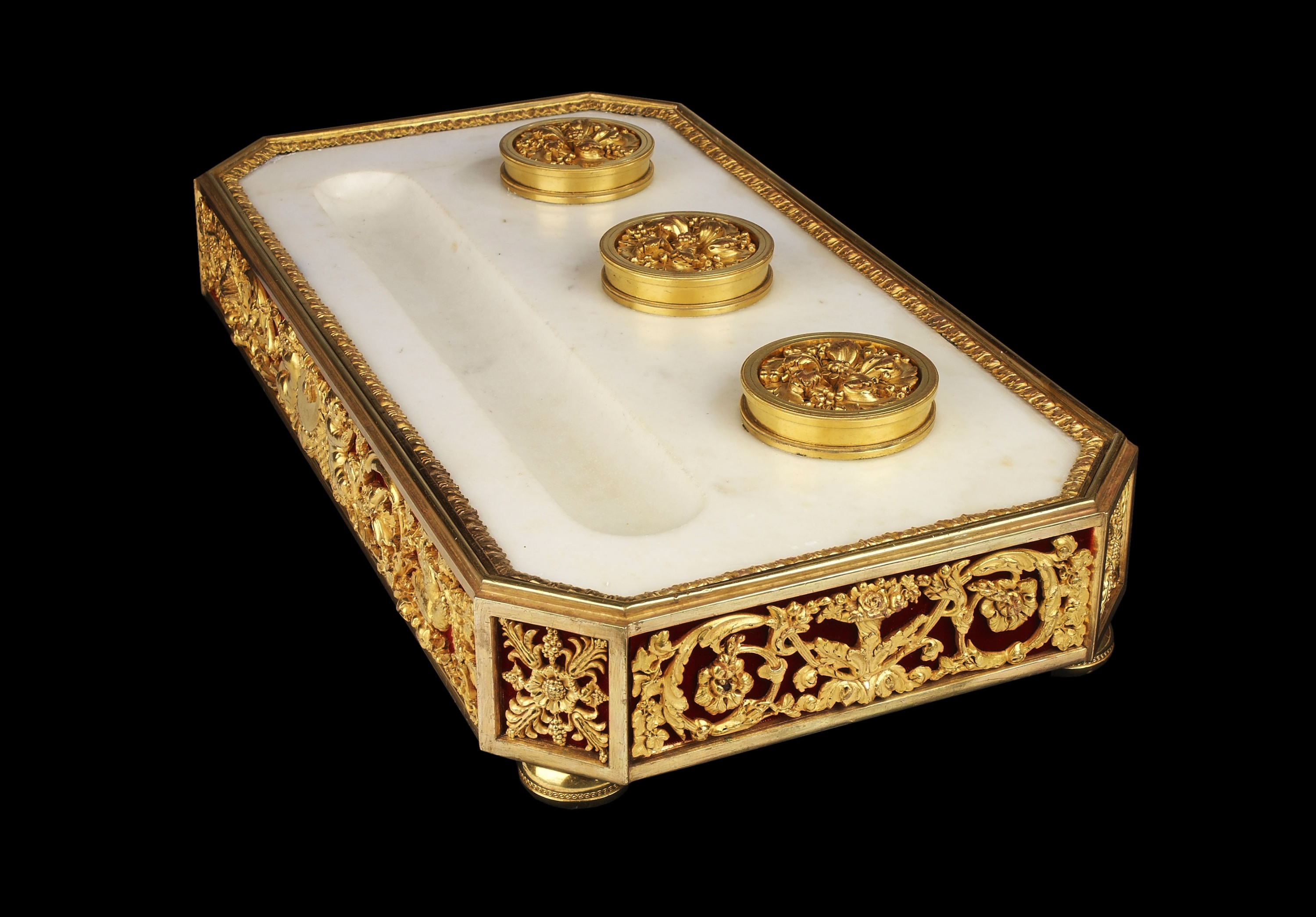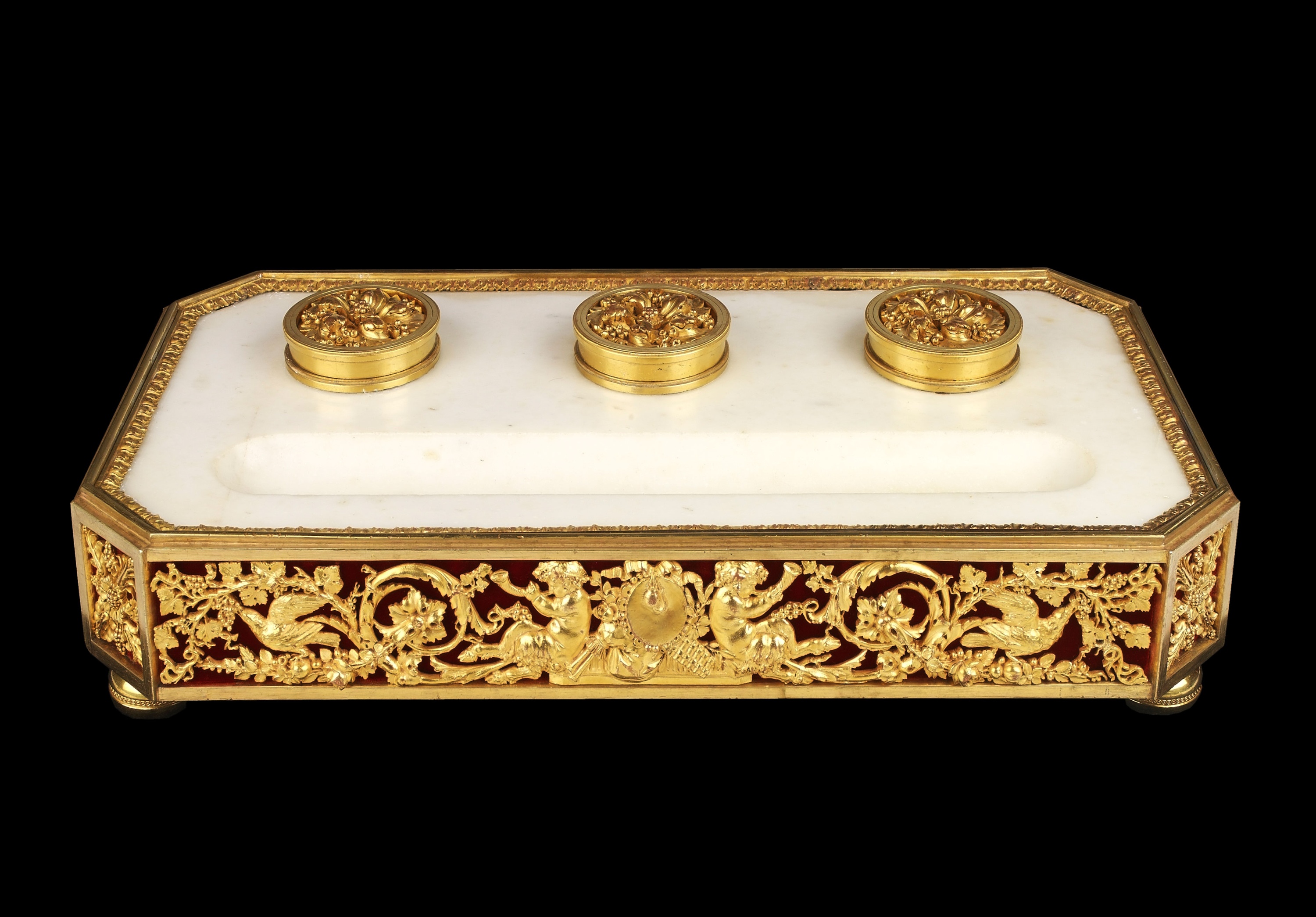 There is an identical inkstand, but 1 cm smaller both in width and height, at the J. Paul Getty Museum, illustration 187 in the Summary Catalogue of European Decorative Arts. Another identical inkstand was commissioned by Count Nikolai Sheremetev who built Ostankino, outside Moscow, between 1792-93 enlarged 1796 and 1798. He filled it with both Russian and French decorative pieces.By descent to Count P V Shermetev who gave it as a gift in 1912.