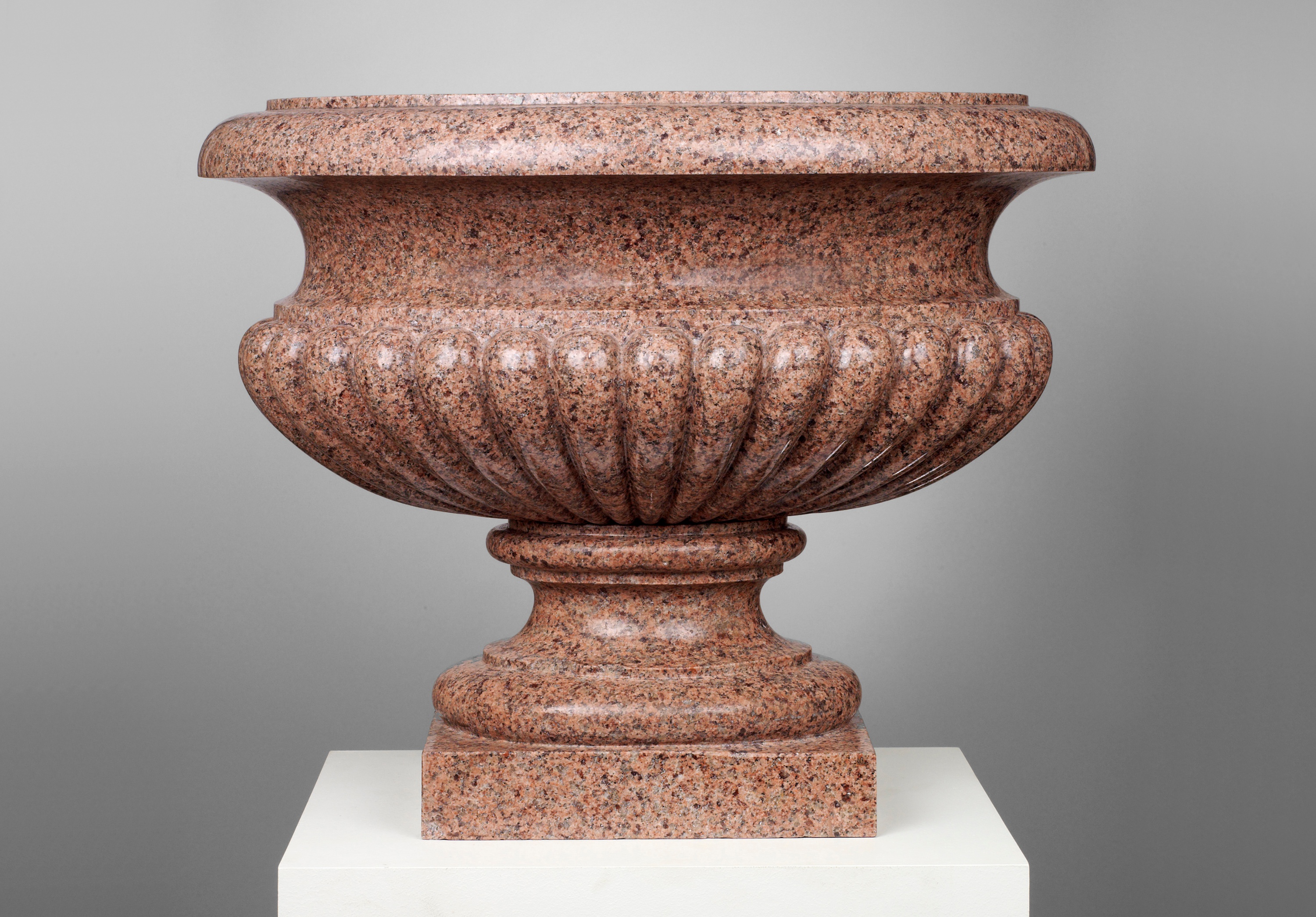 Pink granite, two-piece, jardinière, comprising of a rectangular integrated plinth or base, ovoid foot and column, with separate ovoid body or bowl with pinched neck and rolled rim. The body is finely carved in relief with ribbed details, and the whole is finely polished.