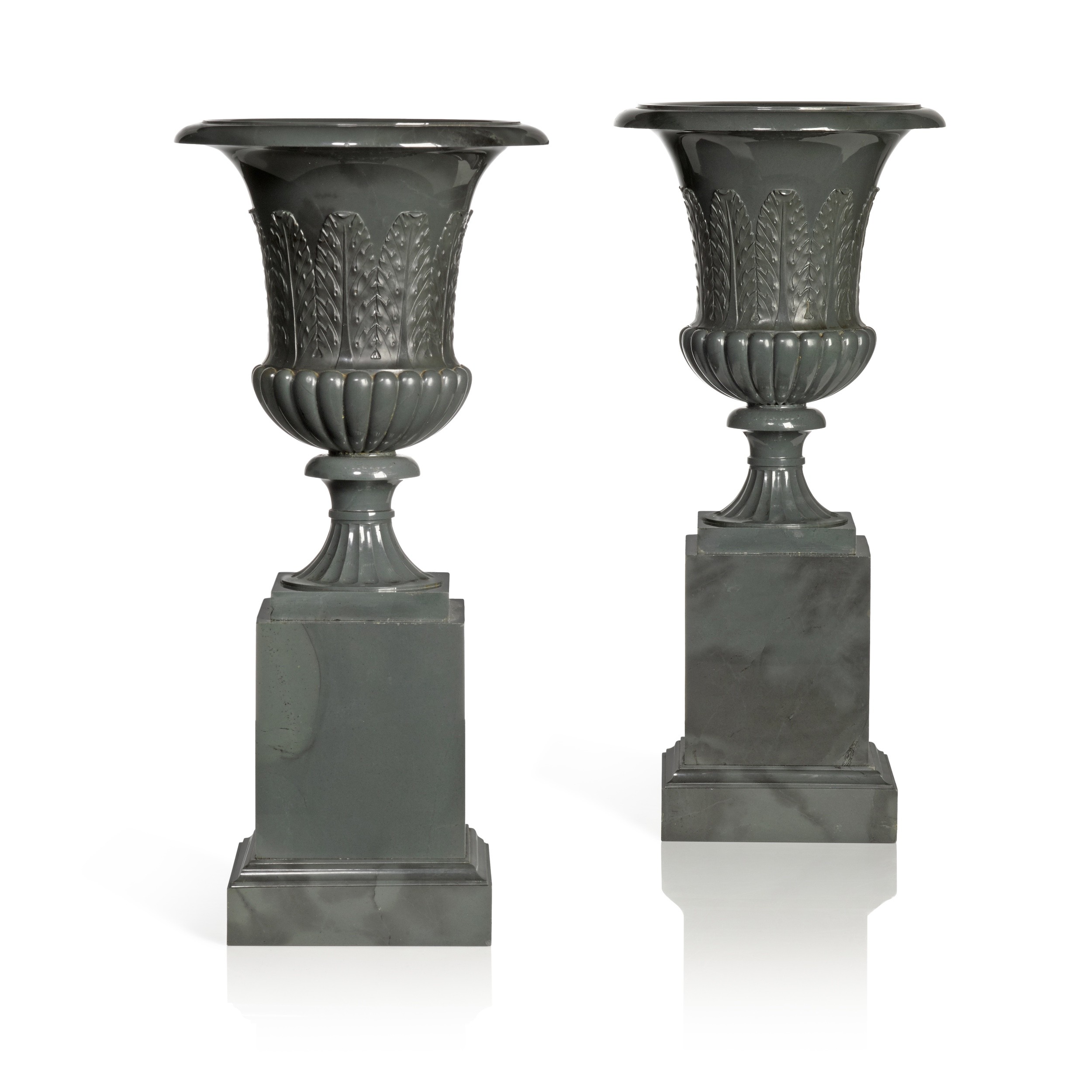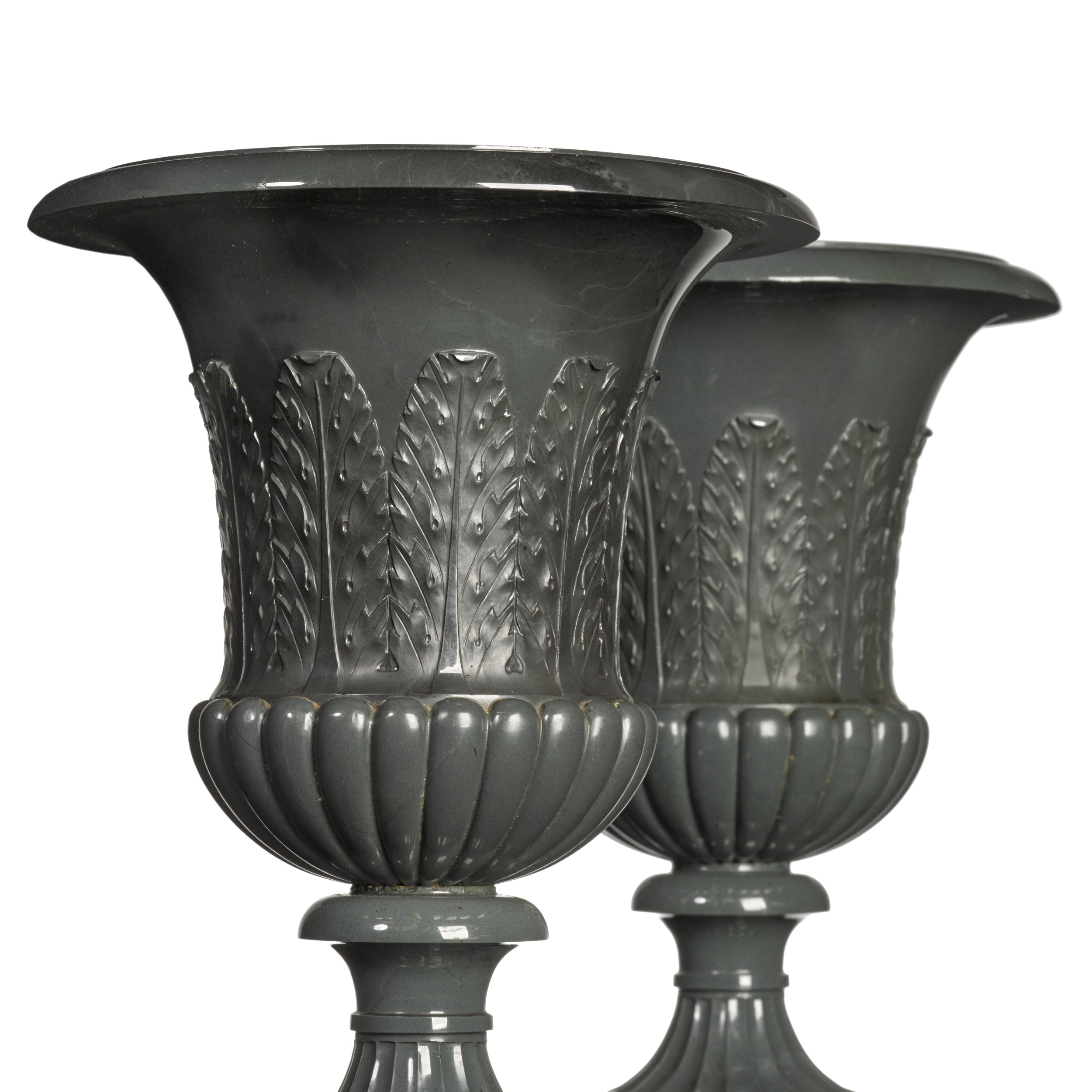 The stylish design combined with this characterful Russian hardstone - Kalgan grey jasper - results in this highly sophisticated pair, a type highly attractive to visitors in Russia in the mid-19th century. Then, many wealthy travellers completing the Northern Grand Tour, which included Russia, would be dazzled by the hardstone objects in the Hermitage and great aristocratic palaces (see for example the 95cm. high Medici vase in kalgan jasper in the collections of the State Hermitage Museum illustrated in N.M. Mavrodina, The art of Russian stone-cutters of the XVIII-XIX centuries, 2007, p.238, E 76). This large vase is designed after a much earlier drawing, from 1830 by I.I. Galberg and features handles and gadroons on the vase's rim, unlike the present. Related examples, vases in kalgan jasper and of campana shape, though with a fluted body, are in the collections of Chatsworth House (illustrated in The Duchess of Devonshire, Chatsworth: The House, 2002, p.183).