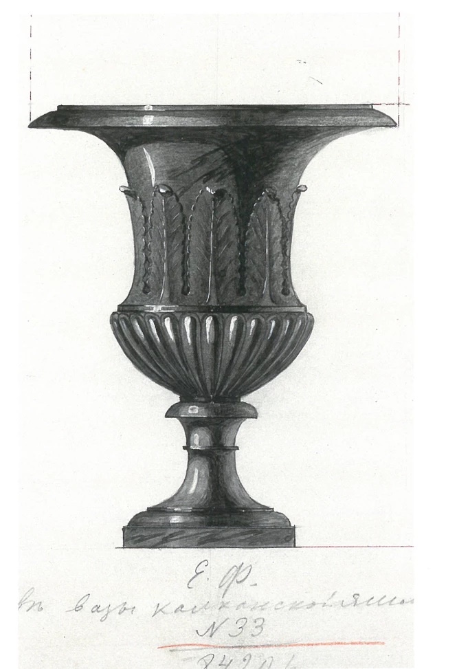 These vases closely relate to one drawing that is part of a group of 16 that the factory received in 1863, after which similar works were executed over the following years. This drawing, marked with the letter "F" (GASO, f.86, op. 1., d. 860, p. 30, illustrated in N.M. Mavrodina, Russian carved stone pieces abroad, 2019, p.112, no 243), is a design for a small Medici vase in Kalgan jasper, with gadrooned ornament on the base and one row of vertical acanthus leaves on the main body. From this 1863 drawing, two pairs of vases were created in Ekaterinburg: one in the mid 1860s and the other in the mid 1870s. According to N. M. Mavrodina, a pair of jasper vases following this design (achieved in 1875 and estimated at 4,000 roubles) along with two dishes in rhodonite (achieved in 1894 and estimated at 280 roubles) were acquired in 1905 by the King of Belgium, Leopold II. Perhaps the other pair was in the palace of the Grand Duke Vladimir Alexandrovich (N.V. Borovkov, "Works of the Yekaterinburg Cutting Factory of 1865-1878", in the University Scientific Journal, no. 16, 2015, p. 128).