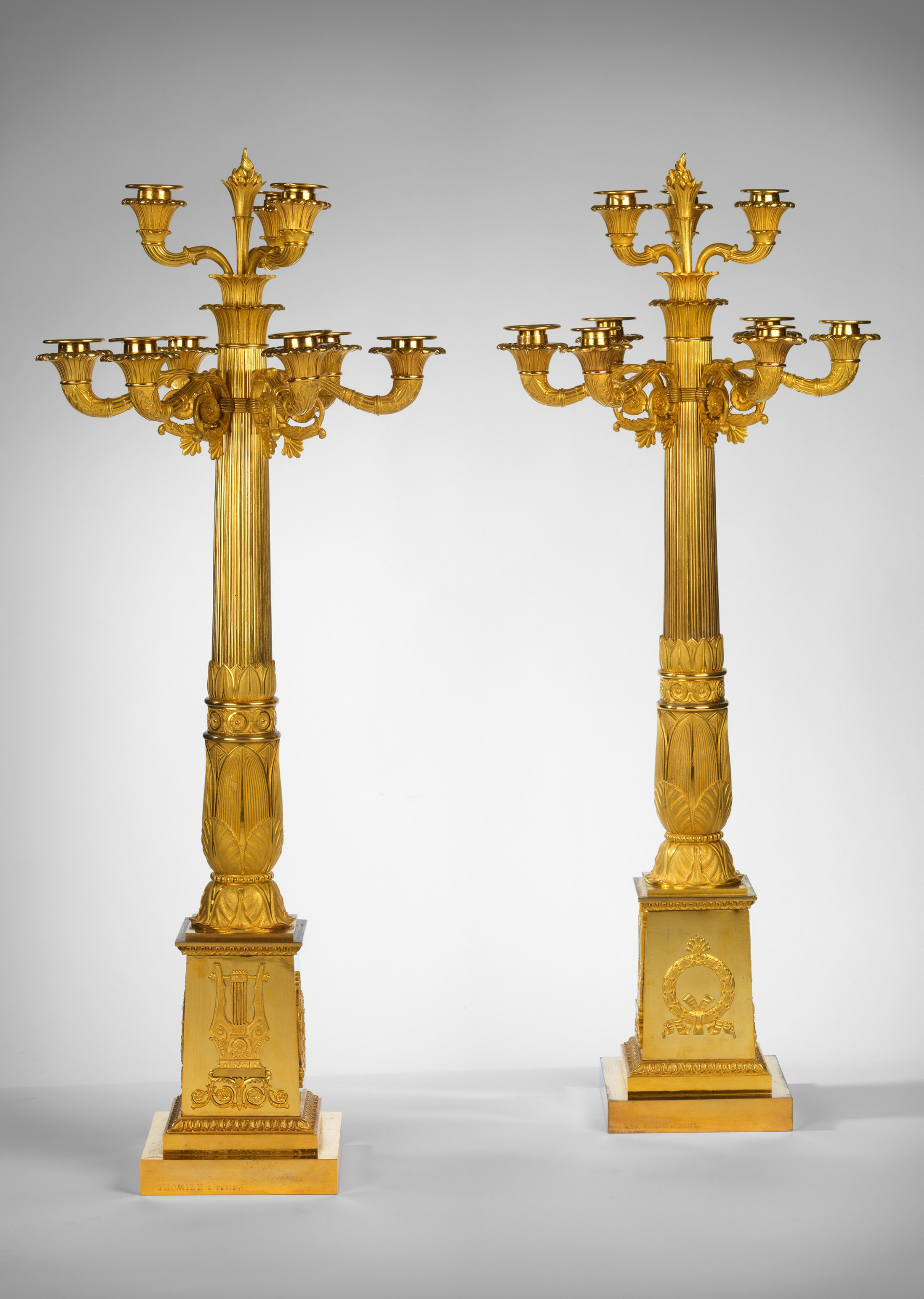 Born in 1757-1853, Thomire was the most important Parisian bronzier of the last quarter of the 18th century and the first decades of the following century. Early on in his career he worked for Pierre Gouthière, ciseleur-fondeur du roi, and toward the mid-1770s began working with Louis Prieur. He later became one of the bronziers attached to the Manufacture Royale de Sèvres, creating the bronze mounts for most of the important creations of the day. After the French Revolution, he purchased the stock of Martin-Eloi Lignereux, thus becoming the most important supplier of furniture bronzes for châteaux and Imperial Palaces. In addition, he worked for a wealthy private clientele, both French and foreign, including several of Napoleon’s marshals. Thomire retired in 1823.