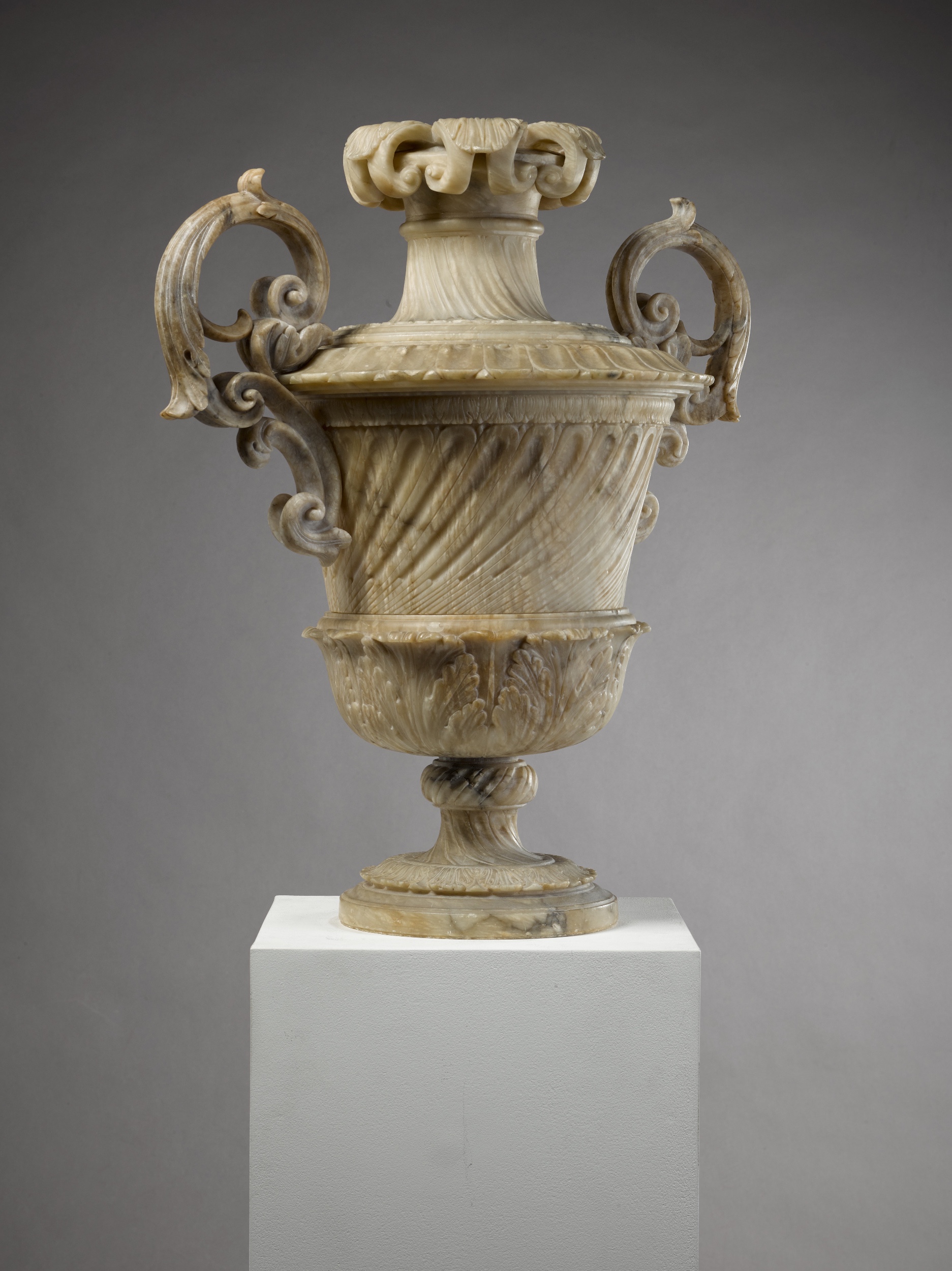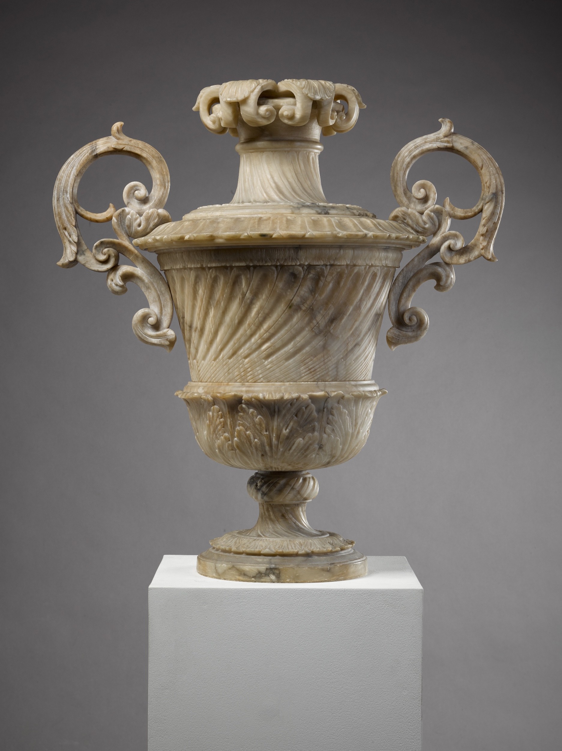 Both these vases and that at Racconigi seem to be part of a group of similarly carved alabaster vases celebrated for the virtuosity of their designs and discussed in Alvar Gonzàlez-Palacios, Arredi e Ornamenti alla Corte di Roma, 2004, pp.110-111. Another vase is recorded at Palazzo Corsini alla Lungara, Rome, though the photograph is not clear, it displays a vase with similar handles. Two other vases sharing similar qualities were sold from the Castello di Uggiano, Florence, at Sotheby's, Milan, 19-20 March 1997, lots 381 and 382.