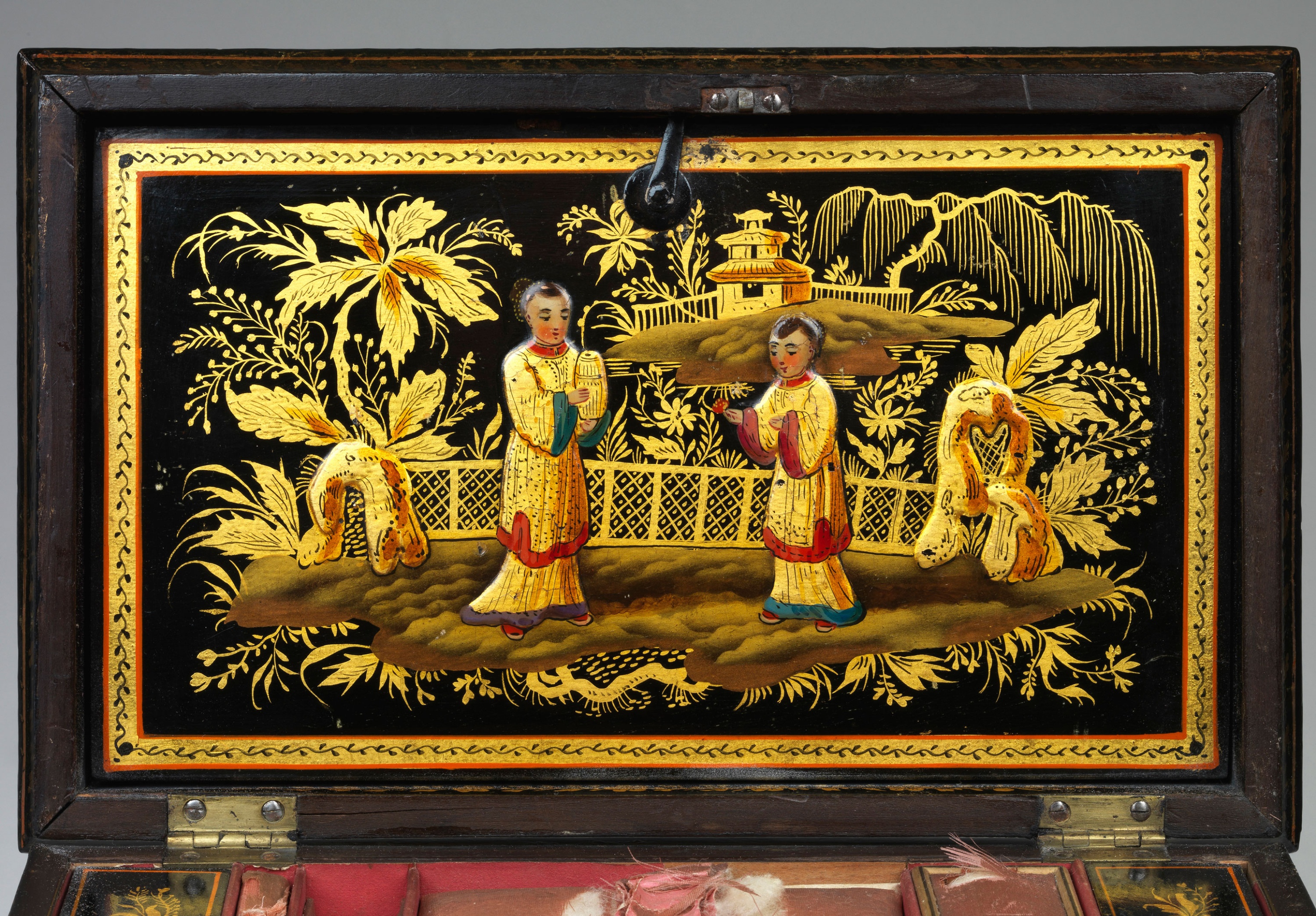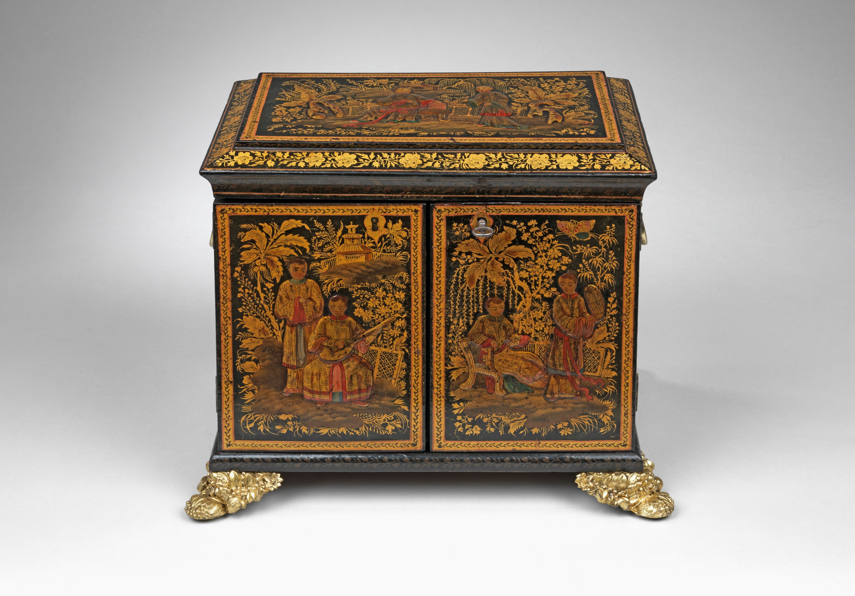 The Japanned miniature cabinet, the top having a moulded edge gilded with floral design, bordering a decorated panel with gold on black ground with Chinese figures, landscapes, buildings and trees, floral sprays and buildings and set with a wide gilded border; opening to reveal a fitted interior above double doors with similar decoration. The doors open to reveal a bank of two small single drawers and two larger ones, all with handles and each being lined with original peacock blue paper. The cabinet rests on ornate brass feet; the sides comprising similar decorated panels with brass handles.