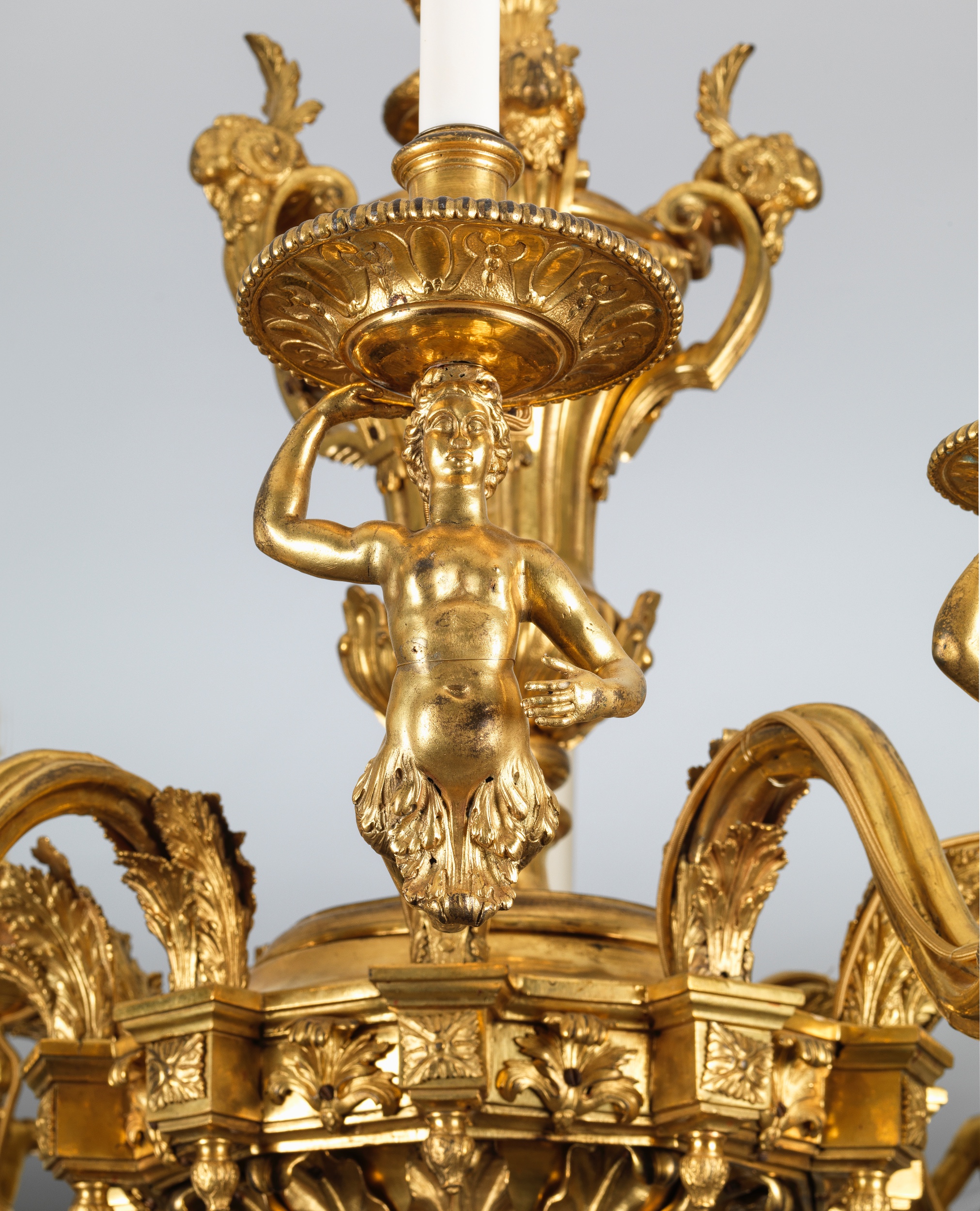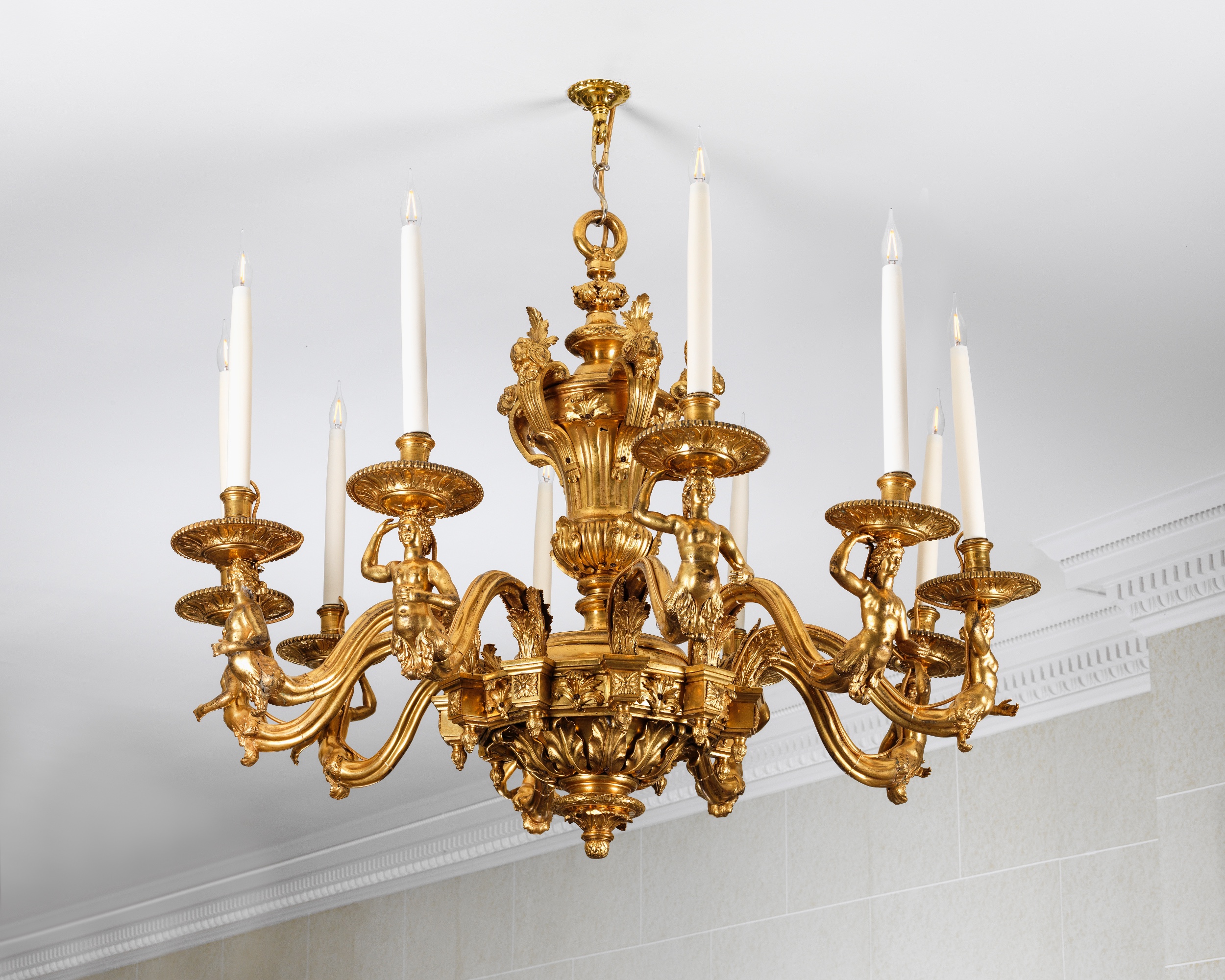Designed in the Louis XIV 'antique' manner, with its gadrooned and acanthus-wrapped vase stem, rams' head masks and remarkable arms in the form of female caryatids, this remarkable and rare chandelier is inspired by the designs of the influential ornemanistes Jean Bérain (1640-1711) and Daniel Marot (1661-1752). Designs for related chandeliers by Bérain, who was appointed dessinateur de la chambre et du cabinet du roi to King Louis XIV in 1674, appear in a series of engravings published in 1690- one in particular featuring female caryatid arms (illustrated in H. Ottomeyer and P. Pröschel, Vergoldete Bronzen, Munich, 1986, vol. I, p. 56, fig. 1.7.1), while a console design by Marot, with caryatid supports emerging from very similar lush acanthus, is illustrated in T.A. Strange, An Historical Guide to French Interiors, Furniture, Decoration, London, 1903, p. 132. Further designs by Bérain feature fluted and gadrooned vases of similar form to the central stem of the chandelier offered here (see Ottomeyer/ Pröschel op. cit., p. 48, fig. 1.5.1).