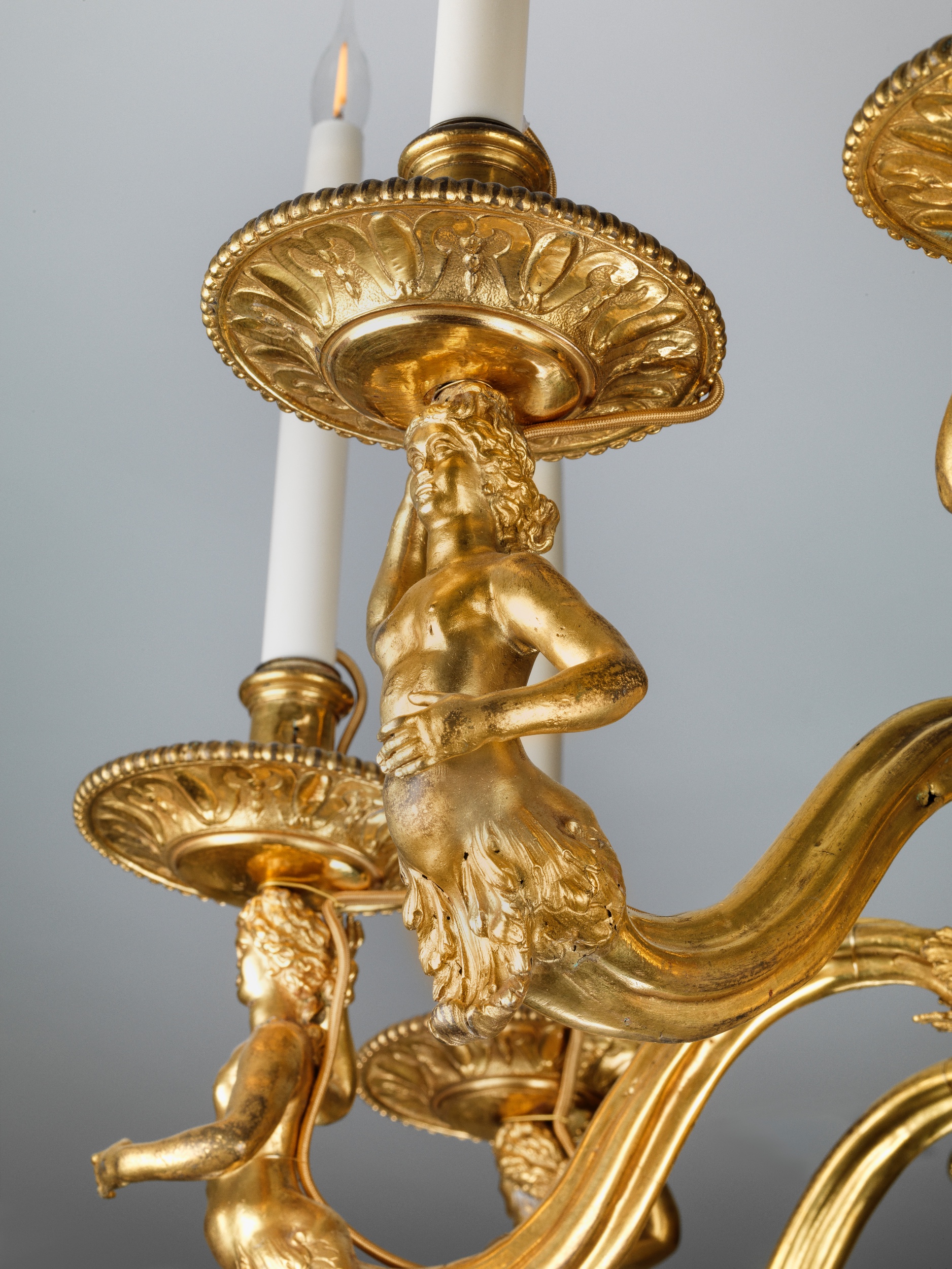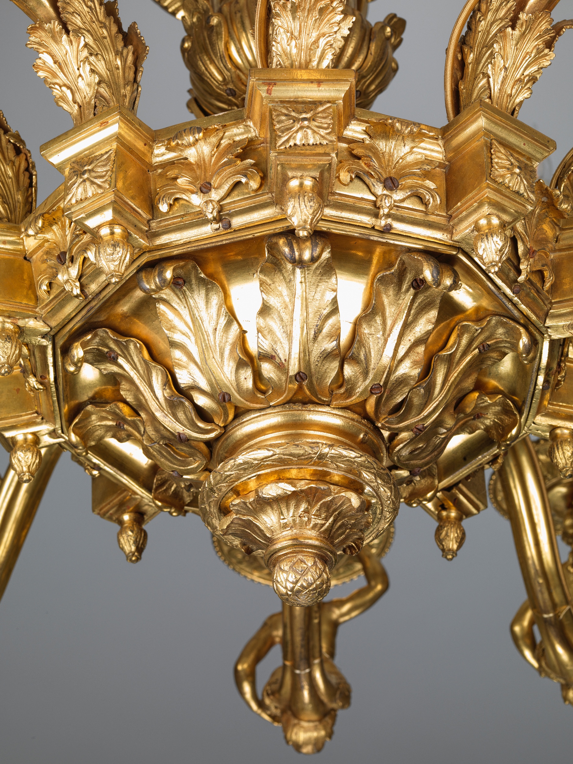 The overall form of this chandelier and several of the ornamental details, particular the volutes capped by ram’s masks wrapping the central urn and the faceted outline of the lower part of the stem, all feature in a series of chandeliers attributed to the celebrated cabinet-maker André-Charles Boulle (1641-1732), who was made ébéniste, ciseleur, doreur et sculpteur du roi to Louis XIV in 1672 ( see Ottomeyer/ Pröschel op. cit.,pp. 52-5). His privileged position allowed him to produce works in gilt-bronze, such as chandeliers, wall-lights and mounts for his own furniture, exempting him from the strict guild rules separating the various métiers and indeed some of his finest creations were in gilt bronze.