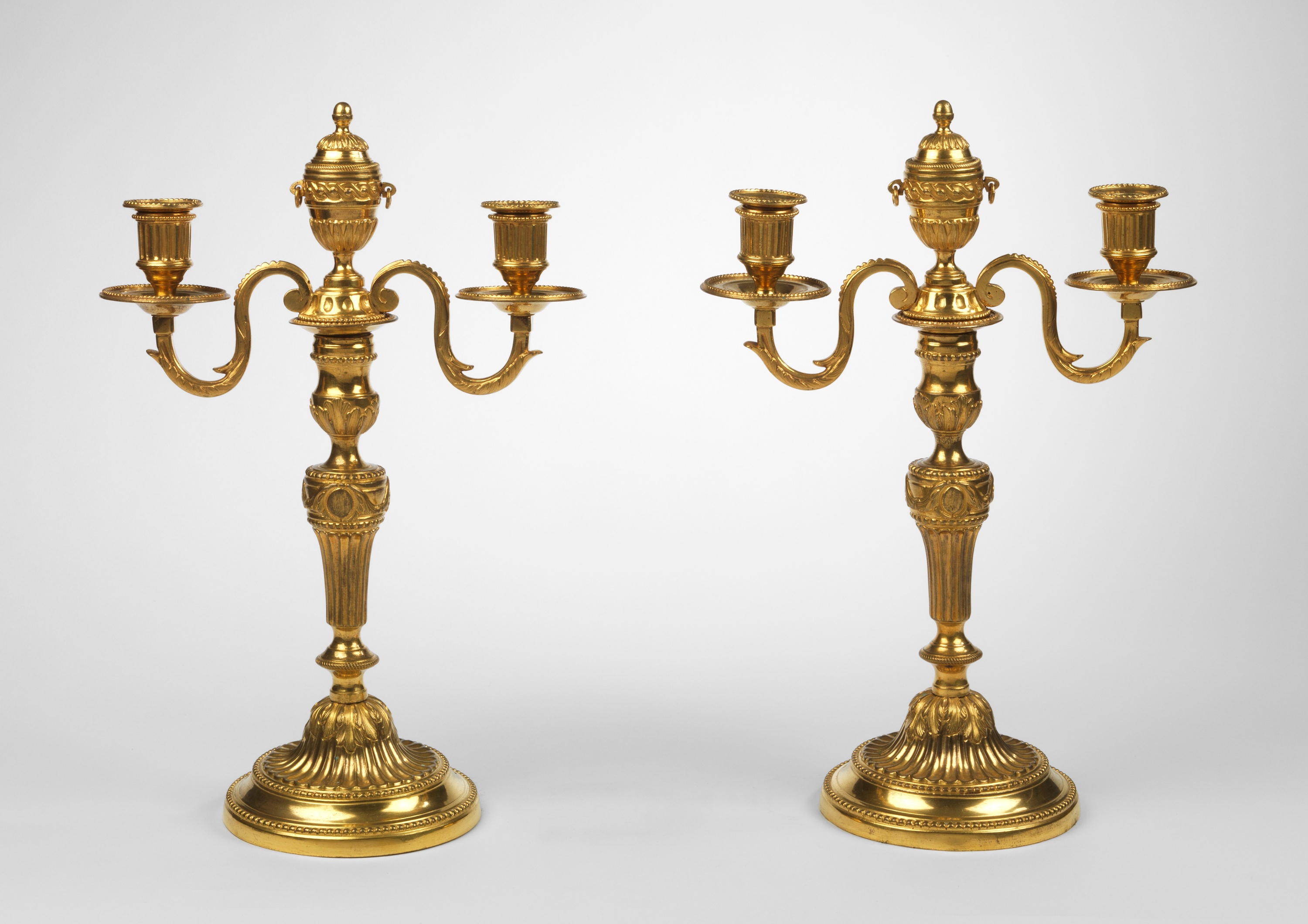 The acanthus asymmetric scrolling arms, with reeded nozzles and detachable beaded drip pans above beeded, circular collars; surmounted by a central carved and decorated pedestal urn with cone finial and circular handles; the fluted and acanthus decorated stem, with a central collar of scrolling decorated medallions; on reeded amd acanthus circular bases.