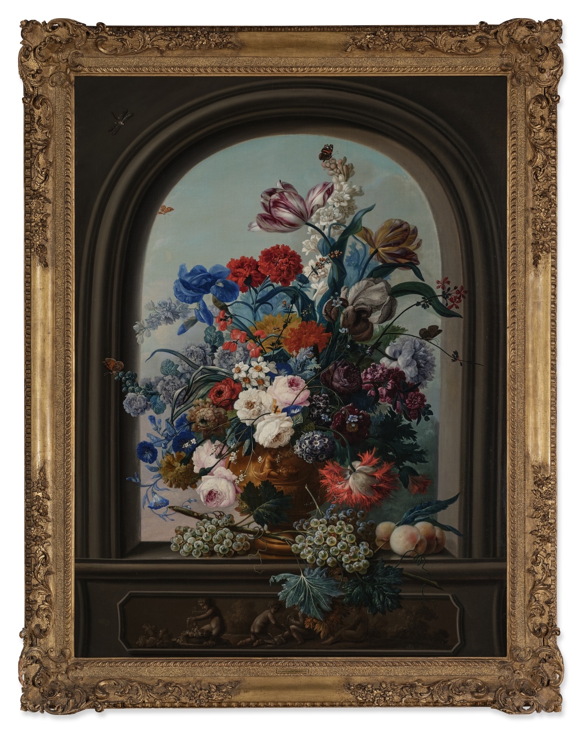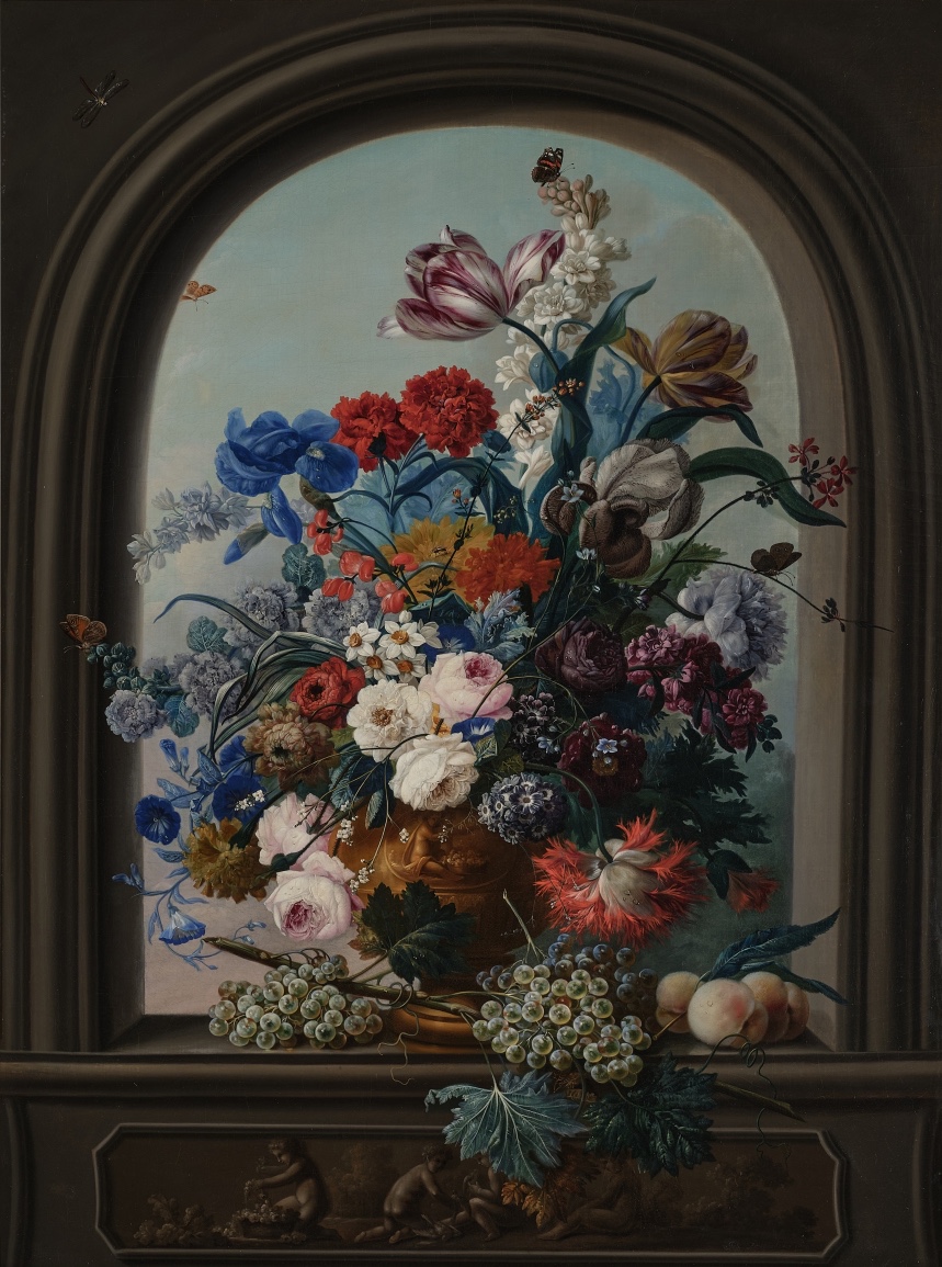 Drechsler’s distinctive crisp palette immediately singles him out from his contemporary Dutch and Flemish artists who were working in the tradition of Van Huysum. His individual colours are brilliant and intense. His use of these vivid colours, particularly of shades of purple, red and blue, and the minute detail of his work, so clearly visible in this painting, is founded in his early training as a porcelain painter.
